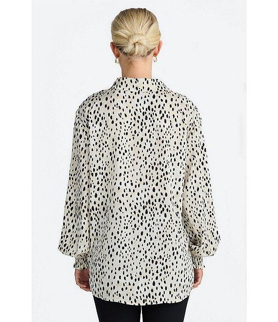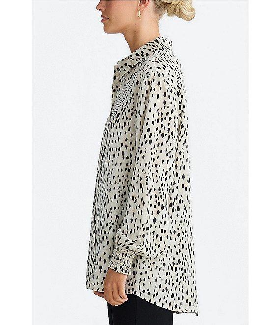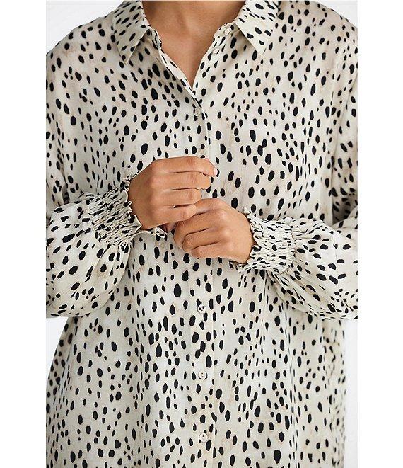 From Brave + True, this shirt features: Satin fabrication Printed Collared Long sleeve with shirred cuffs Button front closure Approx. 28" in length Polyester Hand wash cold Imported.