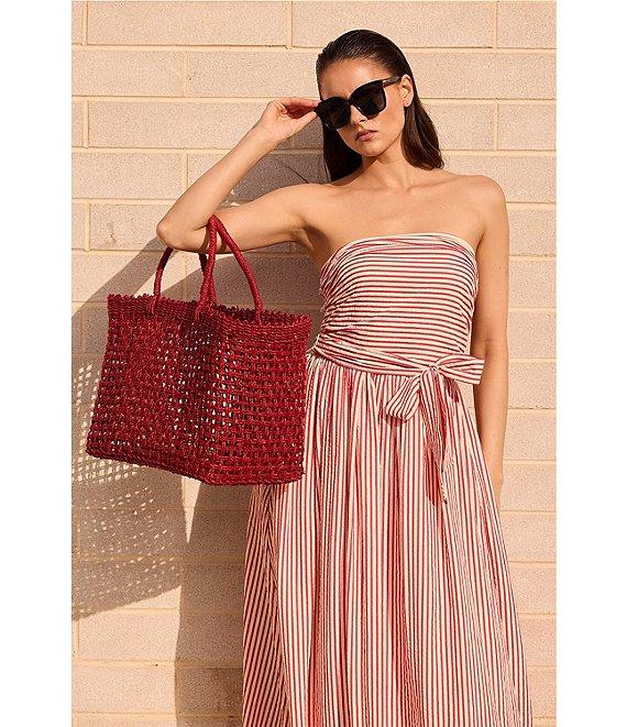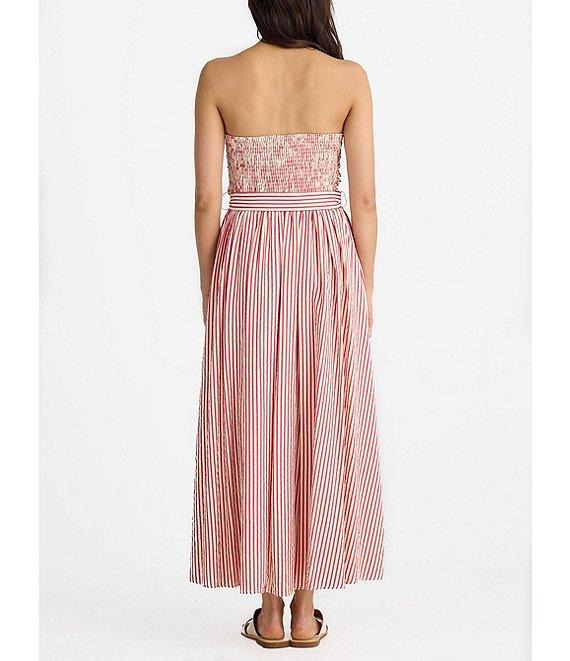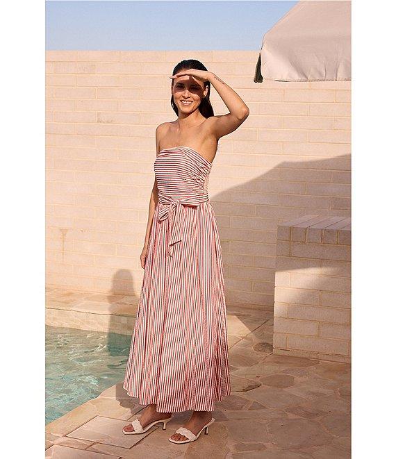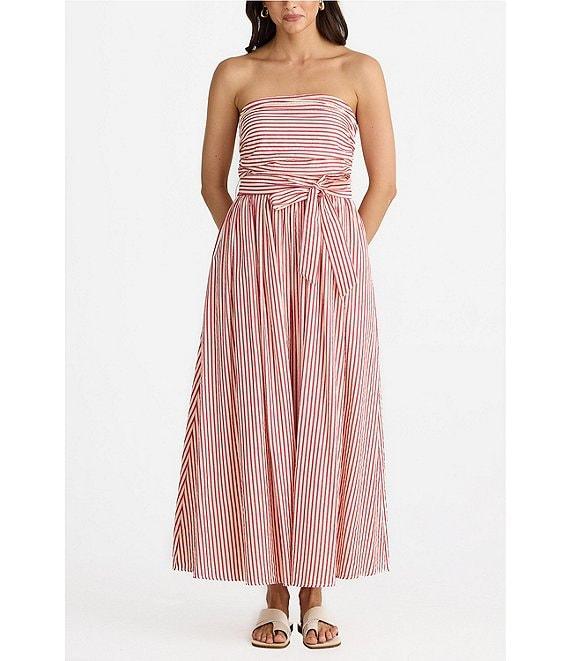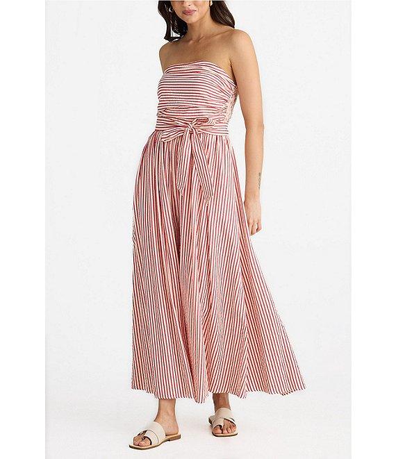 From Brave + True, this dress features:Striped seersuckerStrapless necklineSleevelessGathered front and shirred backMatching self tie beltSide seam pocketsLinedPullover constructionApprox. 47.5" in lengthPolyester/cotton/viscose fabricationMachine wash/line dryImported.
