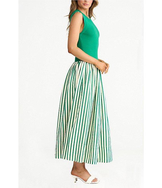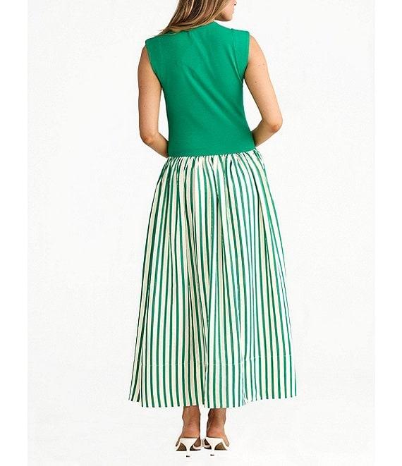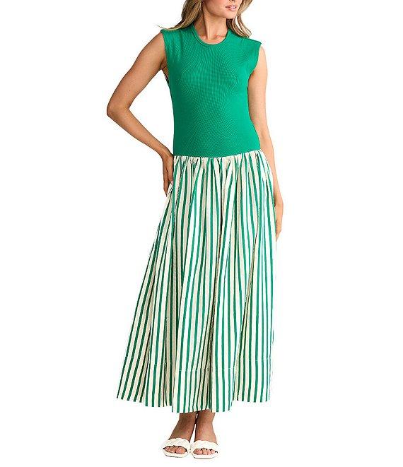 From Brave and True, this dress features: Jersey rib body with cotton skirt Solid body and striped skirt Crew neckline Sleeveless Side seam pockets Full length skirt with small side slit Pullover construction Approx. 53" in length Cotton/elastane Machine wash/dry flat Imported.