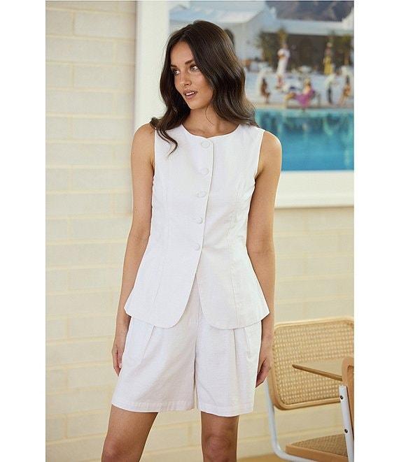 From Brave + True, these shorts feature: Linen/cotton fabrication Front box pleats Hight waisted with belt loops Angled front pockets Back faux pockets Lined Front button/zipper closure Above knee length Approx. 19.25" in length Linen/ Cotton Machine wash cold/line dry Imported.