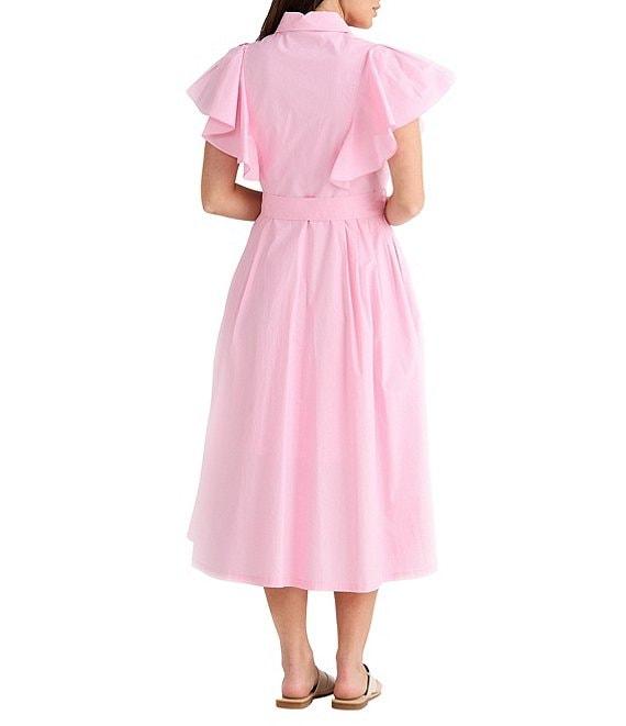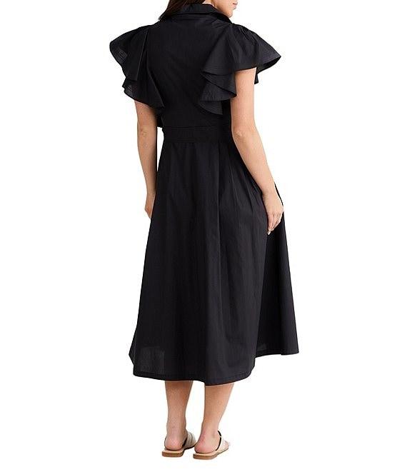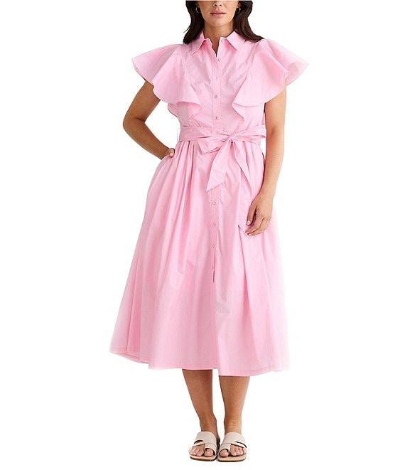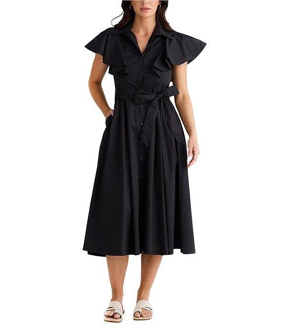 From Brave and True, this dress features: Cotton fabrication Collared with v neckline Sleeveless with fabric ruffles that drape over shoulders Button front closure Self tie belt included Pockets Midi length A line silhouette Approx. 48.5" in length Cotton Machine wash/dry flat Imported.