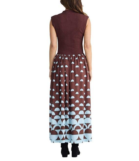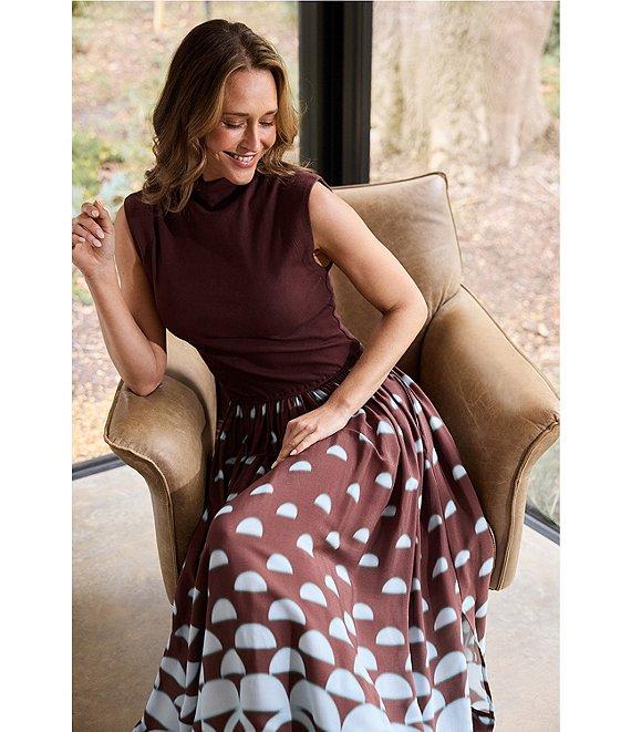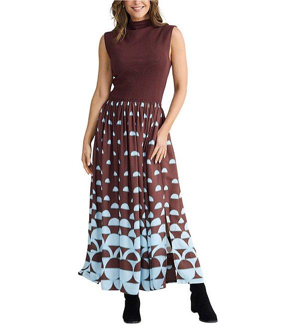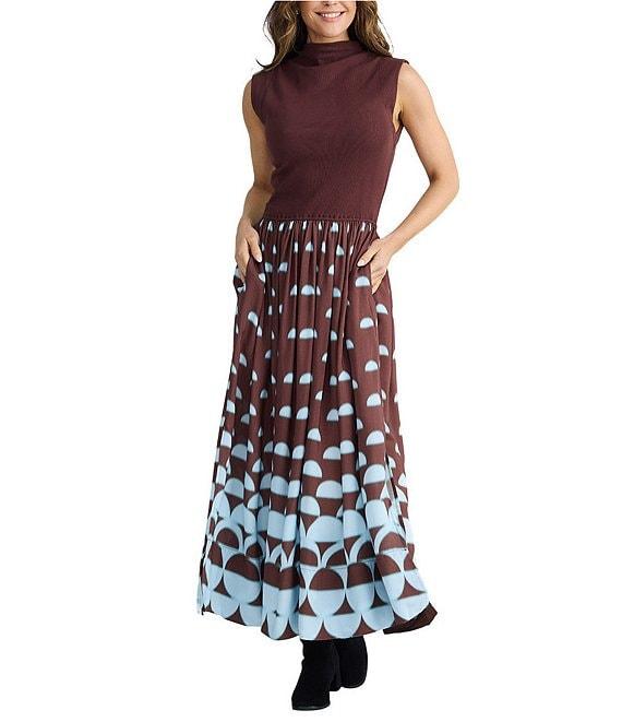From Brave + True, this dress features: Jersey rib body Woven skirt Yardage printed Mock neckline Sleeveless A line silhouette Side seam pockets Pullover construction Approx. 53" in length Viscose main and cotton/elastane Hand wash cold Imported.