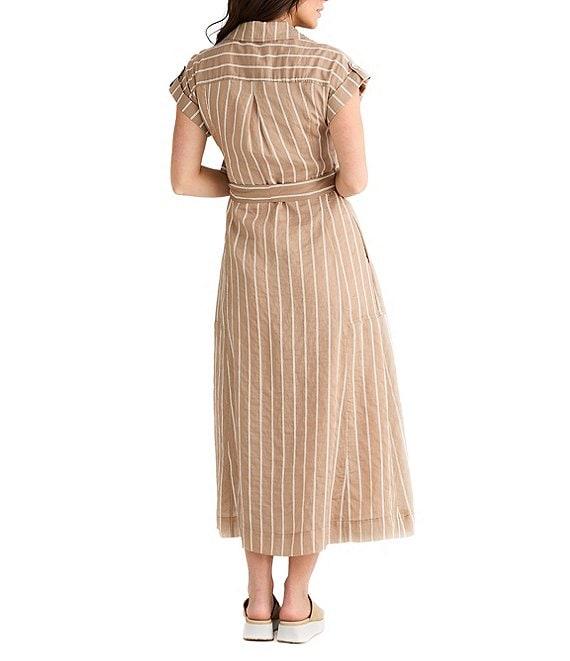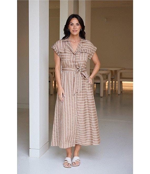 From Brave + True, this dress features:Striped midi dressCamp/notch collarButton front closureCuffed short sleeves with button tabsSelf tie belt includedA-line silhouetteChest pockets and side seam pockets Approx. 52.5" in lengthLyocell/polyamide/polyesterMachine wash/dry flatImported.
