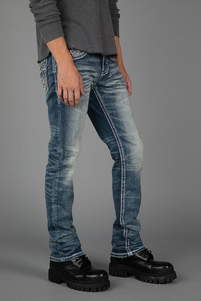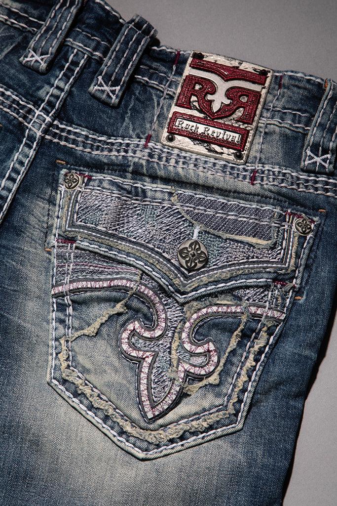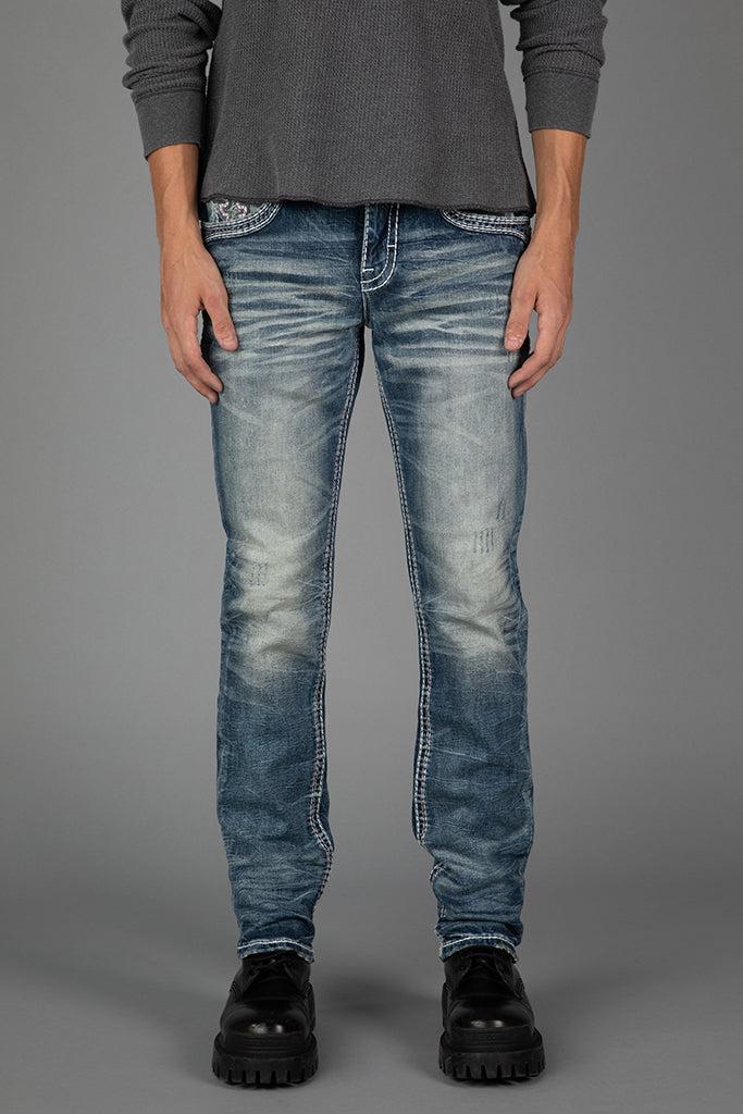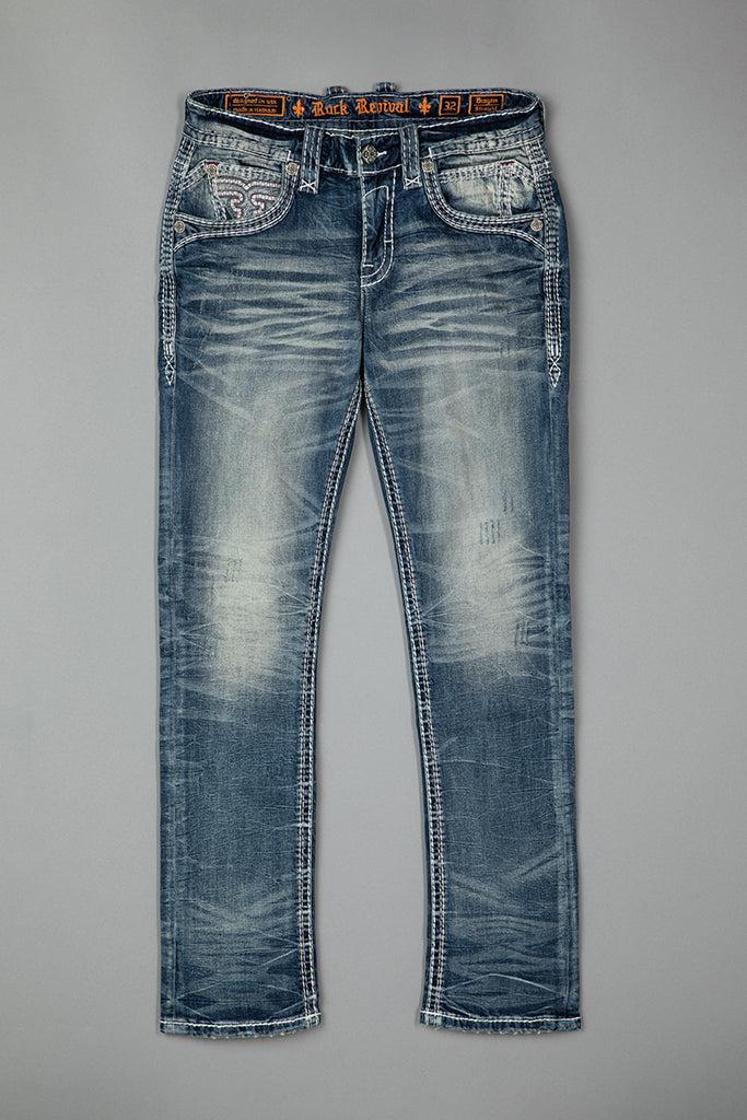 Brayen Straight Jeans by Rock Revival with a straight silhouette crafted in a medium wash, designed in Los Angeles. Premium stretch denim for comfort and durability Signature inverted Fleur-de-Lis embroidery Custom pewter hardware and rivets Engraved 'Rock Revival' leather waist patch