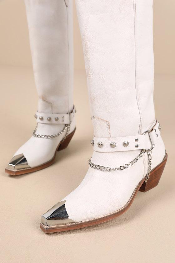 The Matisse Brazen Distressed White Studded Chain Knee-High Boots take the spot at the top of our must-have list! These trend-setting boots have a smooth genuine leather construction with distressing throughout for a lived-in look. The pointed-toe upper features a silver metal toe cap and a studded strap that meets via O-rings at each side, embellished with a chain link detail. The 15.5" knee-high shaft features a 16" circumference. Western-inspired touches like a seamed vamp, a curved topline with pull tabs, and a stacked block heel complete the iconic design. Available in whole sizes only.