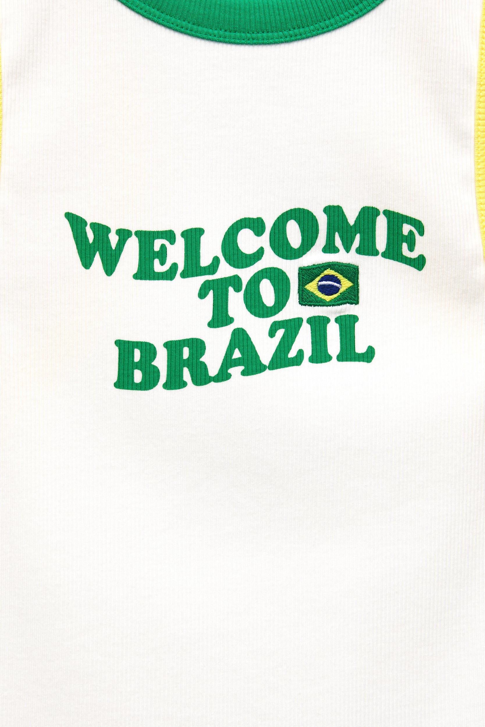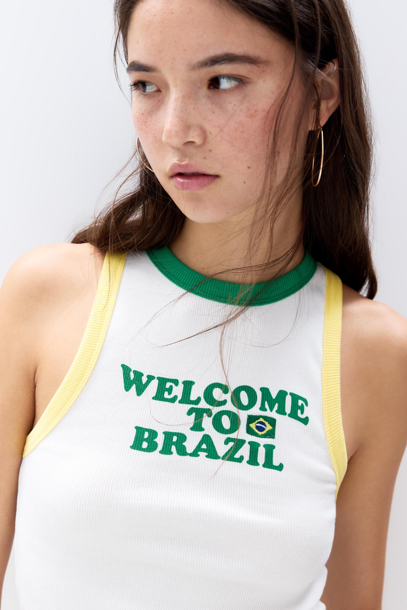White tank top with a “Welcome to Brazil” graphic, contrast ribbed trims and a crew neck. Made of cotton. Total look