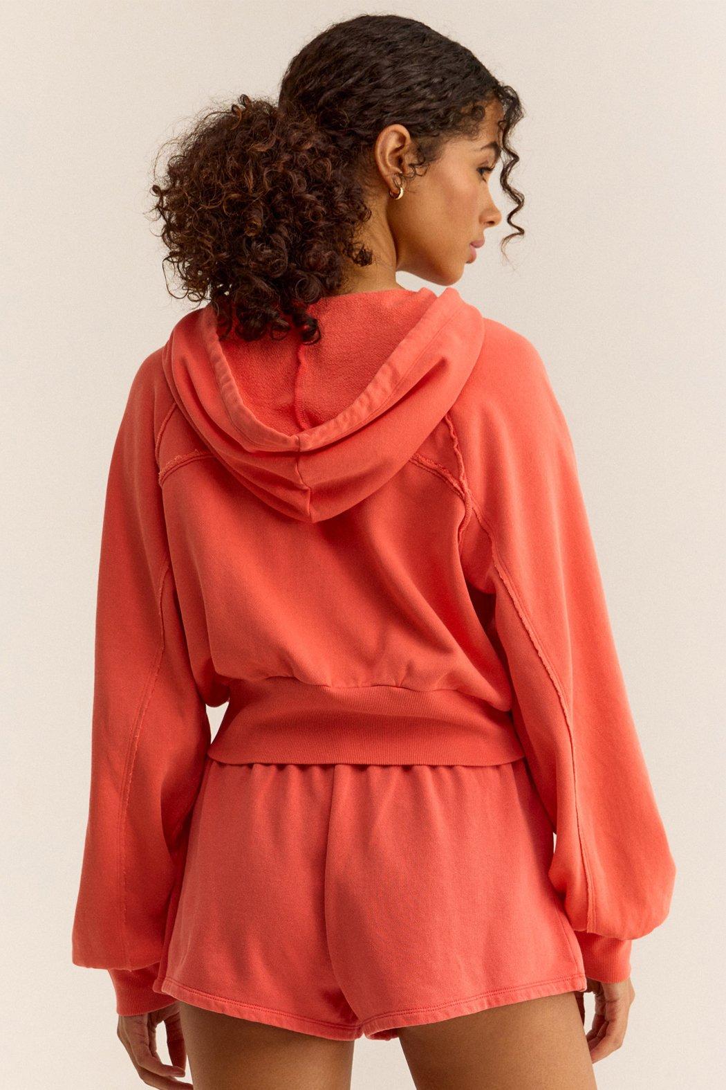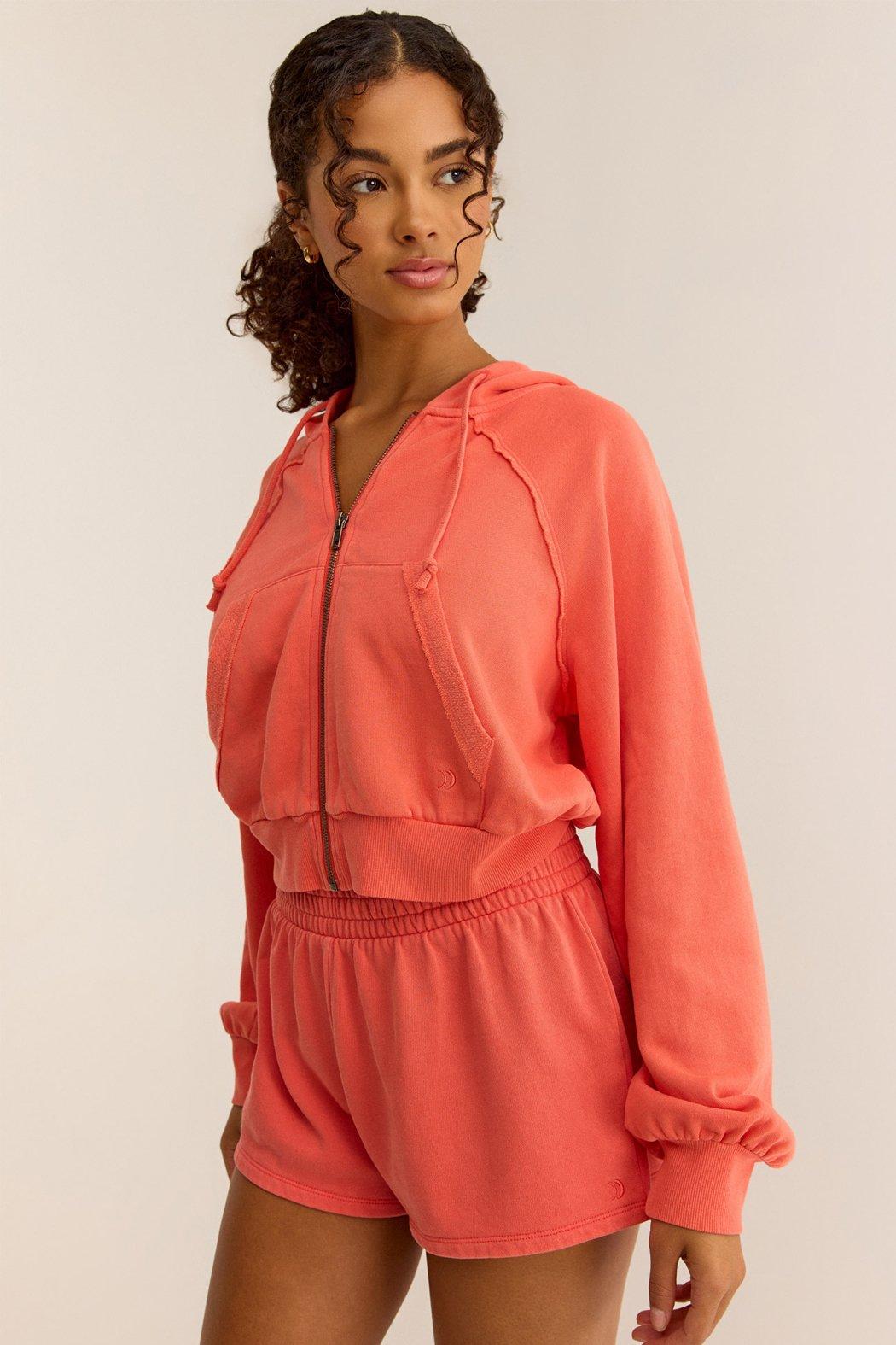 This bright salmon pink hoodie is made from a soft breathable 100% cotton fleece, featuring a front zip, hood, kangaroo pocket with raw hem detailing, and ribbed hemline, This hoodie is ideal for virtually any occasion. Pair it with the Rise Up Fleece Shorts for a matching set.