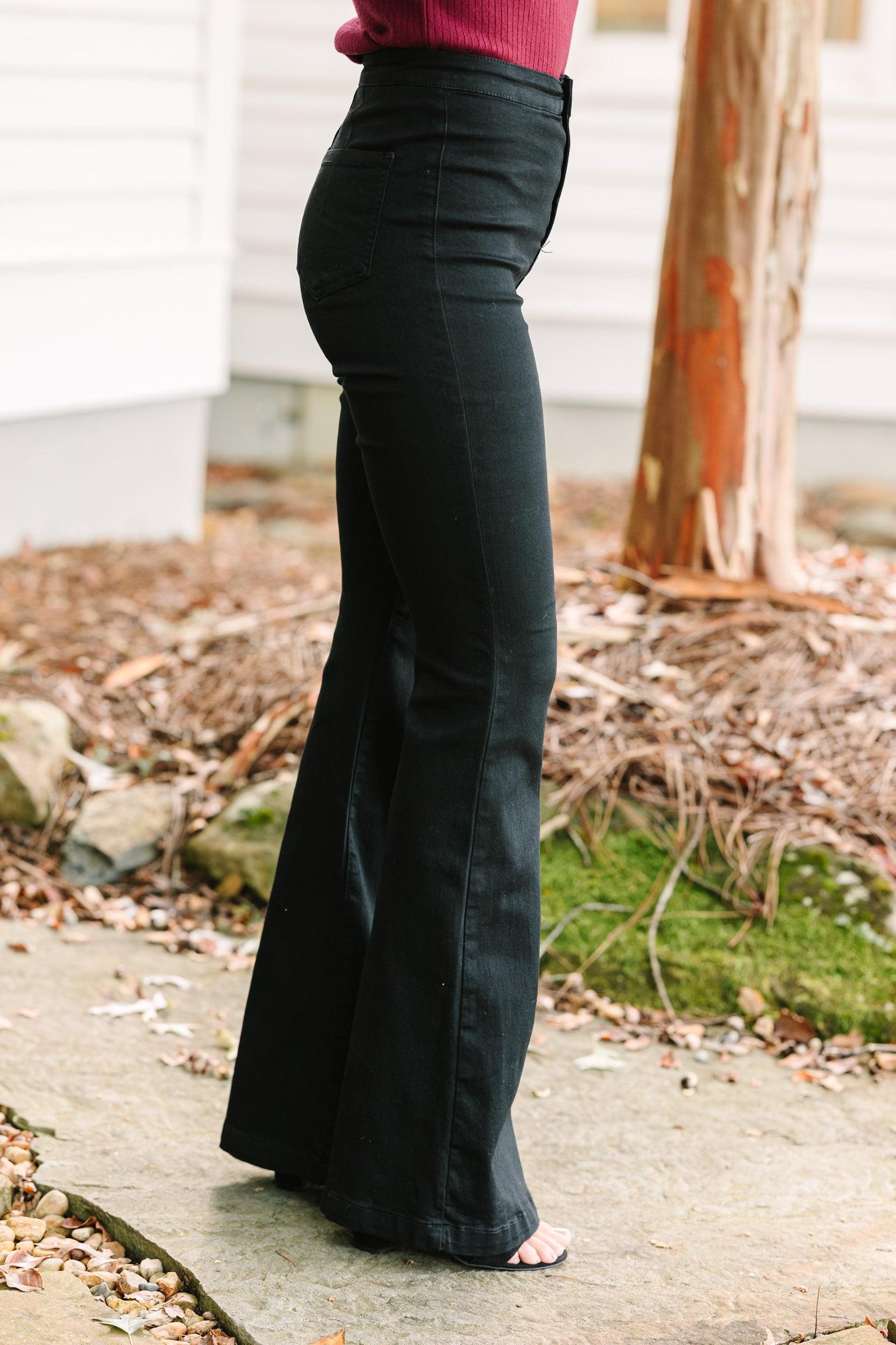 These flared jeans are so fabulous! The retro wide legs are super trendy and we love that chic black wash! These flares are going to give you legs for days! Button/zip front closure No front pockets Back pockets No belt loops High waist Flared legs Generous stretch Sydney is wearing the size 1.