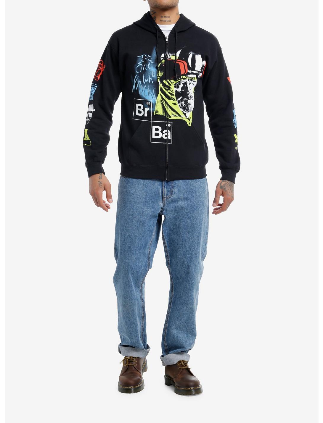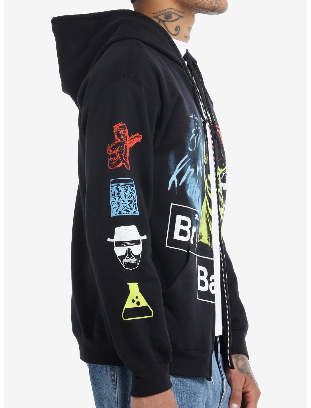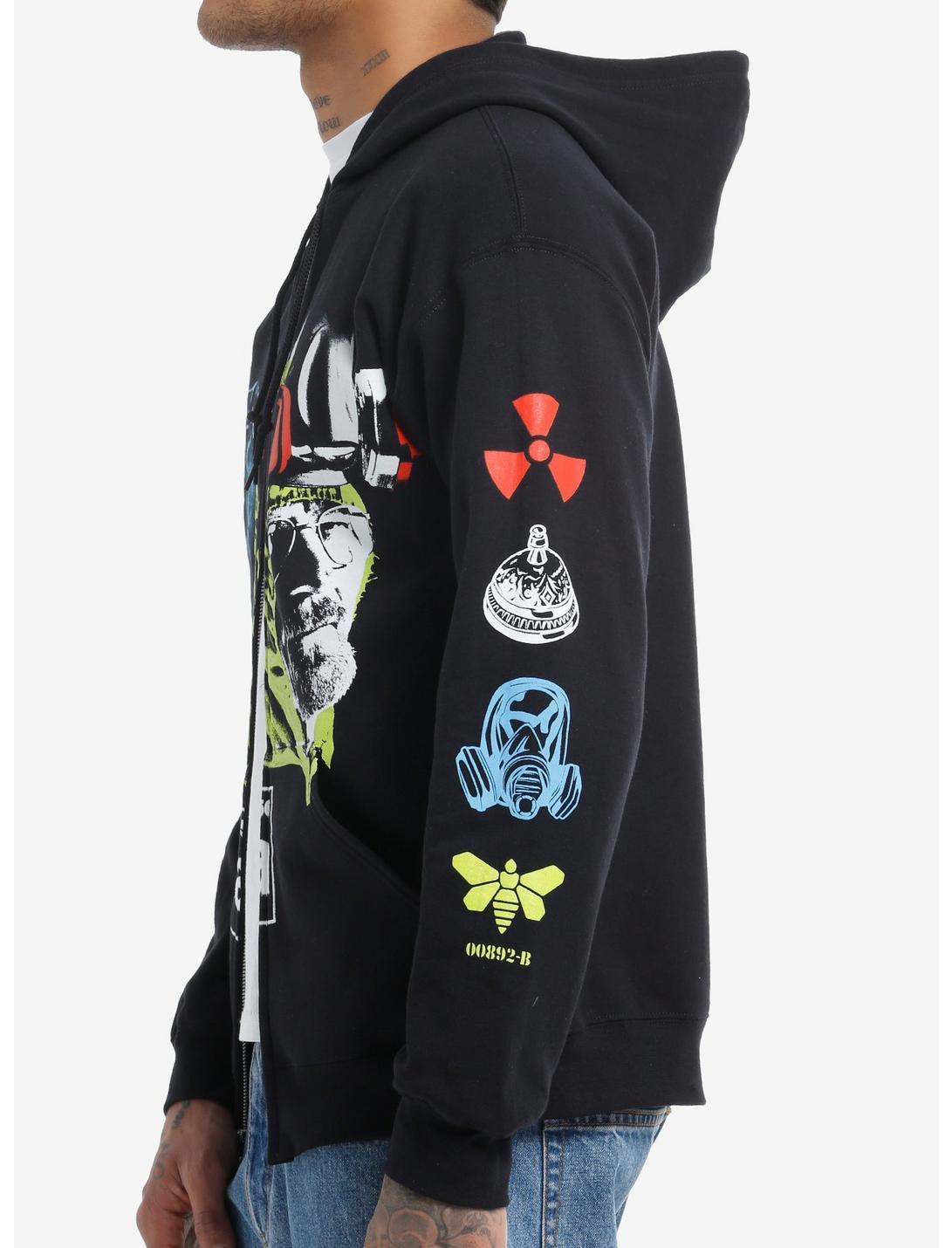 This black Breaking Bad zip hoodie shows Walter White in his hazmat suit, the show's Periodic Table symbols and his quote "I am the one who knocks" in wispy lettering. Each sleeve has colored symbols, such as a chemical flask, teddy bear, Hector Salamanca's bell and more. Front pockets and drawstring hood.50% cotton; 50% polyesterWash cold; dry lowImportedListed in men's/unisex sizesModel is 6'1"Model wears size Medium
