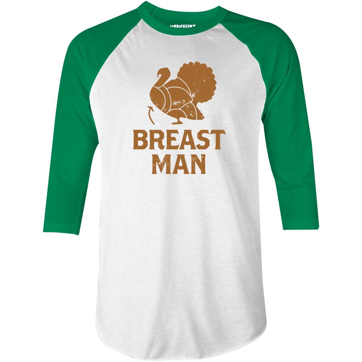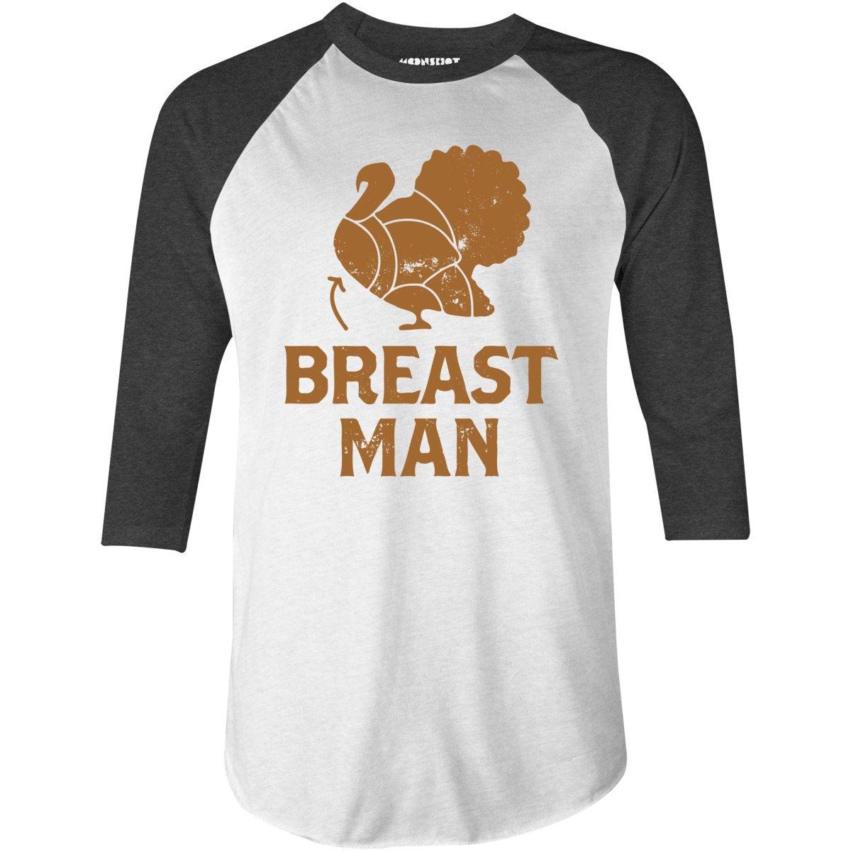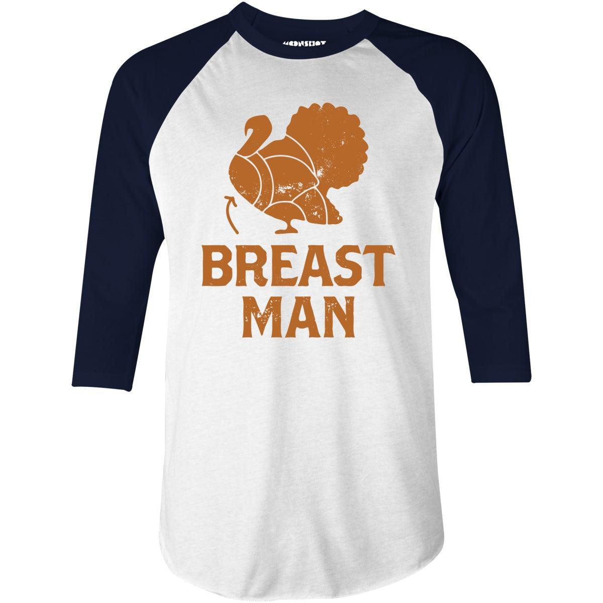 Get a laugh this holiday season with the "Breast Man" design, featuring a playful turkey illustration and a cheeky nod to those who know their favorite part of the feast. Perfect for fans of adult humor and Thanksgiving fun, this design is ideal for anyone ready to make a statement at the dinner table. Serve up some laughs with this witty, festive throwback! Printed on our super soft 3/4 sleeve baseball style raglan T-Shirt. We print & ship all of our high quality graphic tees in the USA.