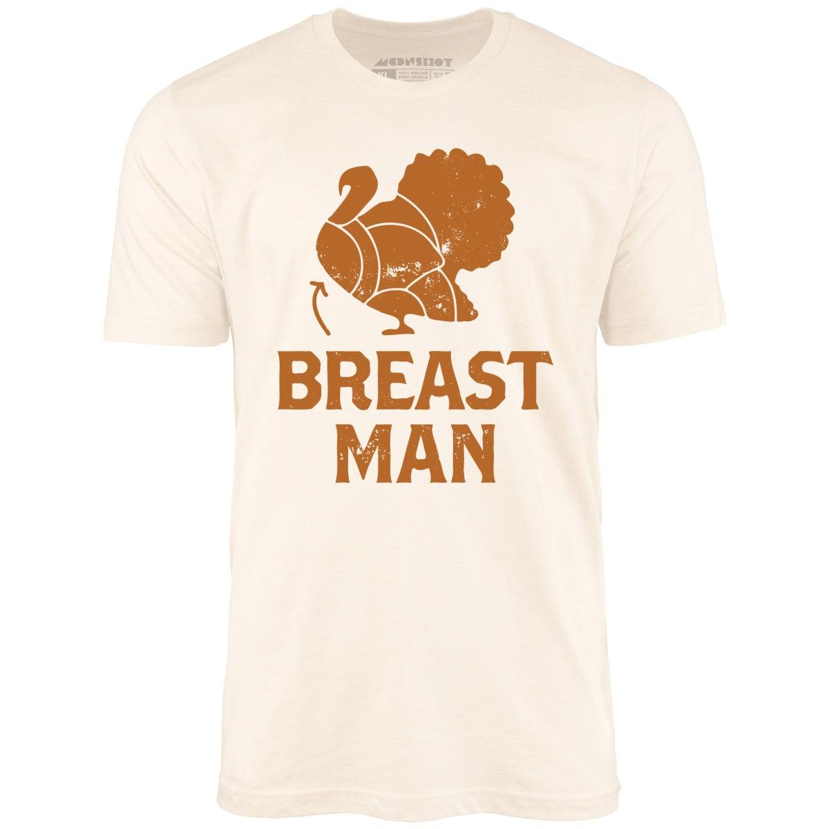The perfect funny breast man Thanksgiving holiday T-Shirt for any guy who loves breasts. Turkey breasts that is. Printed on our super soft 100% airlume ring-spun & combed cotton unisex T-Shirt. Or upgrade to our Luxury 52/48 cotton/poly vintage heather edition for an even softer classic look. We print & ship all of our high quality graphic tees in the USA.