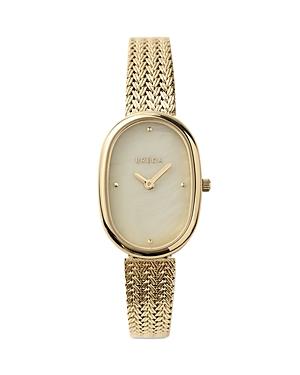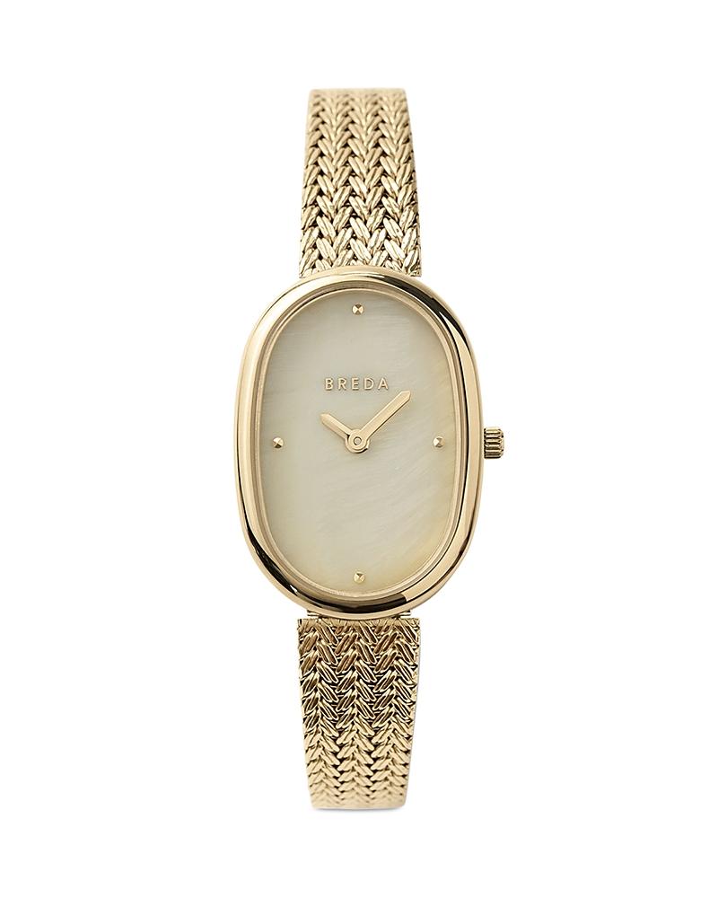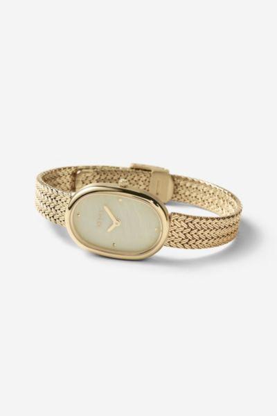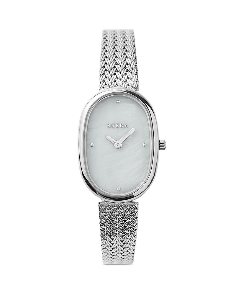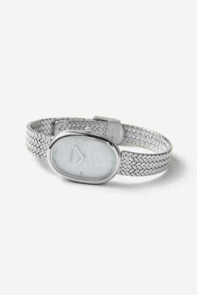 Content + Care Gold: Champagne Colored Mother of Pearl Dial with Gold Hour and Minute Hands. 23MM 18K Gold- Plated Stainless Steel Case. Gold Plated Stainless Steel Bracelet with Jewelry Clasp Enclosure Silver: Champagne Colored Mother of Pearl Dial with Stainless Steel Hour and Minute Hands. 23MM Stainless Steel Case. Stainless Steel Bracelet with Jewelry Clasp Enclosure Wipe clean with cloth Imported Size + Fit 5/16in x 25/32in x 15/32in x 8.5in BREDA Jane Tethered Mesh Bracelet Analog Quartz Watch in Silver, Womens at Urban Outfitters