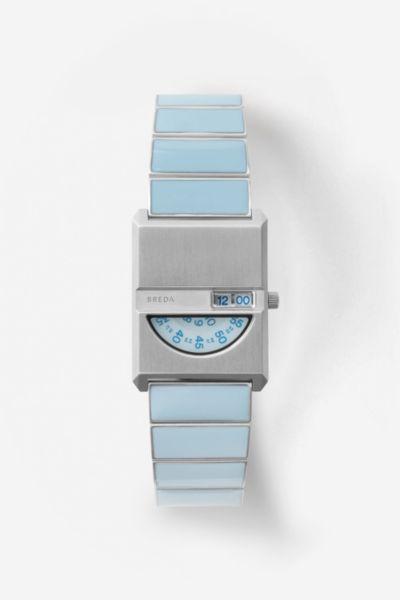 Content + Care Printed Black Hour & Minute Display & a half-moon shape at the bottom to display watch movements. Gold Plated Stainless Steel Bracelet with White Epoxy & Push Button Clasp Enclosure Wipe clean with cloth Imported Size + Fit 9/32in x 45/64in x 35/64in x 8.5in BREDA Pulse Tandem Metal Bracelet Watch in Sky, Mens at Urban Outfitters