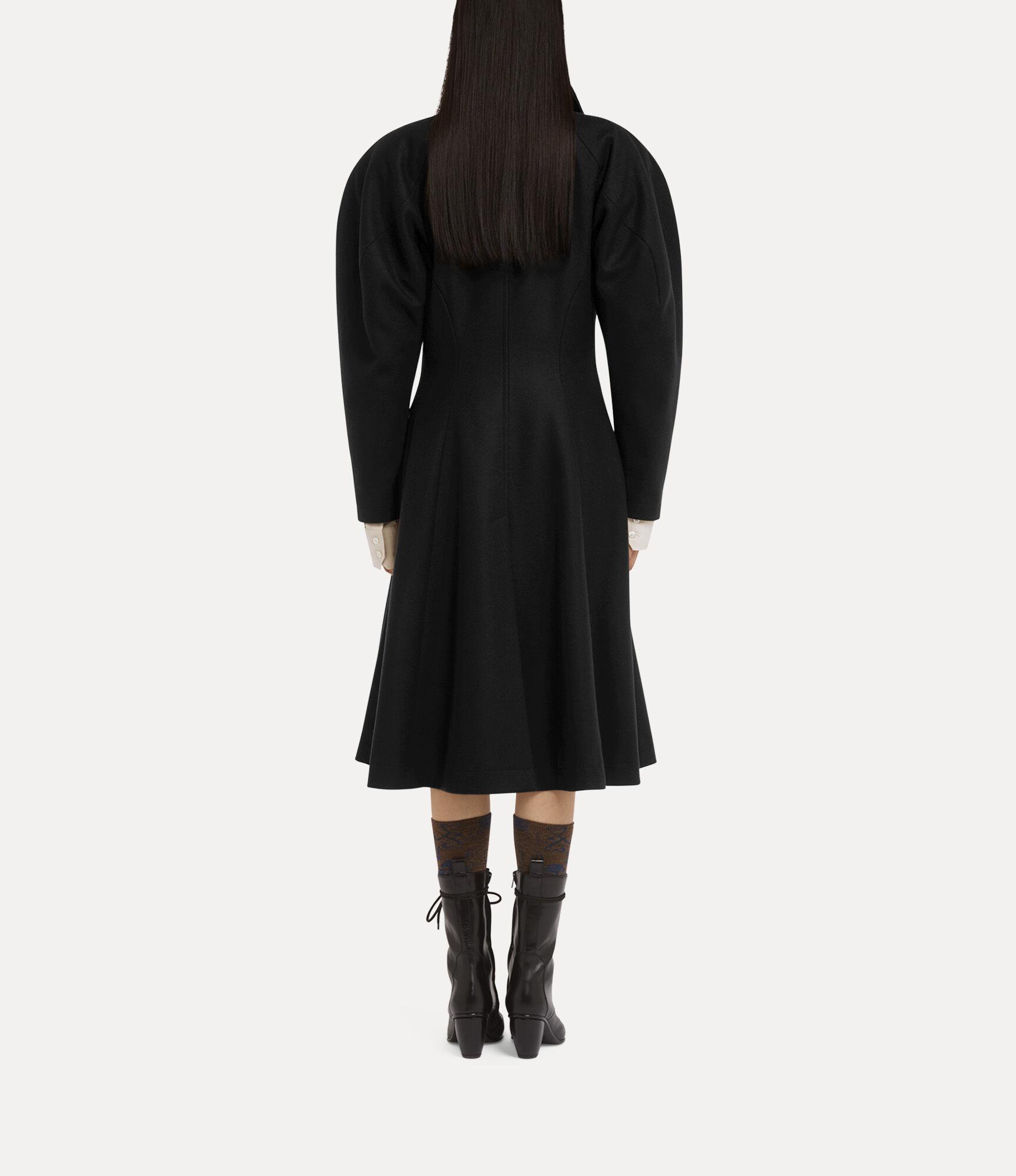 The Breeze coat features an asymmetrical single-breasted front, fastened with oval-shaped buttons engraved with the delicate 'Line Orb' motif - a nod to Vivienne’s vision of blending tradition with the future. Crafted from a wool-cashmere blend, the coat includes exaggerated rounded shoulders, a sharply contoured waist, and a flared hem, creating a tailored silhouette.