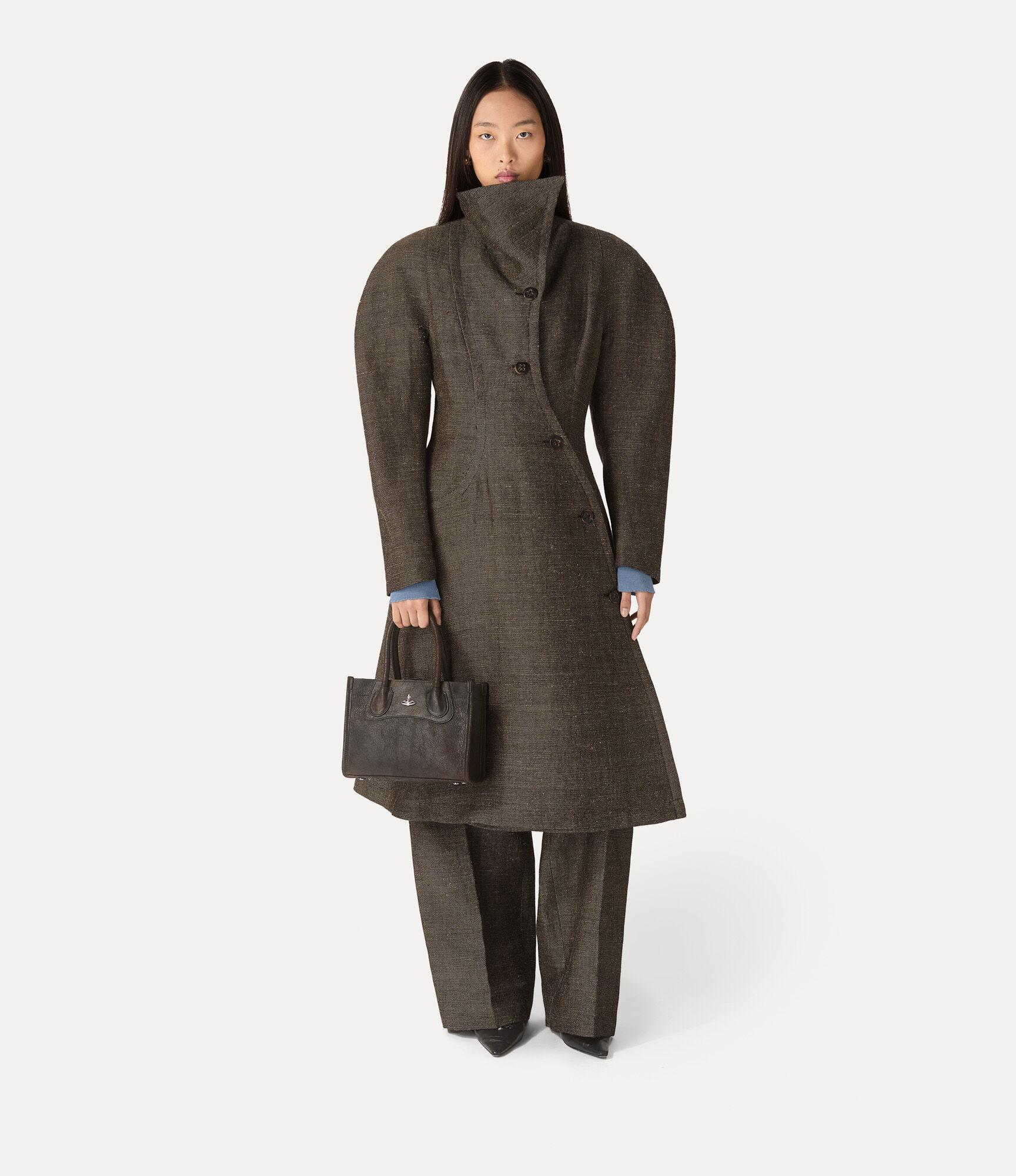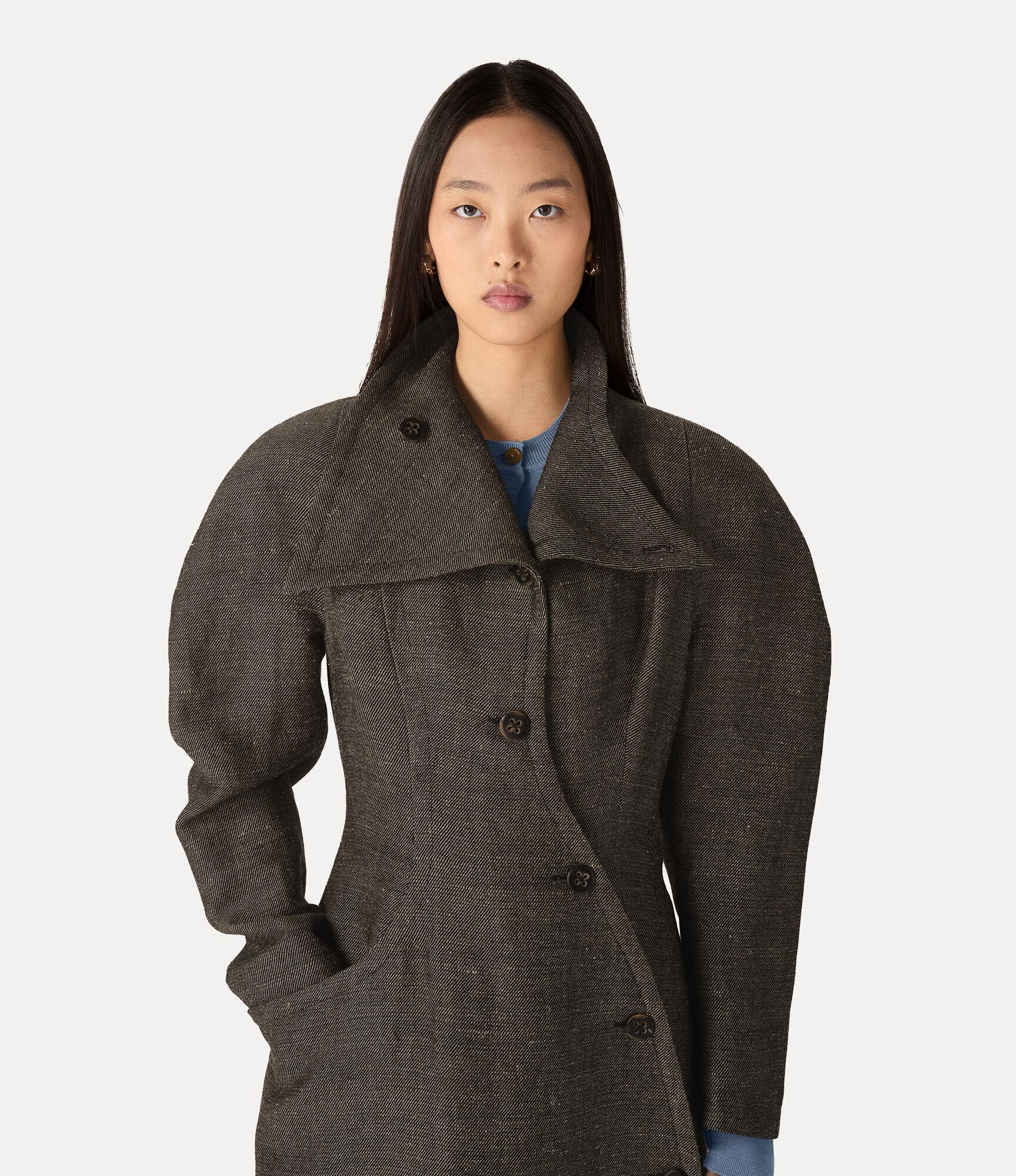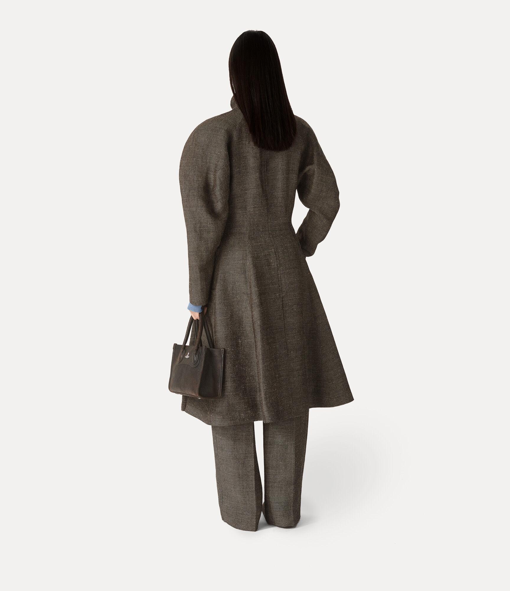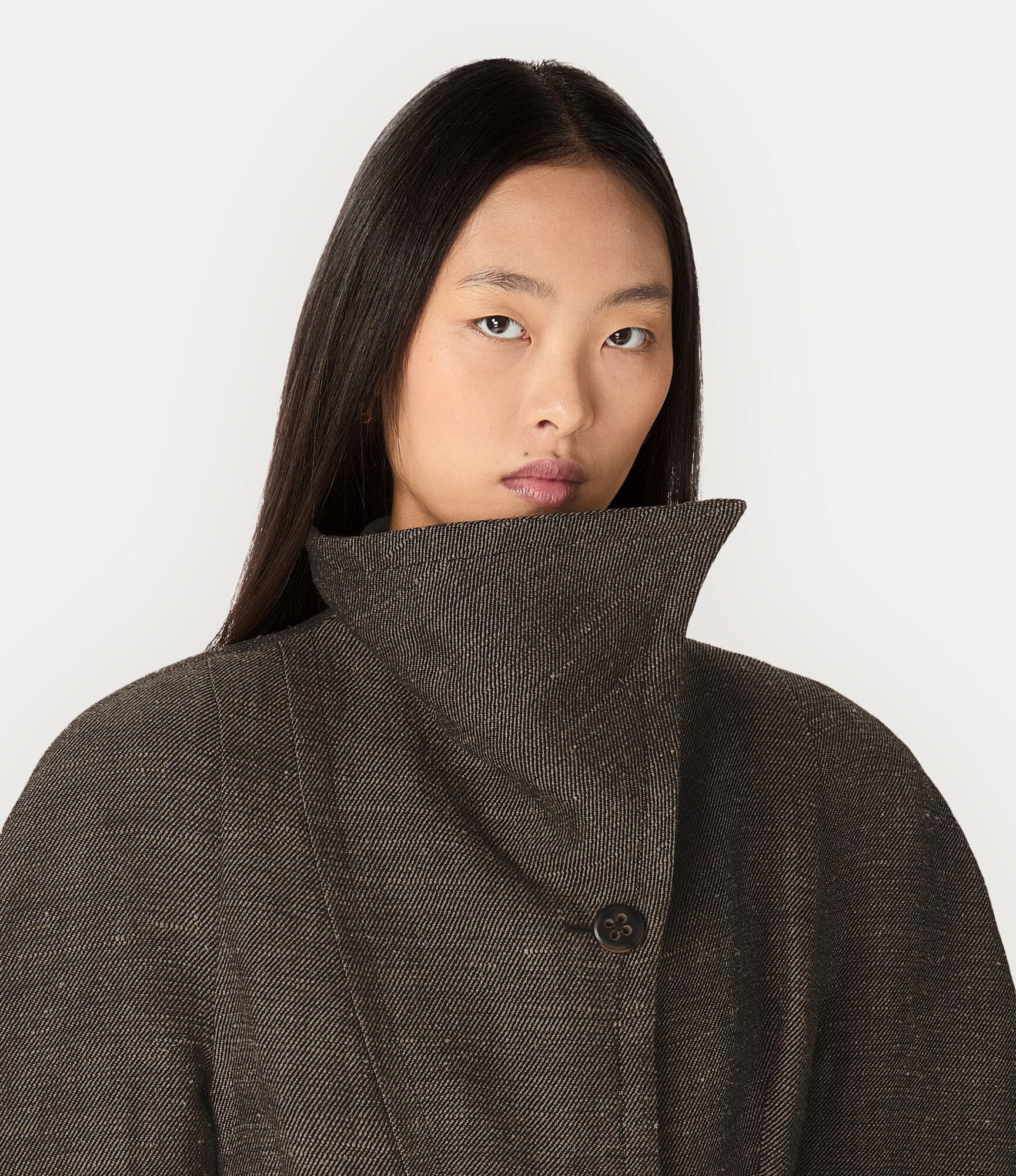 The Breeze coat is tailored from a linen–cotton twill with a soft, flannel-like texture that gives the piece an archival and rustic aesthetic. Cut with a bold asymmetric silhouette, the piece features an off-centre row of buttons that fasten the wrap-front construction, sculpting the waist before falling into a subtle flared hem.