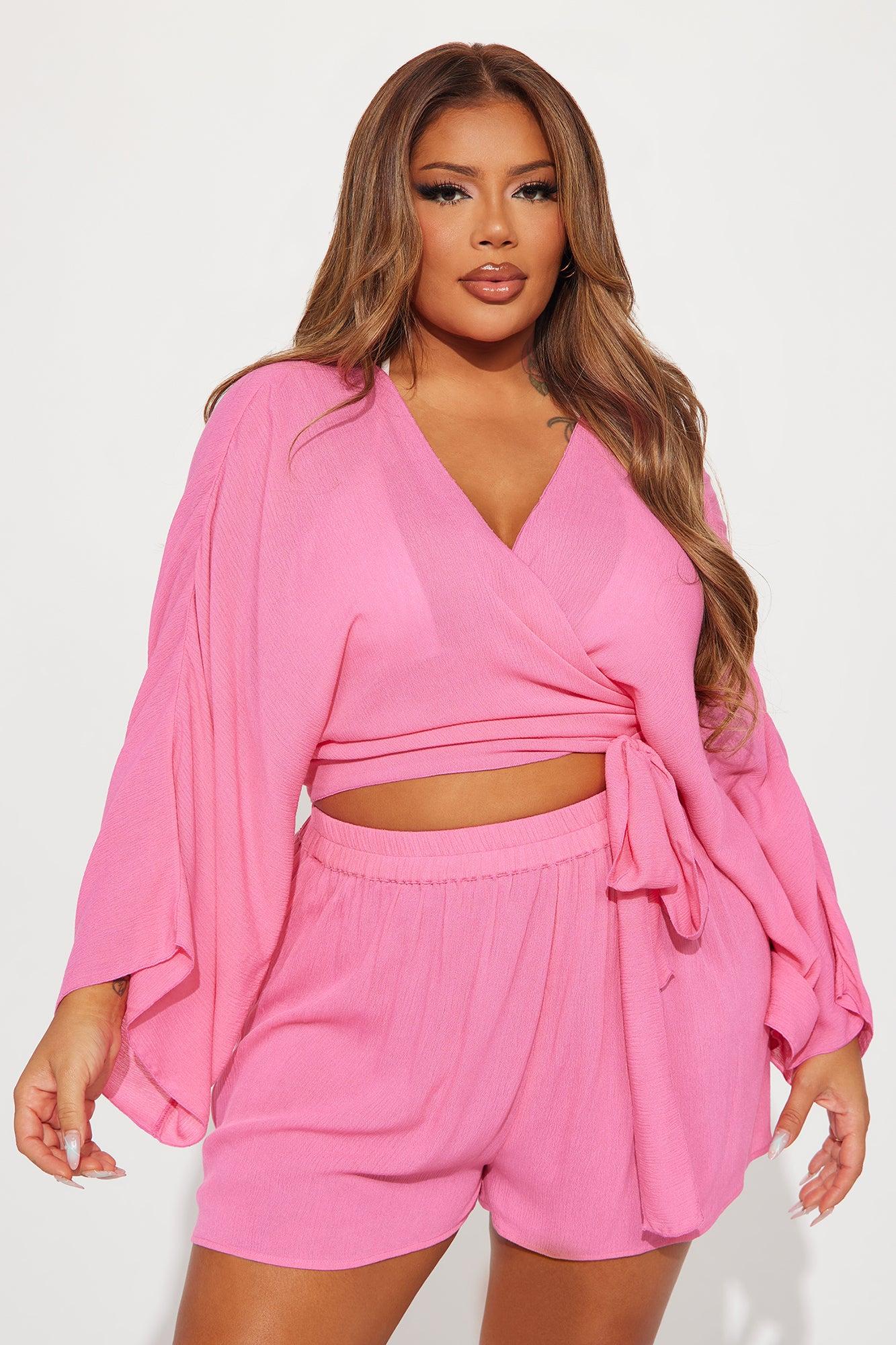 Available In Pink. Swim Cover Up Set Crop Top Linen Semi-Sheer Surplice V-Neck Long Sleeves Shorts Tie Waist Full Stretch Final Sale 100% Viscose Imported California Proposition 65WARNING: Cancer and Reproductive Harm - www.P65Warnings.ca.gov.