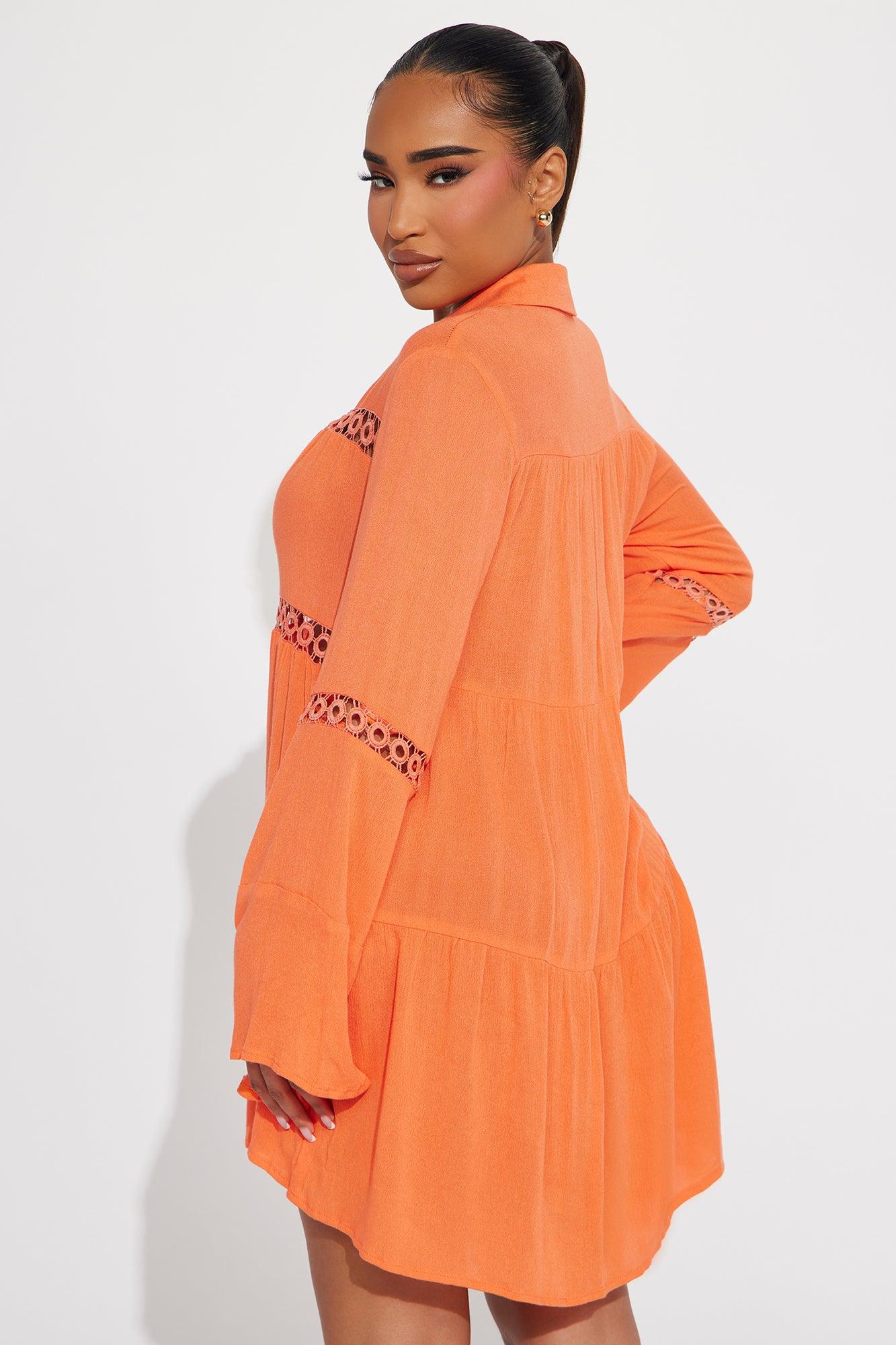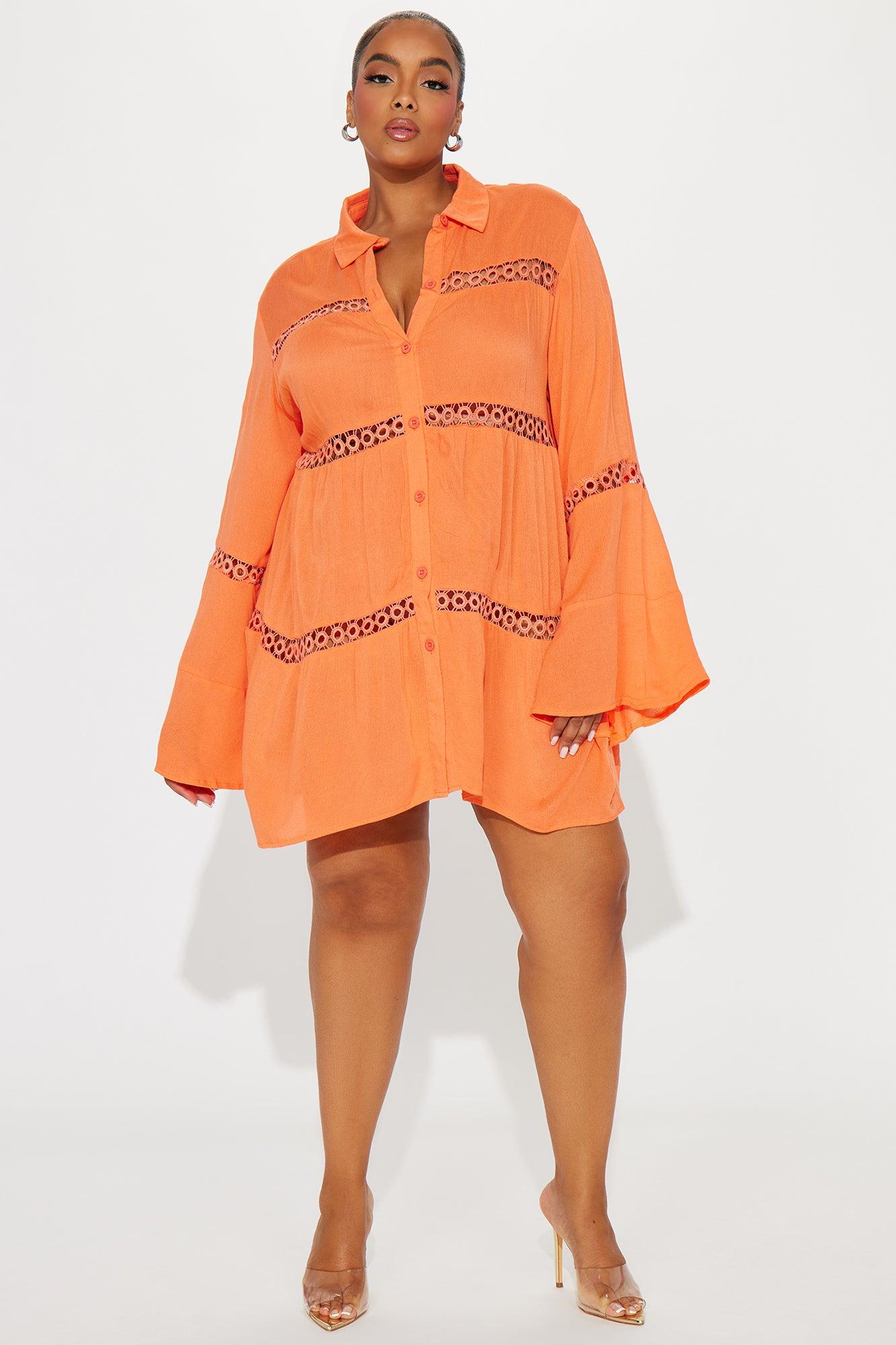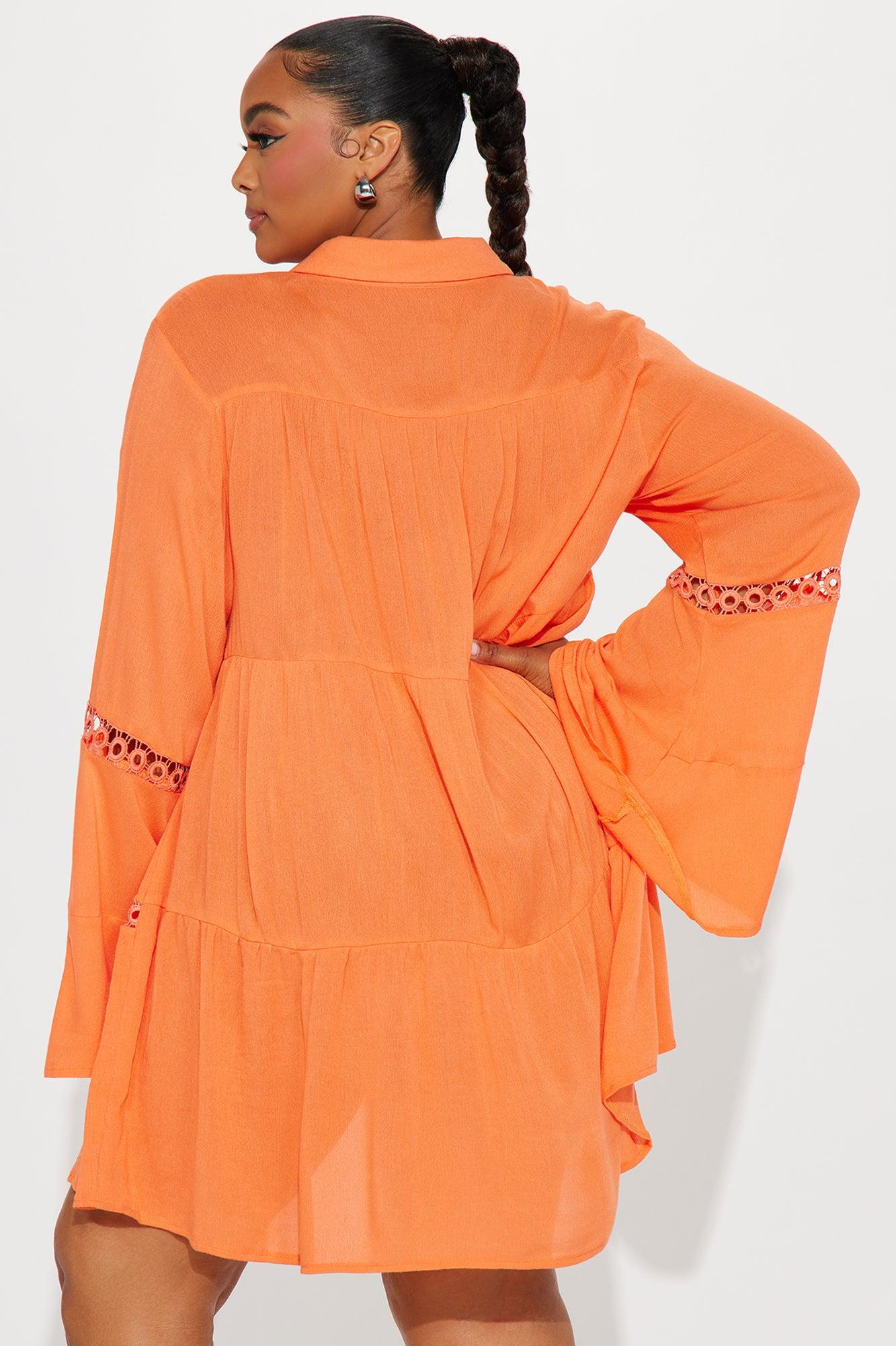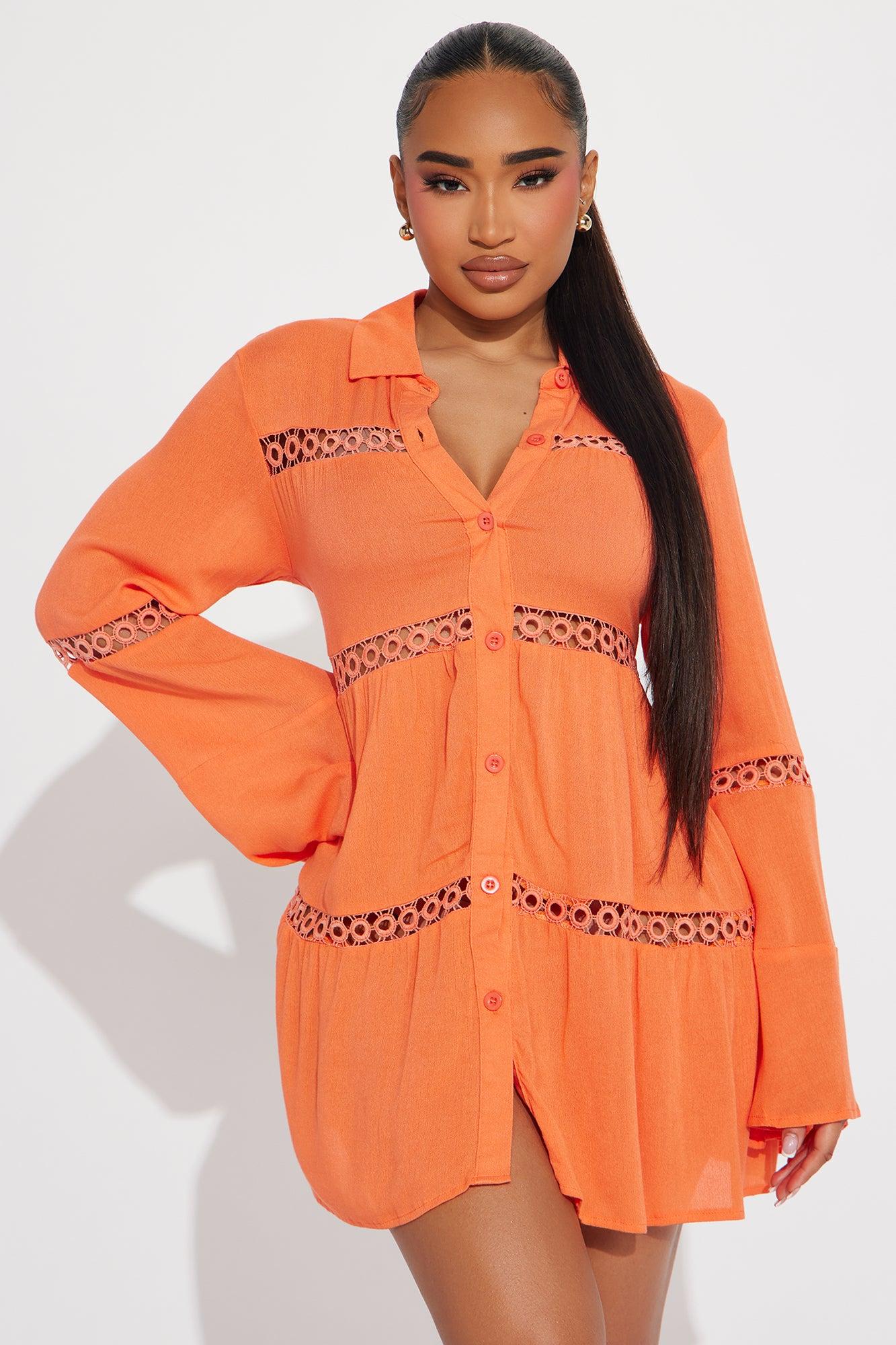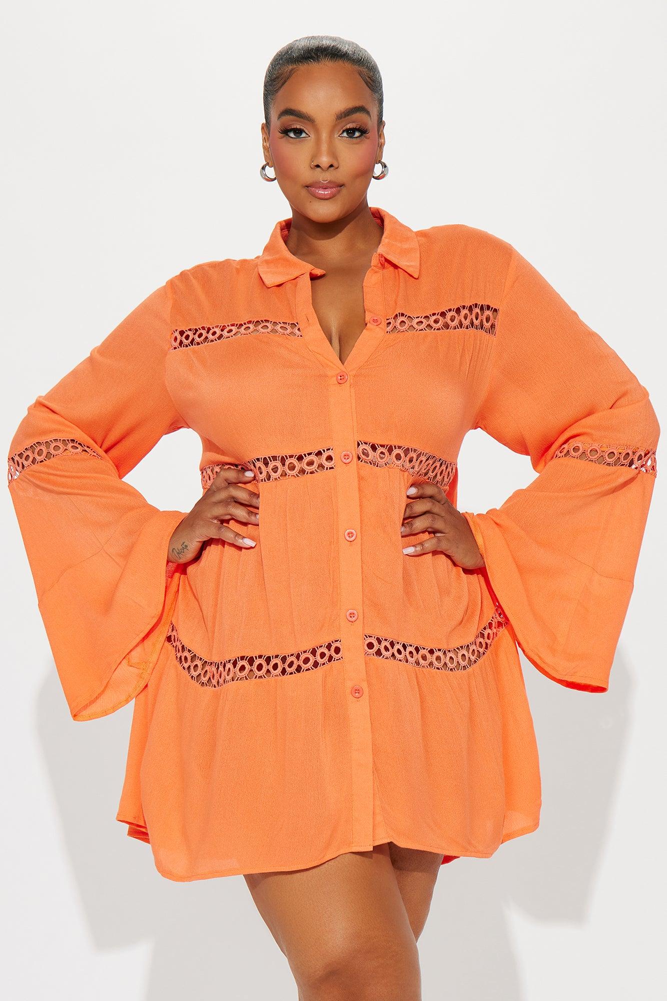 Available In Black, Orange And White. Swim Cover Up Shirt Dress Circle Crochet Trim Collared Long Sleeves Bell Sleeves Sheer Button Up / Button Down Full Stretch Final Sale 100% Viscose Imported California Proposition 65WARNING: Cancer and Reproductive Harm - www.P65Warnings.ca.gov.