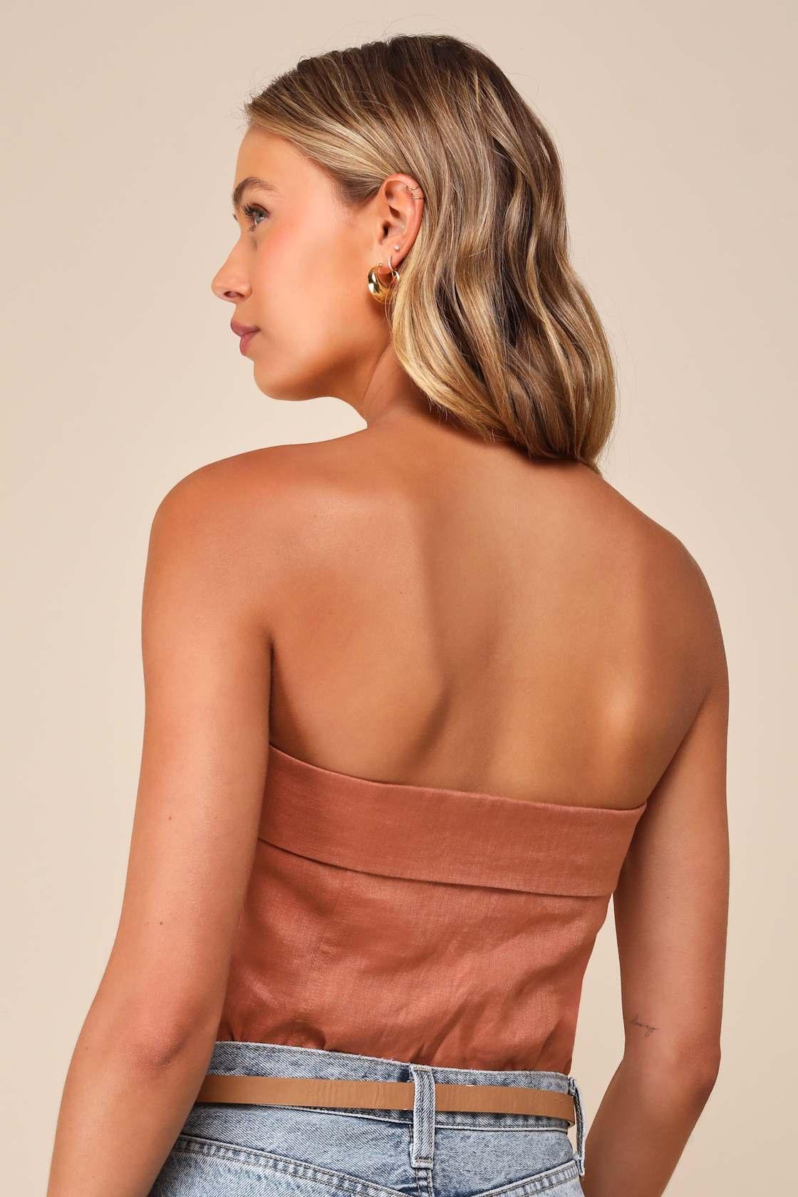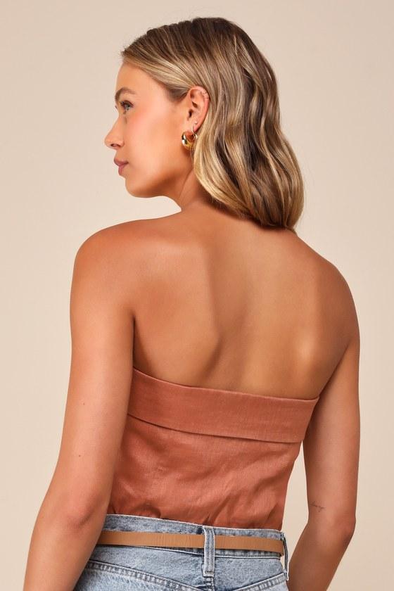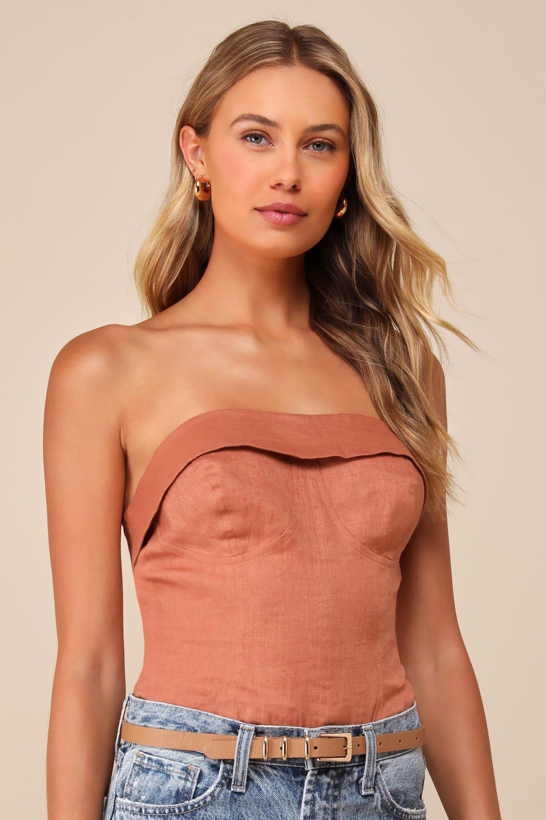 Flaunt your effortlessly alluring style all day long in the Lulus Breezy Presence Terracotta Linen Strapless Bustier Bodysuit! Lightweight woven linen shapes this trendy top that has a straight, strapless neckline with a foldover detail and hidden no-slip strips. The flirty, bustier-inspired bodice features seamed cups before ending at attached knit thong bottoms with snap closures. Hidden side zipper/clasp.