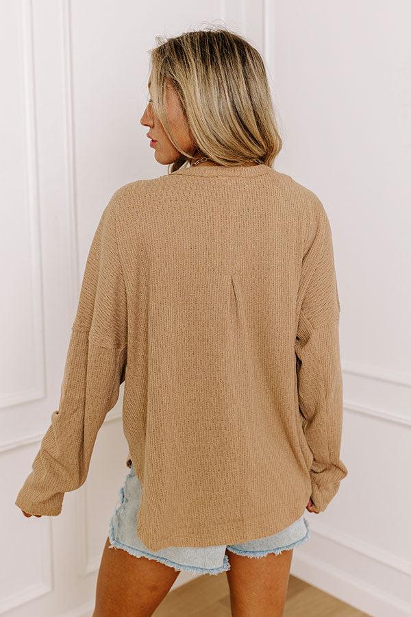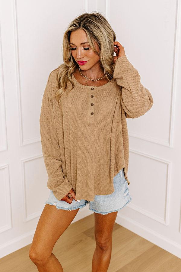 - When the leaves are falling and autumn is calling, stay trendy with this oversized henley! - Unlined knit material with subtle texture - Trendy unfinished seam detailing - A crew cut neckline that goes into a henley style button down bodice - Long sleeves - An oversized silhouette that ends in a rounded unfinished hemline Measurements S : Bust 56", Hip 48", Length 24.5", Sleeve Length 27", Waist 50". M : Bust 58", Hip 50", Length 25", Sleeve Length 27", Waist 52". L : Bust 60", Hip 52", Length 25.5", Sleeve Length 27.5", Waist 54".