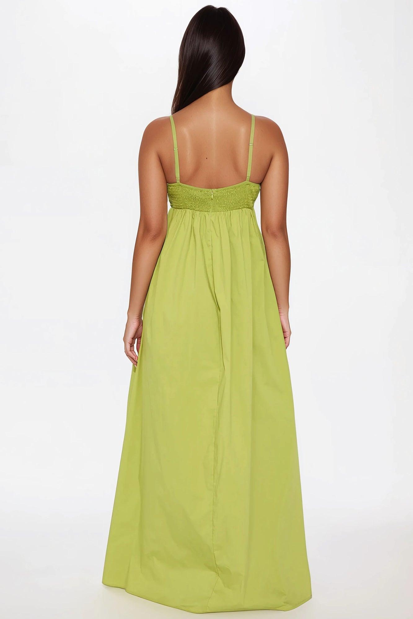 Available In Chartreuse. Poplin Maxi Dress Adjustable Spaghetti Straps Sweetheart Neckline w/ Hardware Detail Padded Elastic Waist Hidden Back Zipper Smocked Back Pockets Self : 70% Cotton , 30% Polyester Lining : 97% Polyester; 3% Spandex, Imported