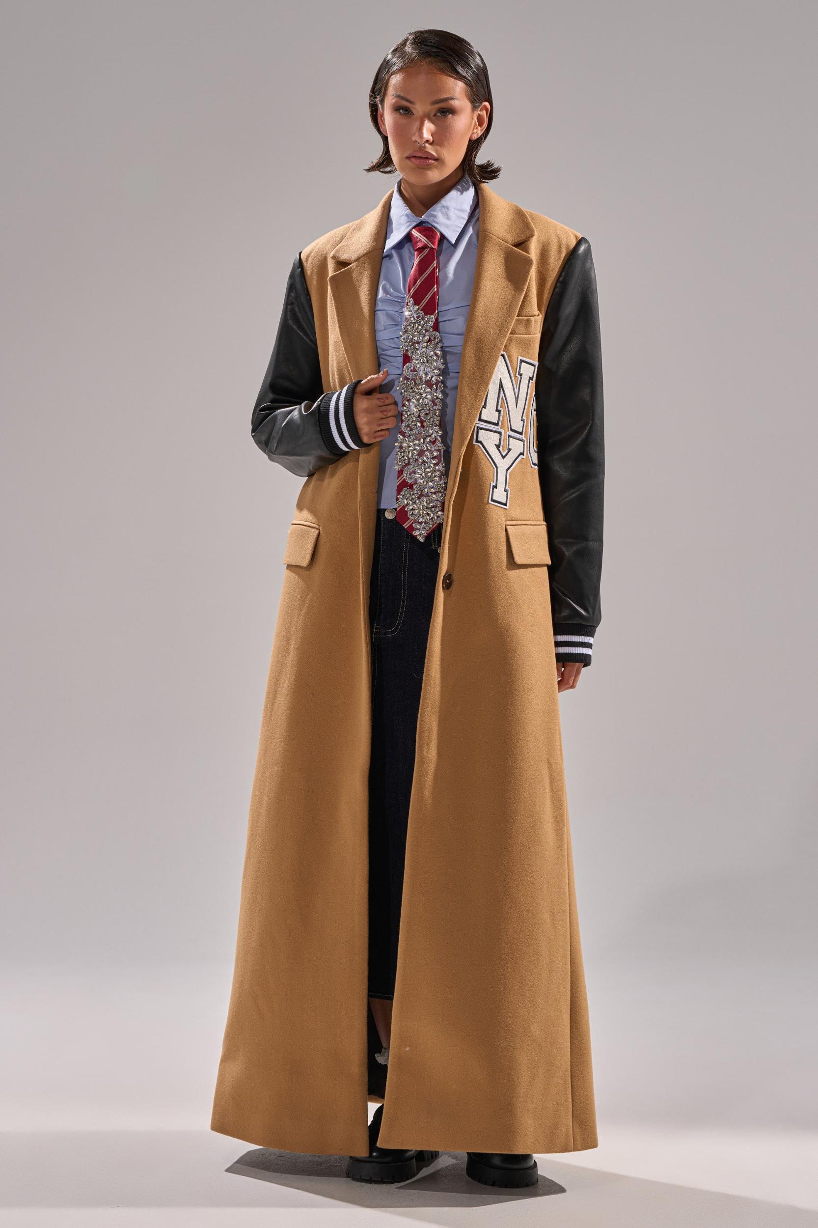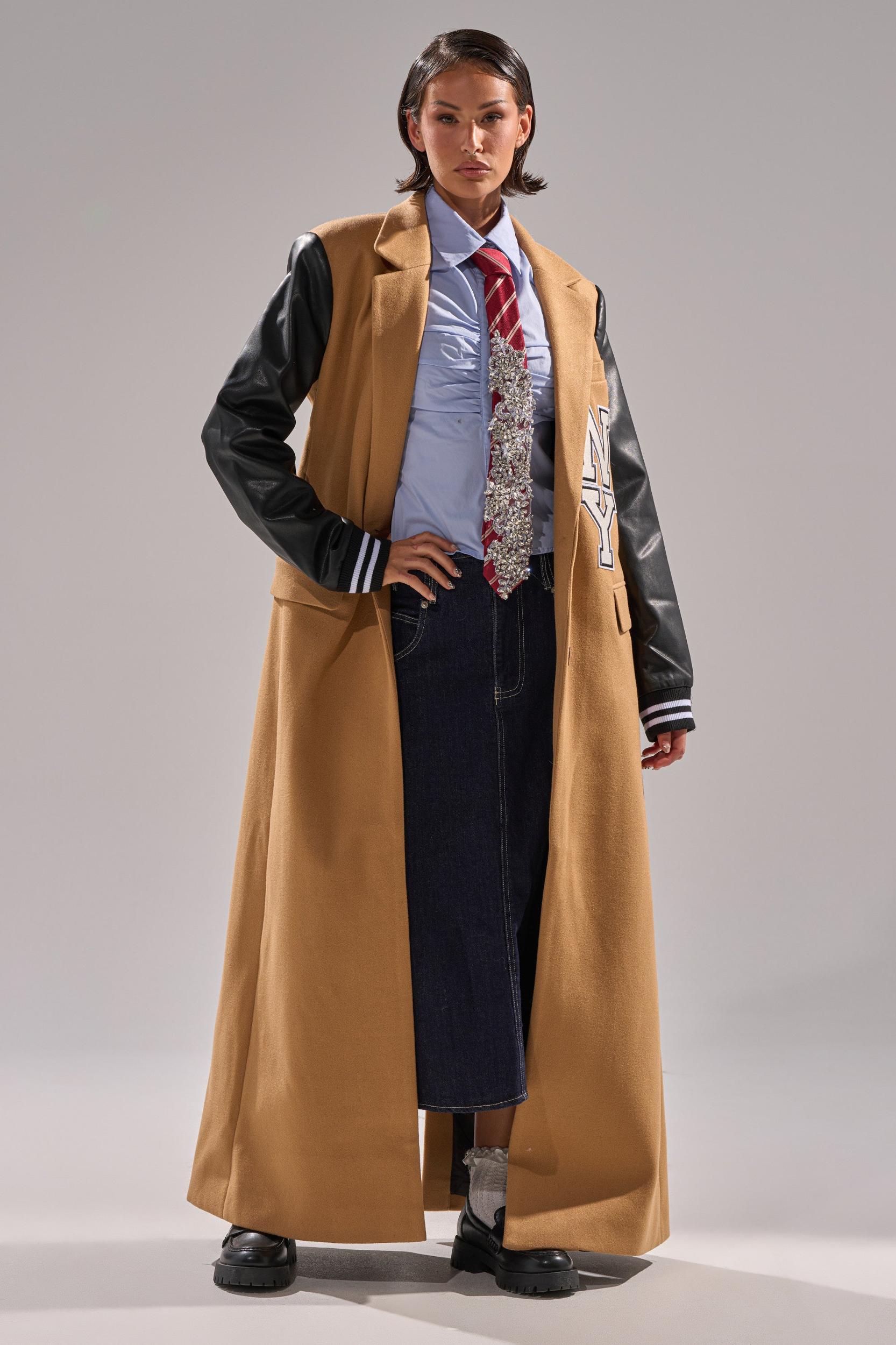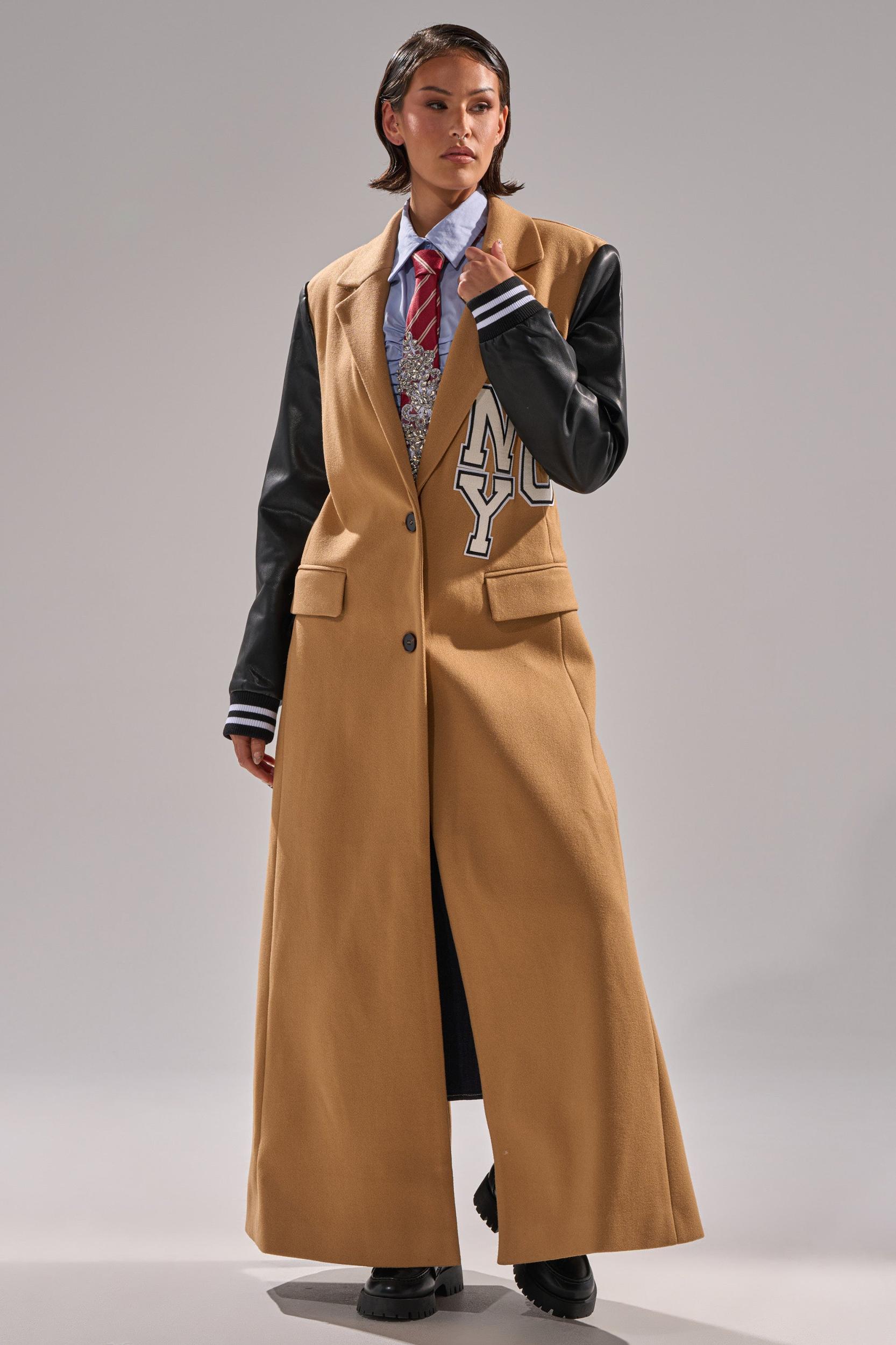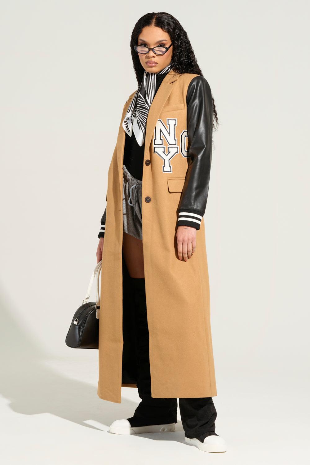 Look studiously sweet this chilly season in The AKIRA Label Brentwood 2.0 Varsity Trench. This chic outerwear piece is crafted from a wool-inspired knit base and features a notch lapel collar, slightly padded shoulders for natural shaping, contrast faux leather long sleeves with ribbed knit cuffs that boast striped detailing, contour stitching, a mock chest pocket, a contrast “NYC” letterman embroidered patch on one side, pre-sewn front flap waist pockets that can be opened up for functional use, and a sleek inner lining. Complete with a back vent flap, button front closures, and a longline silhouette. Pair with a chunky ribbed knit sweater, flared jeans, and stiletto booties for a sophisticated finish. - Shell: 100% Polyester, Combo: 50% PU 50% Polyester, Lining: 97% Polyester 3% Spandex- Dry Clean Only- Slight Stretch- Imported (all measurements approximate from size small)- 54” Shoulder to Hem- 24” Sleeves- 16” Shoulder to Shoulder- Model is 5’11” and is wearing size smallProduct ID: 440172 (all measurements approximate from size 1X)- 55” Shoulder to Hem- 26” Sleeves- 18” Shoulder to ShoulderProduct ID: 440176