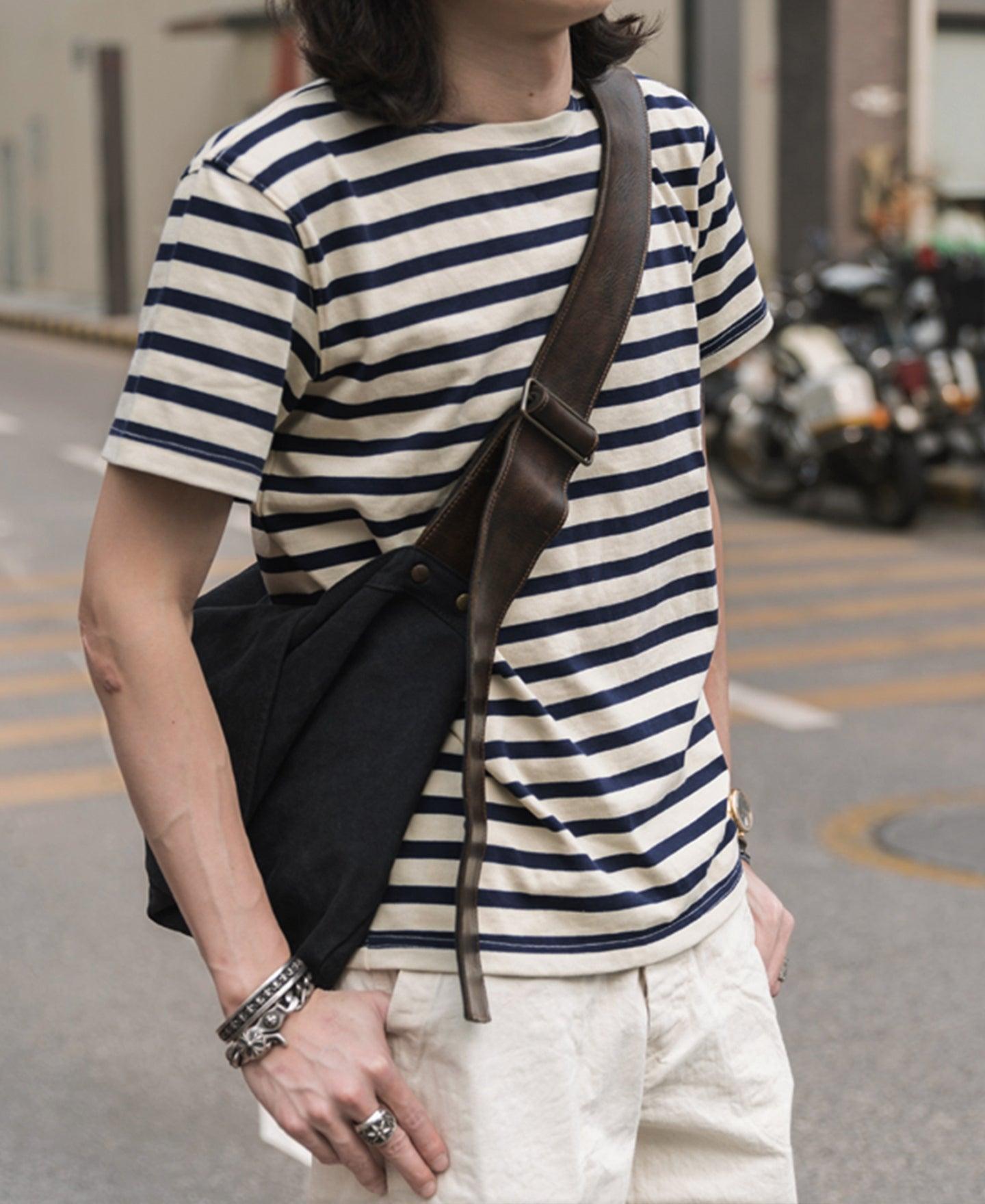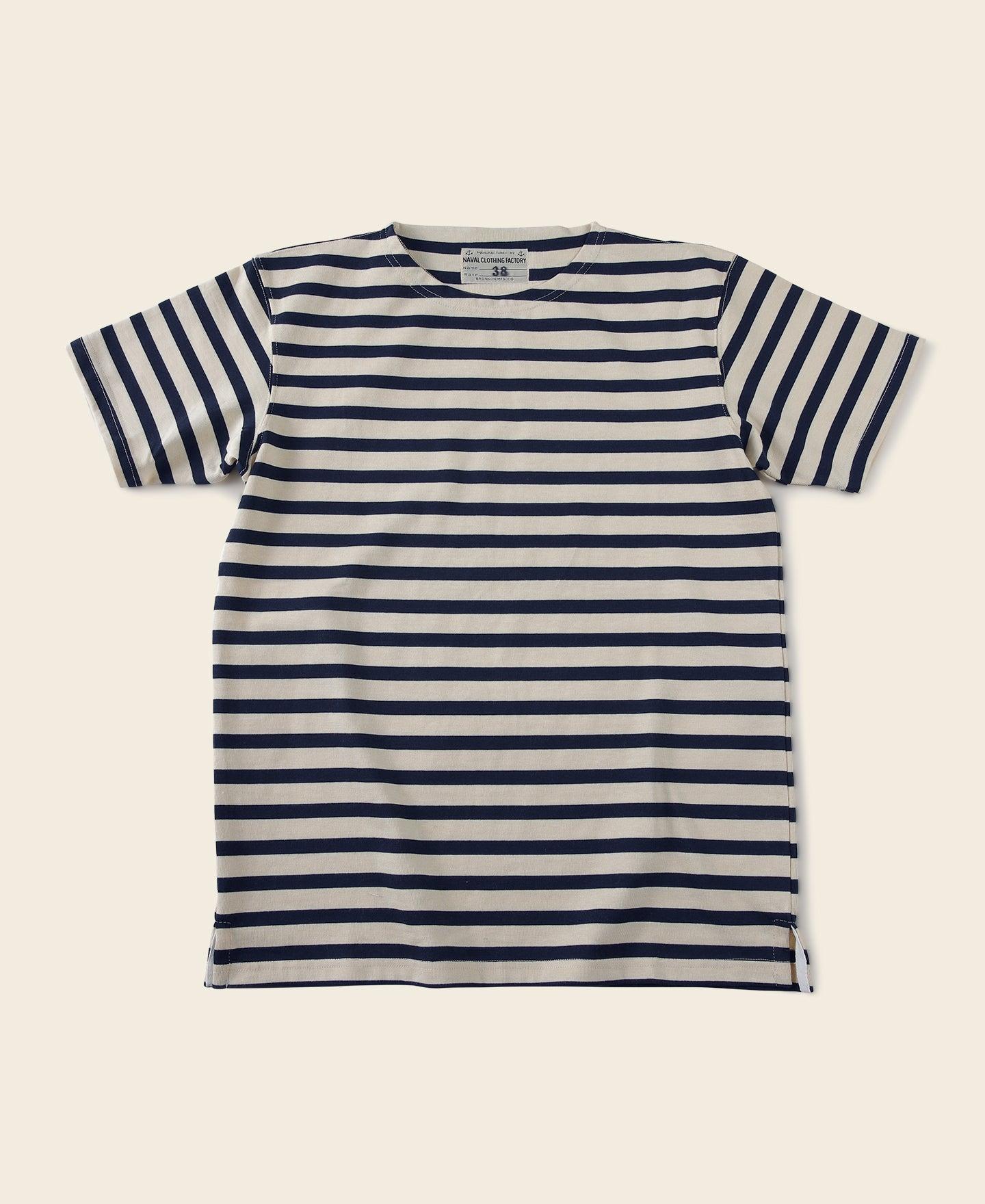 ◄DESCRIPTION On March 27, 1858, France passed the Bretton Stripe Shirt Act, which made blue and white striped knitted shirts part of the French sailor's uniform. It is believed that striped t-shirts help to find sailors who fall off the boat. Later, the striped t-shirt became the standard not only for the French Navy and fishing fleet but also for other navies around the world. It became fashionable a century later. The classic Bretton blue and white stripes are the symbols of the sailor, and the collar is also a prominent symbol of the French sailor's shirt. The collar's wonderful use is that it can quickly take off clothes after falling into the water, and won't jam the neck. ◄DETAILS Crewneck. Short sleeves. 9 oz. yarn-dyed cotton jersey, 100% cotton. Garment wash. Machine washable. Model measures: height 5' 10"/ 178cm, weighs 136lbs/ 62kg, and wears a size 38, wearing effect is fit. ◄SIZE & FIT Please carefully read the size info before purchase! Different products have different size info. Please use this info as a general guide as measurements are approximate. Model measures: height 5' 10"/ 178cm, weighs 136lbs/ 62kg, and wears a size 38, wearing effect is fit. IN CM Size Shoulder Chest 36 16.7" 37.8" 38 17.5" 39.4" 40 18.1" 40.9" 42 18.9" 42.5" 44 19.7" 44.1" Size Sleeve Length 36 6.9" 25.2" 38 7.3" 26" 40 7.7" 26.4" 42 8.1" 26.8" 44 8.3" 28" Size Shoulder Chest 36 42.5 cm 96 cm 38 44.5 cm 100 cm 40 46 cm 104 cm 42 48 cm 108 cm 44 50 cm 112 cm Size Sleeve Length 36 17.5 cm 64 cm 38 18.5 cm 66 cm 40 19.5 cm 67 cm 42 20.5 cm 68 cm 44 21 cm 71 cm In order to best determine fit, it may be helpful to compare our garment’s measurements to a similar garment you already own. Lay your garment on a flat surface and take all measurements from the outside of the garment. Click here to check out our Garment Measuring Guide. ** If you are still confused, you can Contact Us to help you choose the size. ** ◄SHIPPING & RETURNS Free shipping on orders $99 (U.S. dollar), Otherwise, a shipping fee of $6.99 will be charged. Click here to see our full shipping policy. BRONSON offers 30 days returning period. Click here to see our full return & exchange policy. * All items must be returned in unused, original condition with tags attached. ◄FAQ Haven't found the answer you are looking for? Take a look at our Frequently Asked Questions or Contact Us.
