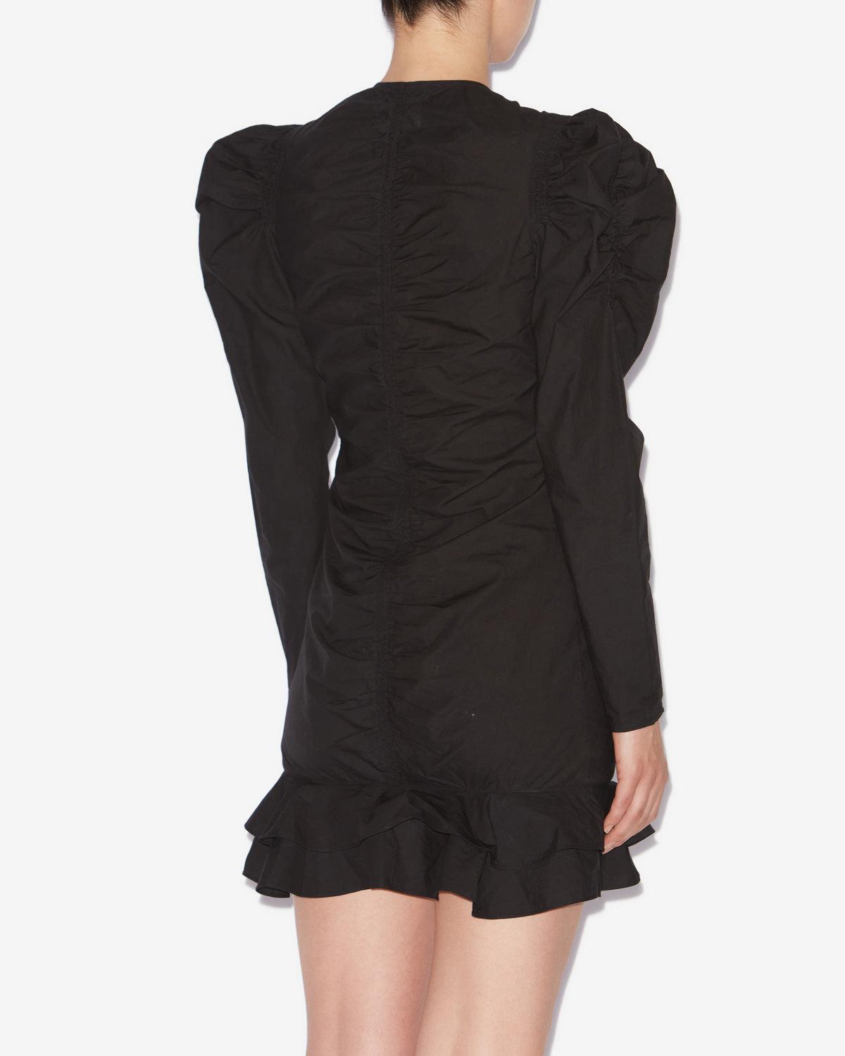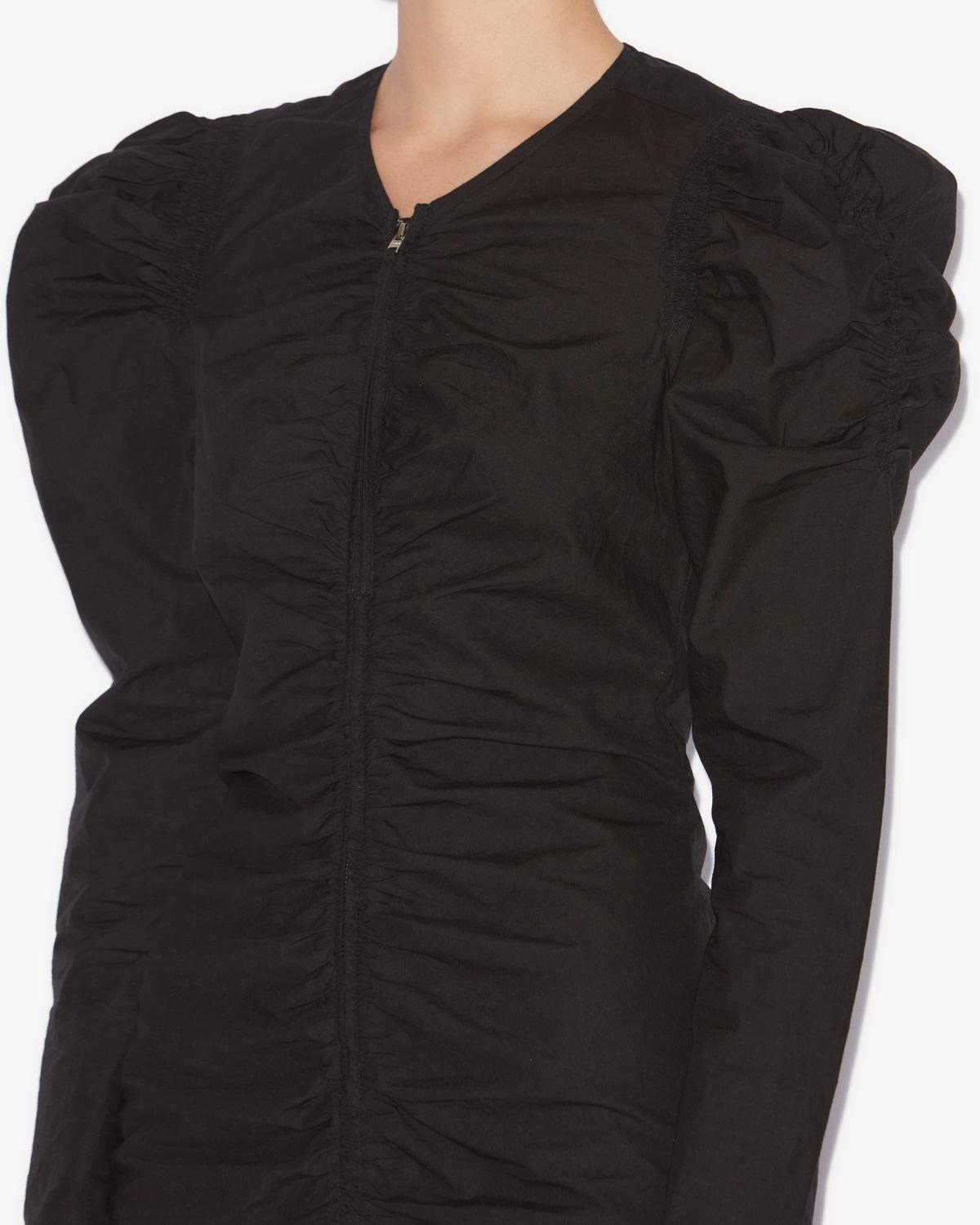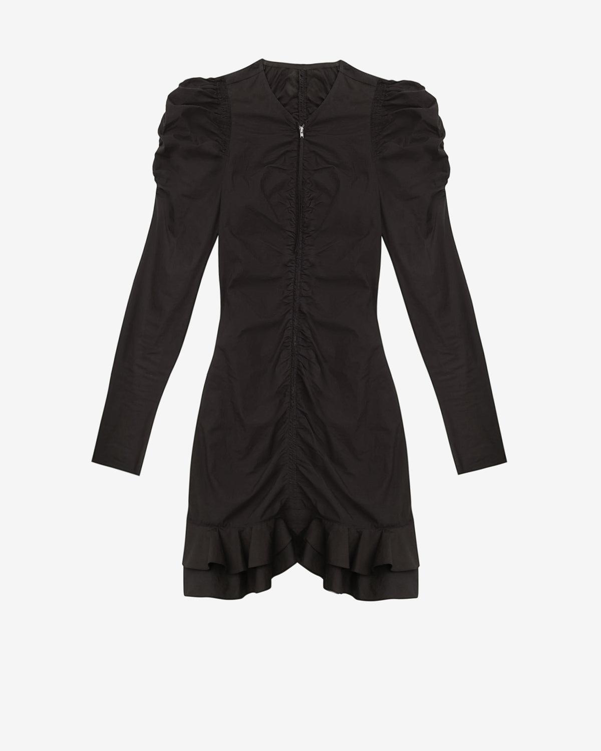 Gathered dress in crinkled plain-colored cotton V-neckline Gathered shoulders Long gigot sleevesZip-up front Long matching string Frilly hem Short and fitted cutStyle: RO0685FAC1J06E01BK BRIALI