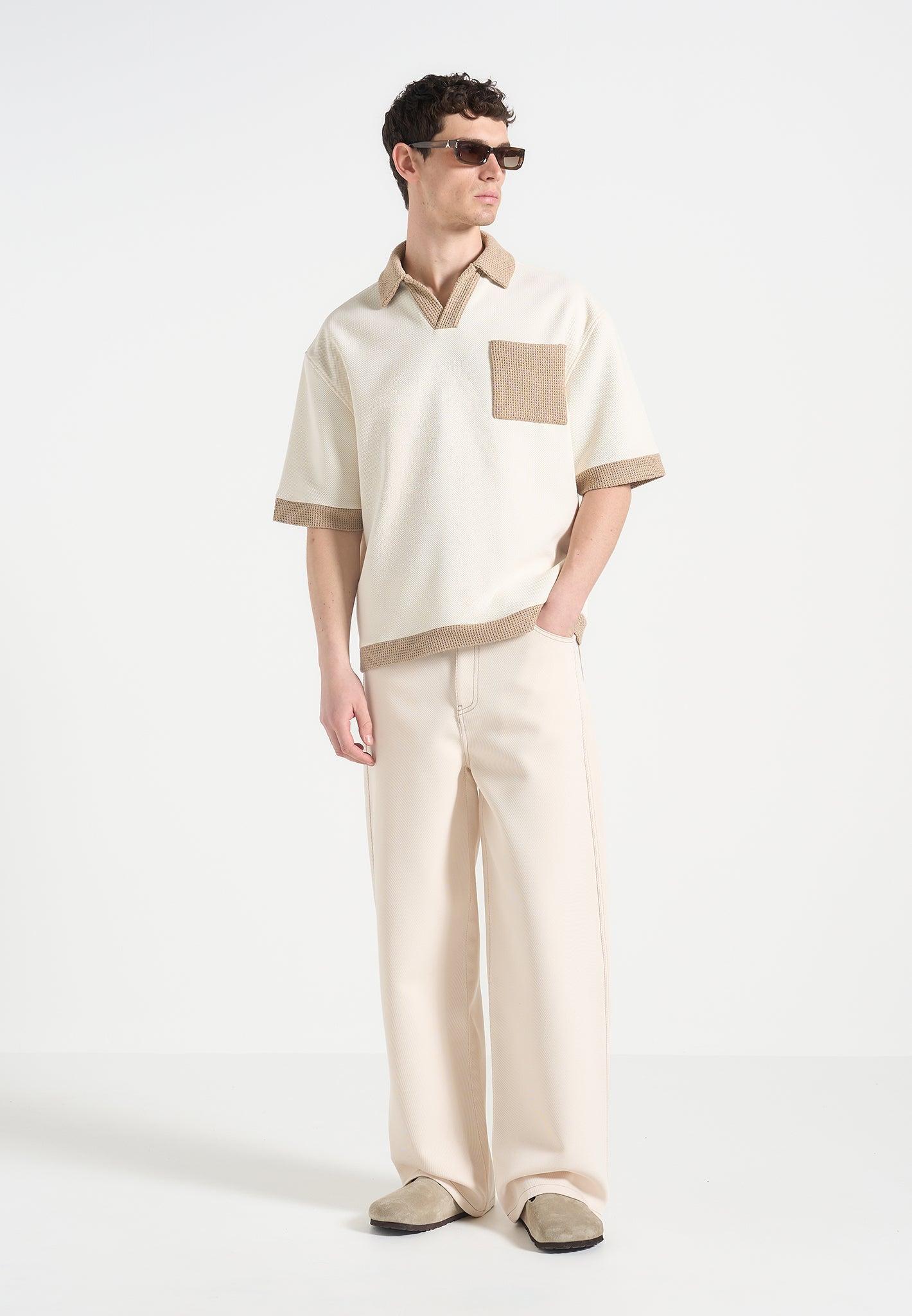 The Boxy Polo Shirt With Crochet Detail elevates a staple silhouette with contrasting texture and bold proportion. Framed by tonal crochet-knit accents at the collar, cuffs, hem, and patch pocket, the shirt blends softness with structure. Its exaggerated boxy cut provides balance, giving this piece a refined, tactile edge. Tonal Crochet-Knit Collar, Hem, and Cuffs Oversized Patch Pocket with Crochet Flap Boxy Silhouette for Sculpted Shape Soft-Touch Knit Base with Breathable Weight Short Sleeves with Drop Shoulder Cut Silver Manière De Voir Eiffel Plaque on Back 71% Tencel 27% Rayon 2% Elastane / 21% Rayon 76% Polyester 3% ElastaneAlways check the care label for wash instructions.