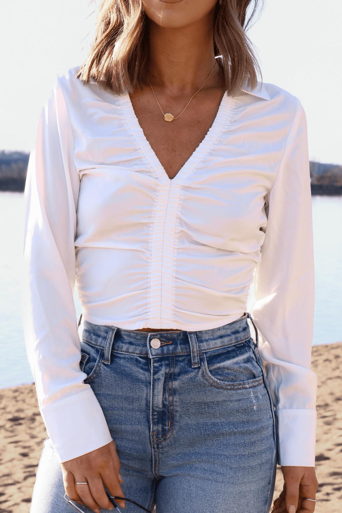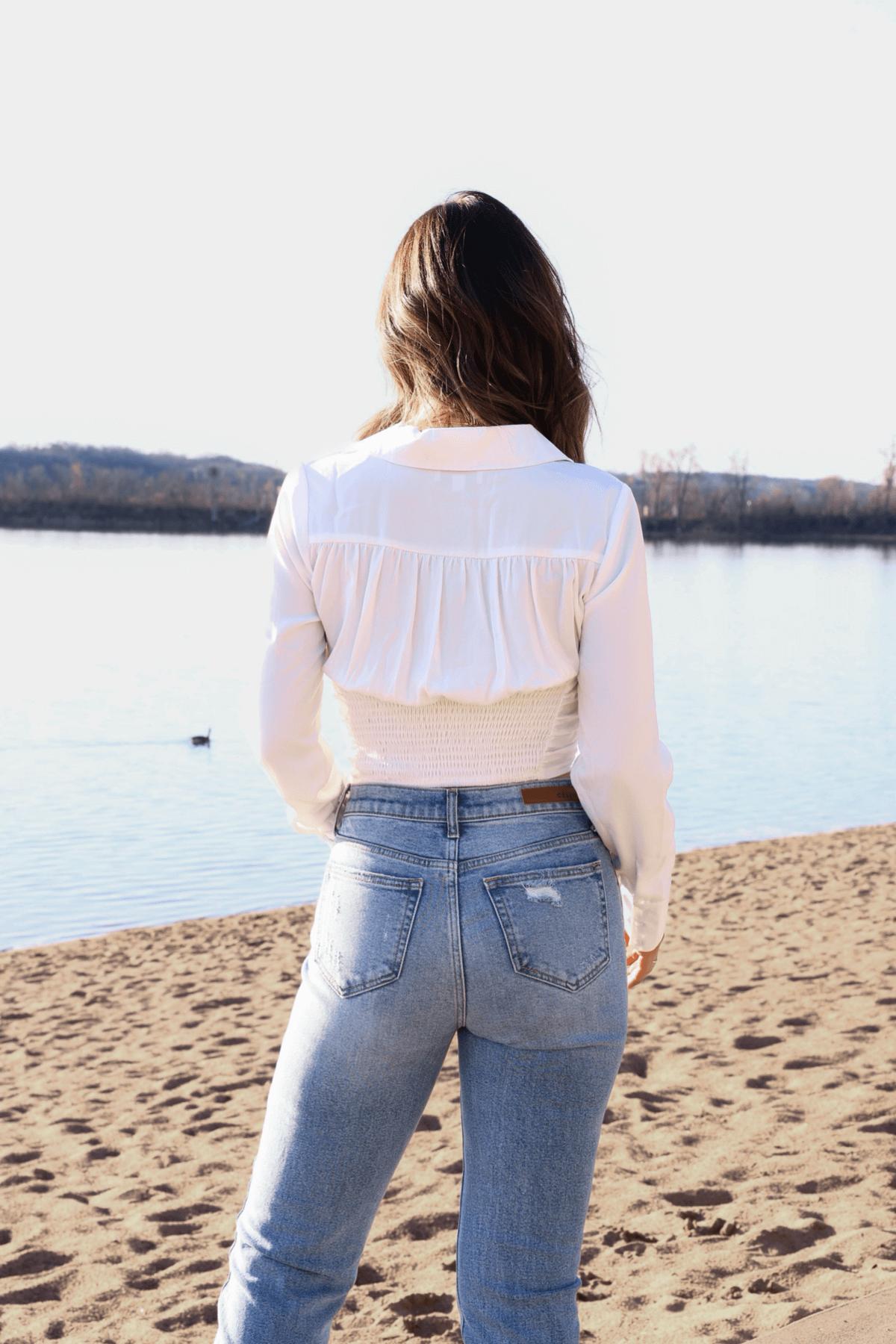 Meet the Bridal Bay Blouse — a romantic touch for your warm-weather wardrobe! Magnolia Exclusive! With a flattering cinched front, smocked back, and crisp collared V neckline, this dreamy long sleeve blouse blends soft structure with effortless charm. Whether you're headed to a bridal brunch, beachside dinner, or a summer celebration, it’s the perfect piece for elevated days and picture-perfect moments.
