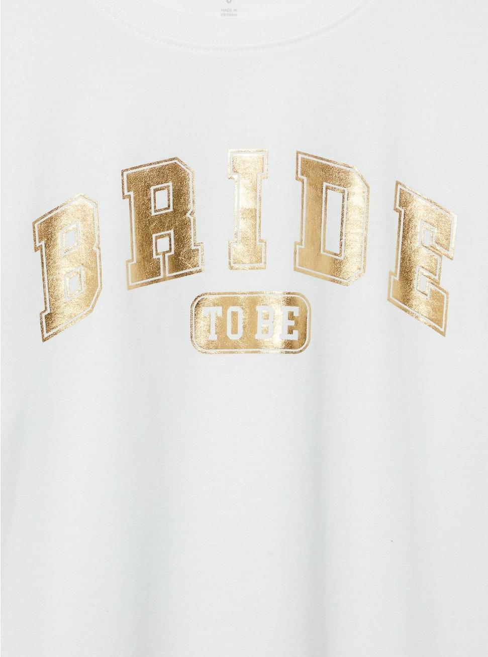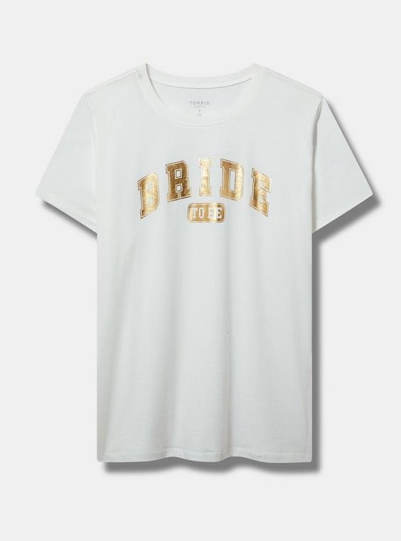 FITClassic fit: Fitted up top, eased through the body.Measures 30'' from shoulder (size 2).MATERIALS + CAREHeritage Jersey knit fabric: Your essential, textured cotton fabric.Stretch level: Maximum.100% cotton.Machine wash cold. Tumble dry low.Imported.DETAILS Crew neckline.Short sleeves.Bride to be graphic.