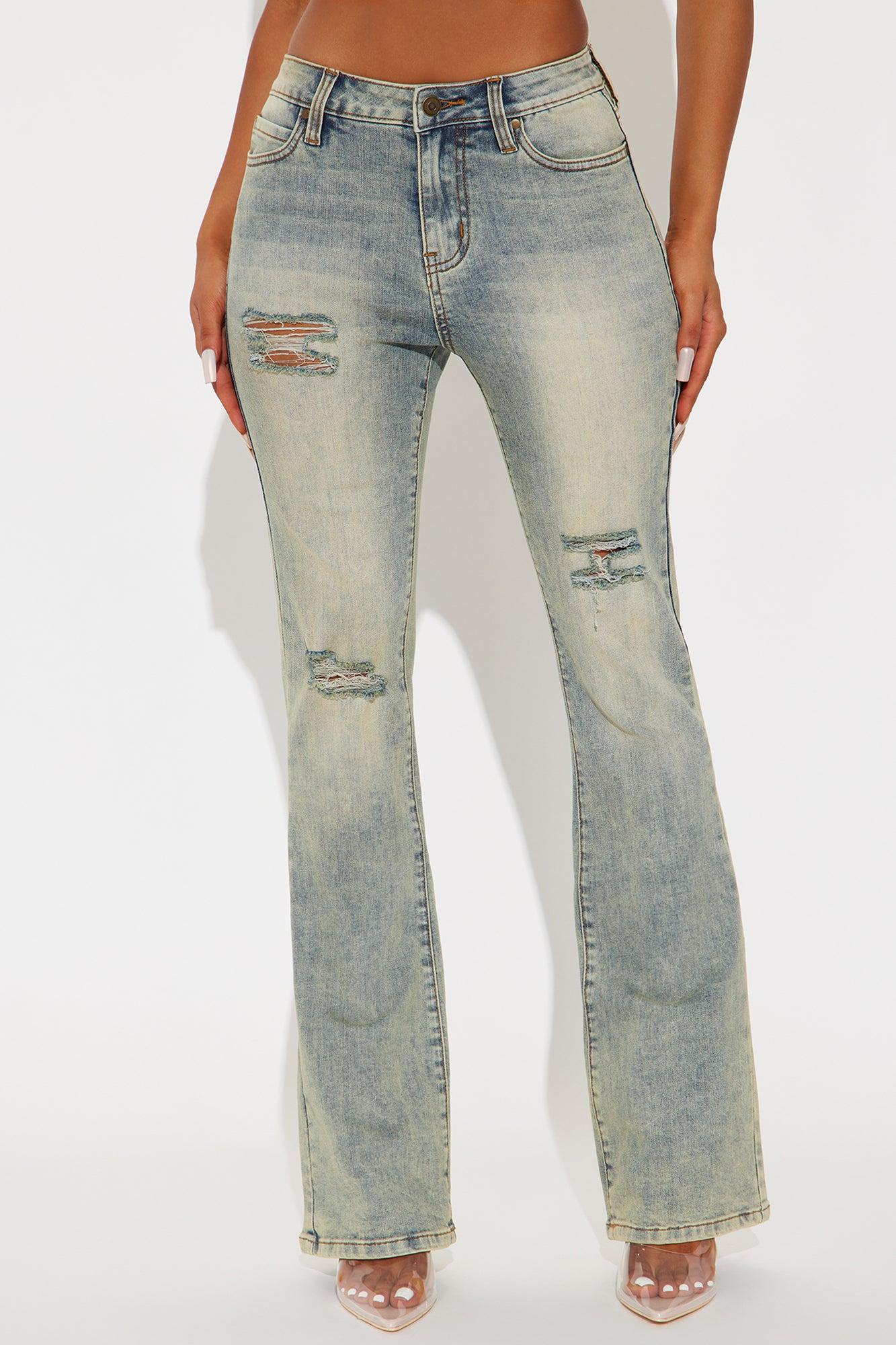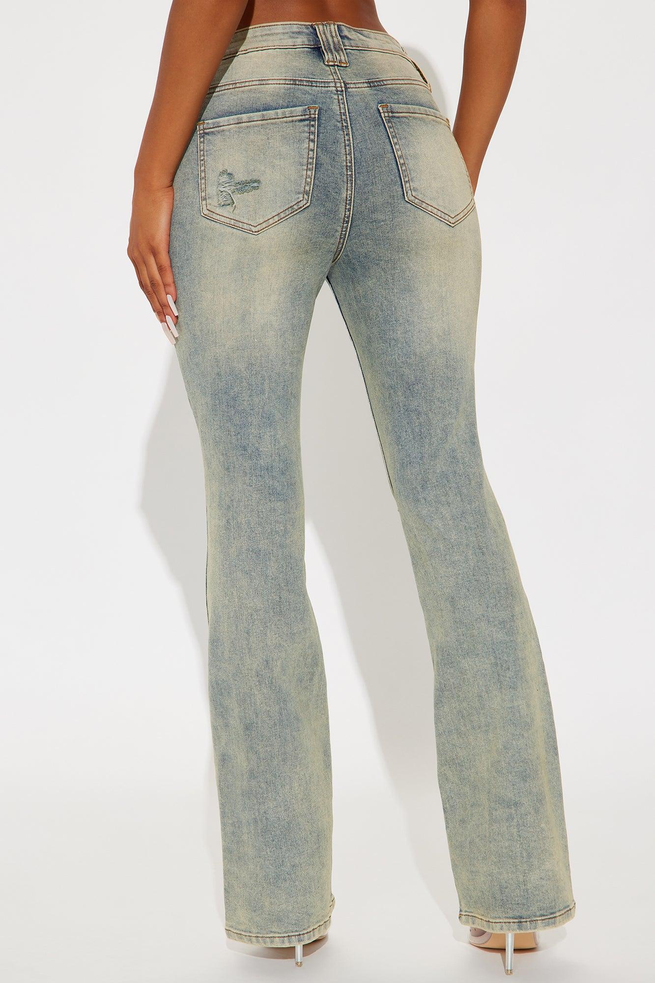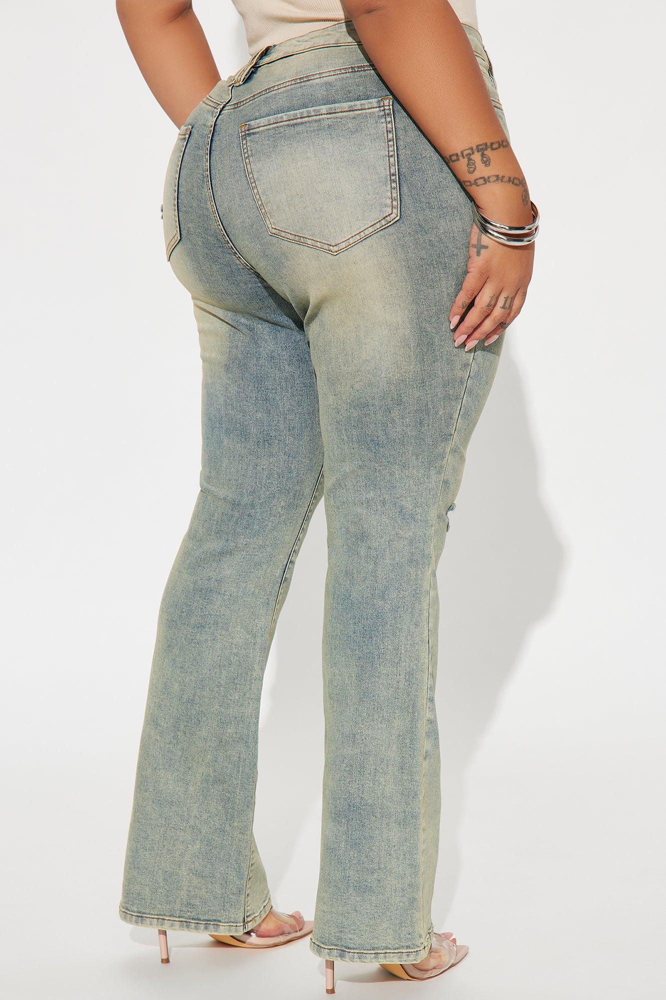 Available In Vintage Wash. Bootcut Jean 5 Pocket Medium Stretch Distressed 10.5" High Rise 32" Inseam 17.5" Leg Opening Disclaimer: Due To The Specialized Wash & Distressing Process, Each Garment Is Unique. 74% Cotton 21% Recycle Polyester 3% Polyester 2% Spandex Imported