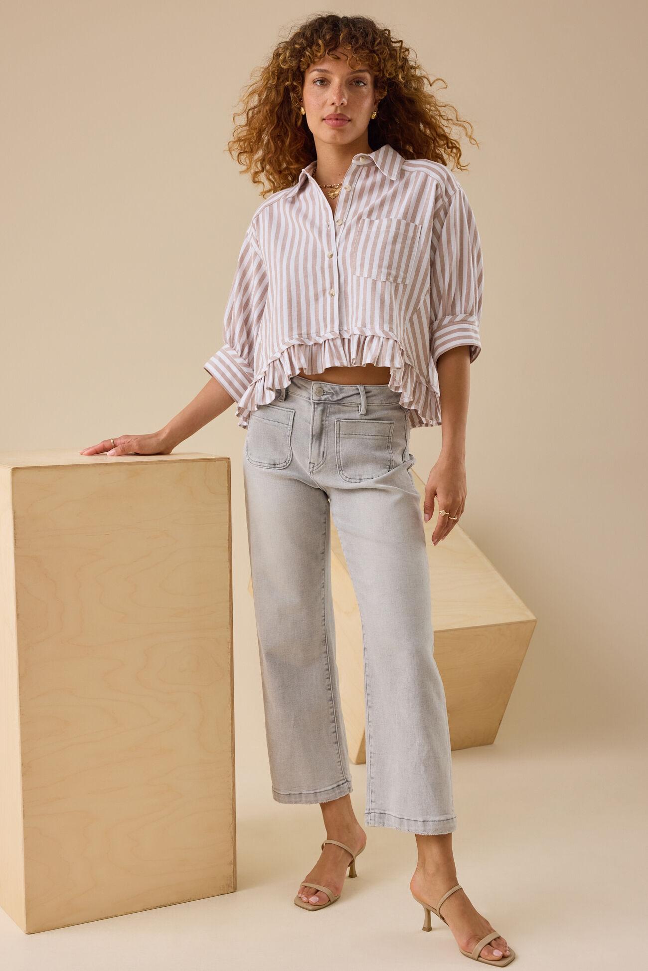 Embrace a touch of charm with this striped button-up top. The ruffled hem adds a sweet and unexpected detail, making this a fun and stylish piece.