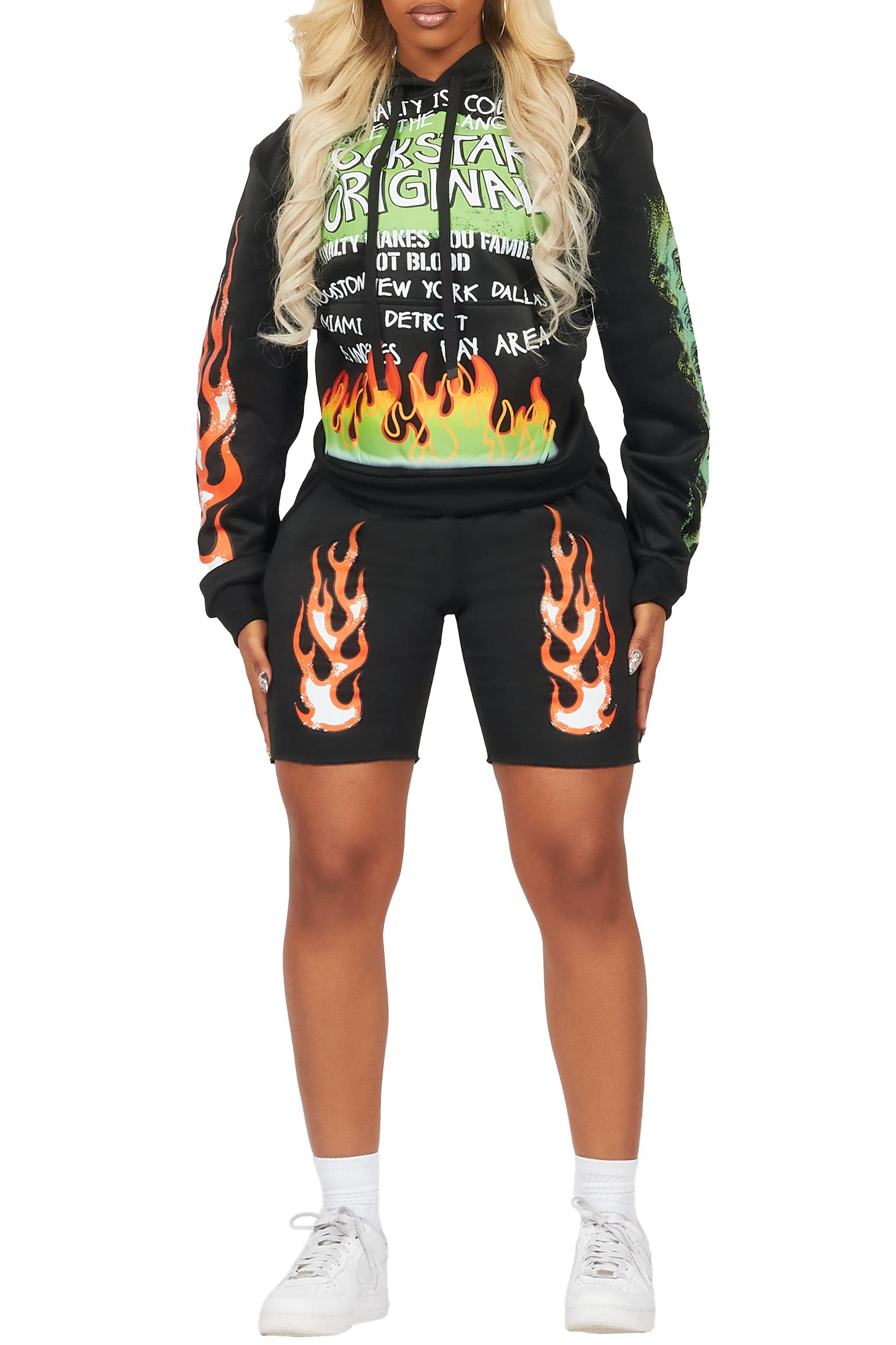An urban two-piece athleisure hoodie and short set for women in black. Designed with organic cotton and custom detailing for a lightweight everyday set. Drawstring hood Long sleeves Pullover style Kangaroo pocket Relaxed-fit Drawstring waistband Mid-rise waist line Dual slant pockets Form-fitting silhouette Bike short length Custom RSO graphics