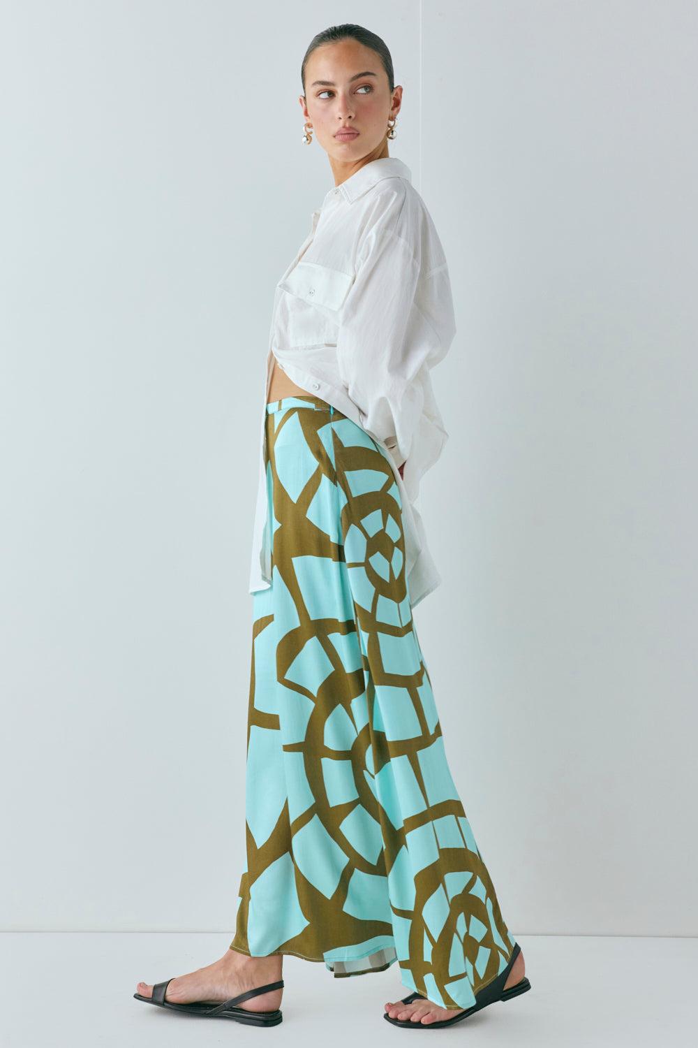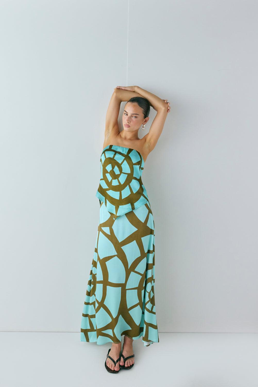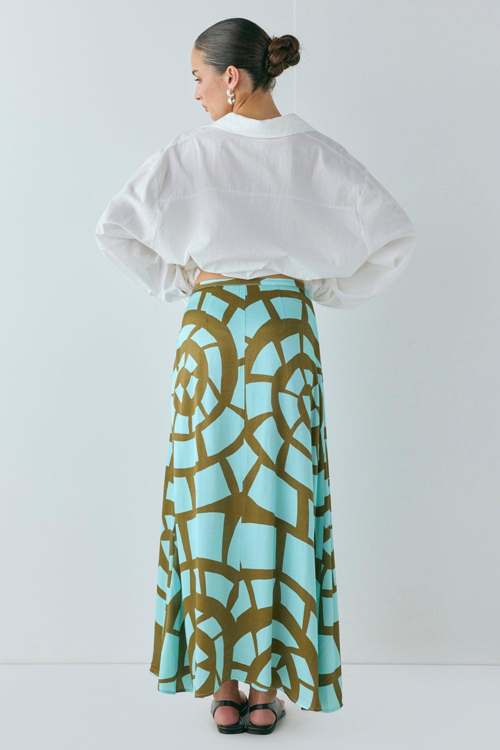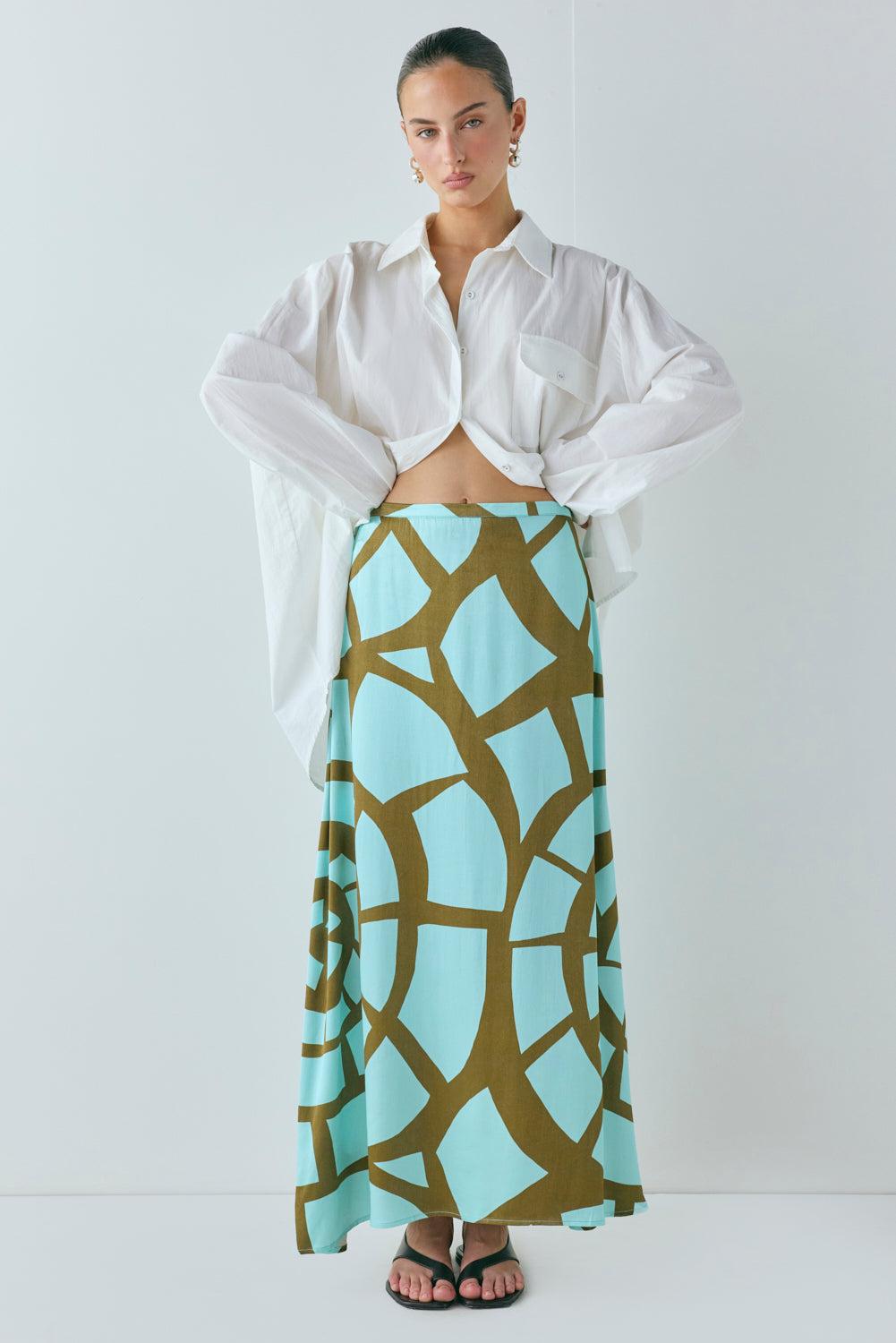 The Brie Midi Skirt Avi features an exclusive in-house print on a silky fabric. Designed in Australia.