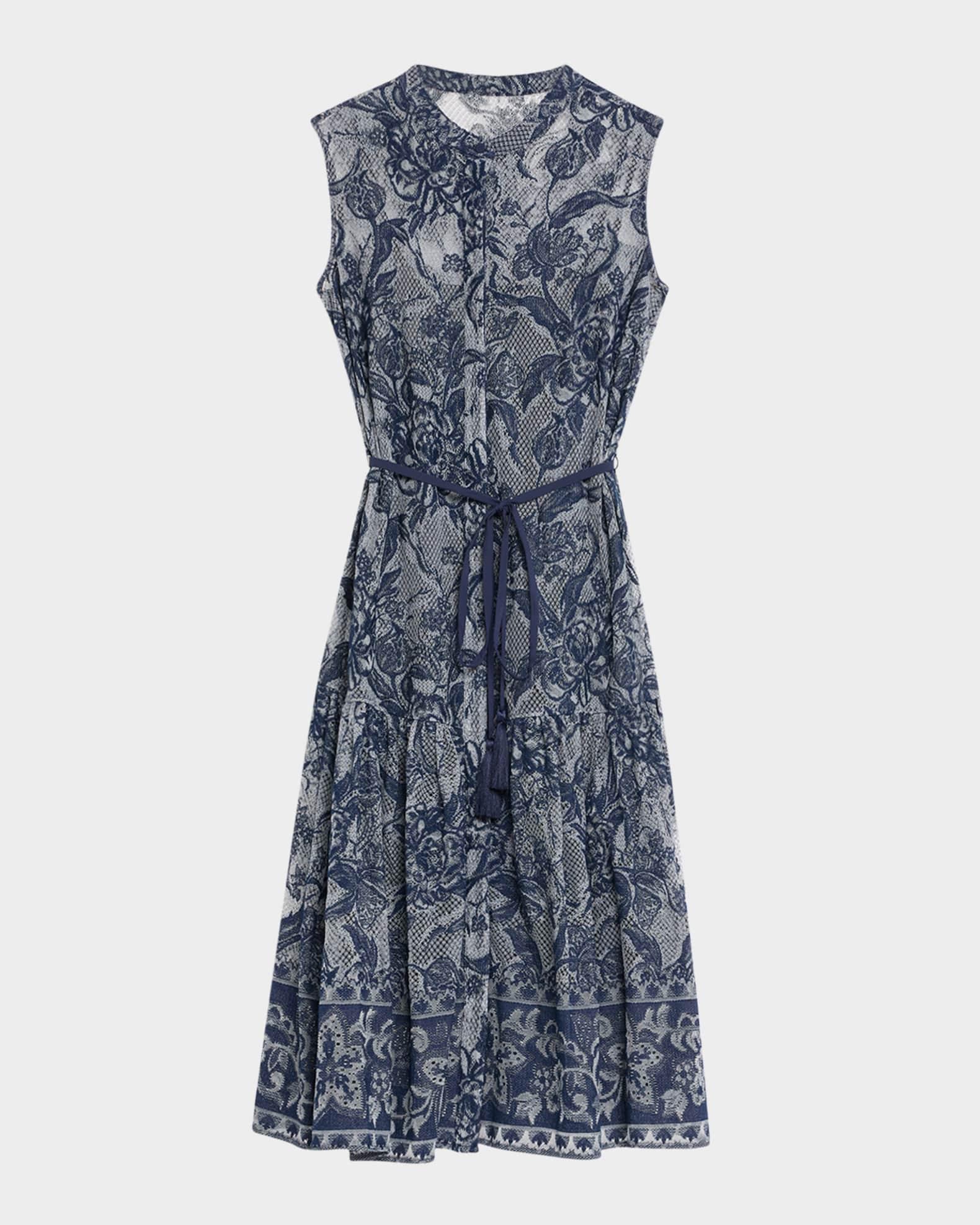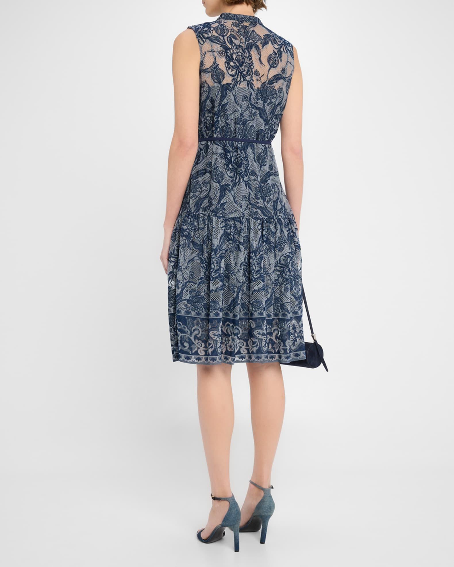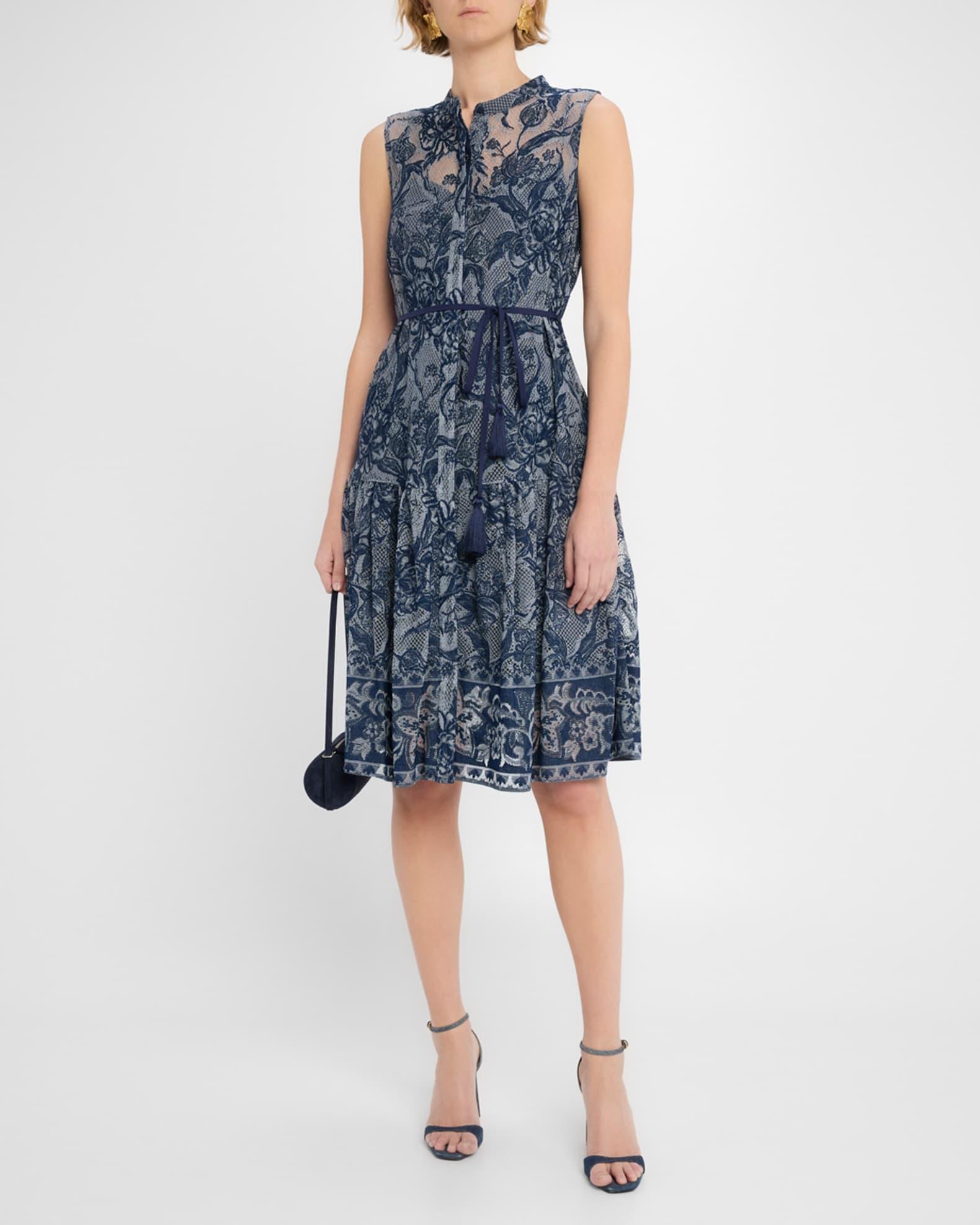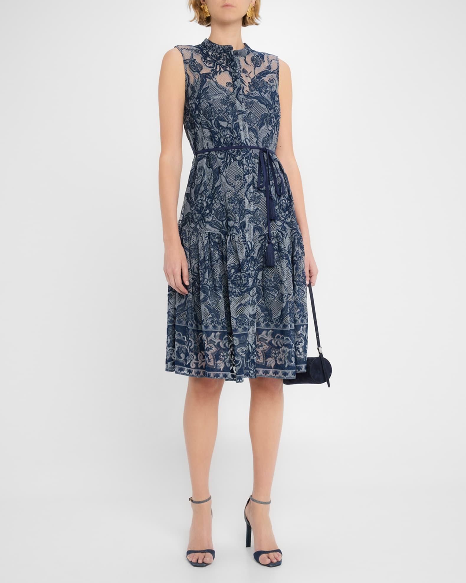 Kobi Halperin "Brien" midi dress in floral lace Band collar; concealed button front Sleeveless Waist self-tie Flounce ruffle hem Hem falls below the knee A-line silhouette Cotton/nylon/polyamide Dry clean Imported
