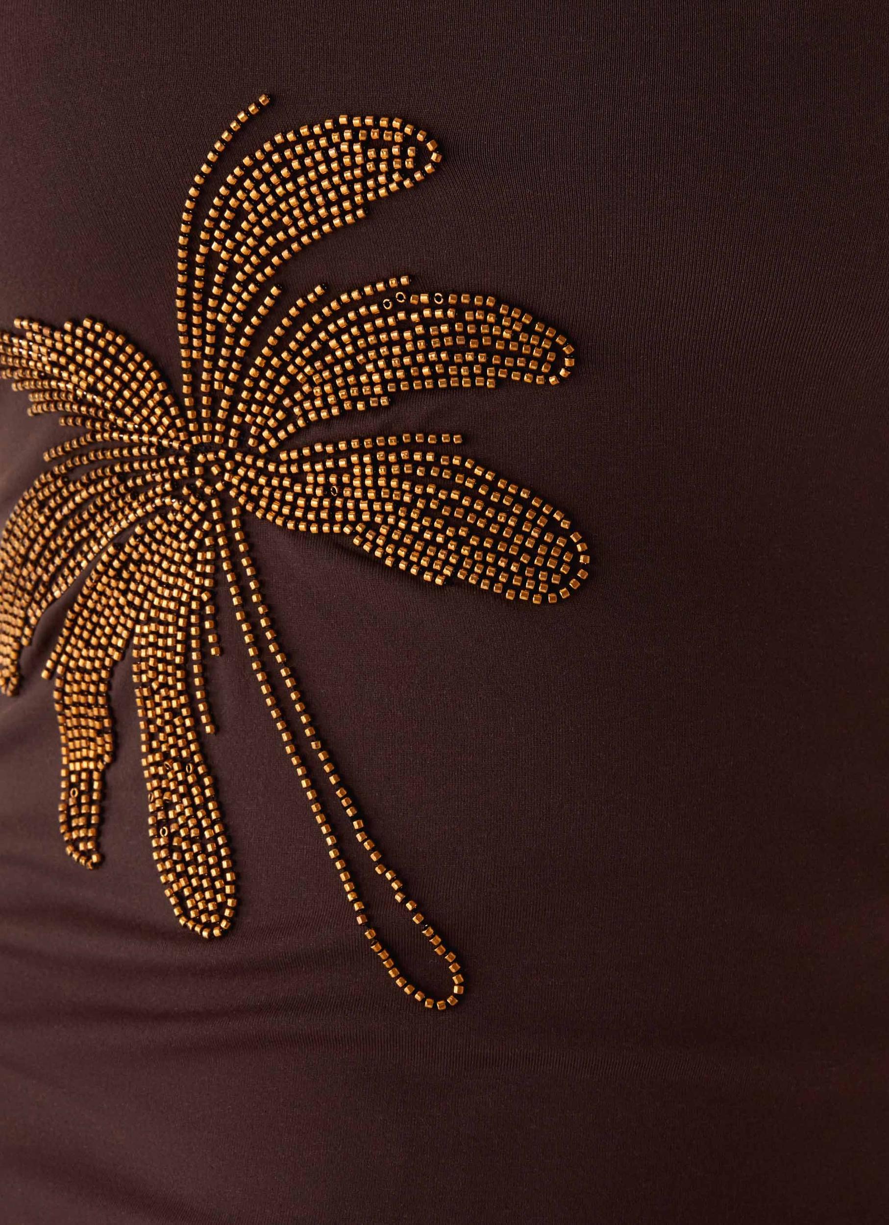 Peppermayo Exclusive The Brienne Beaded Halter Top is made for sun-kissed days that flow effortlessly into balmy evenings. Featuring a square halter neckline with adjustable straps and gold-printed embellishments, this crop-length style adds a playful, editorial edge. The low-back design and soft viscose blend ensure a flattering, comfortable fit. - Square halter neckline- Adjustable straps- Gold-printed embellishments- Low back- Fabric: 85% Viscose, 15% Nylon Size AU 8 / US 4 garment measurements:Bust: 67 cm / 26.38 inWaist: 61 cm / 24.02 inHem: 70 cm / 27.56 inLength: 30 cm / 11.81 in Roberta is 177cm and wears size AU 6 / size US 2
