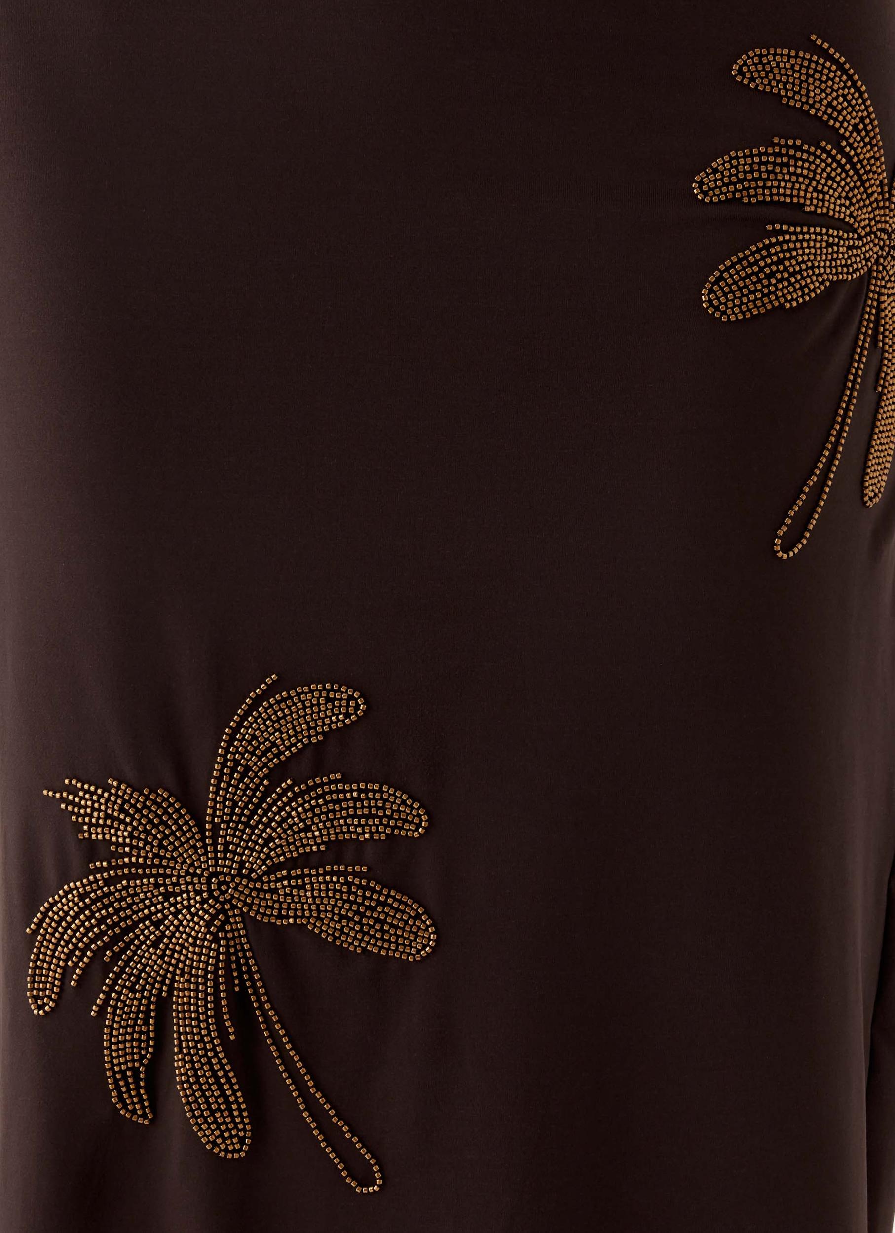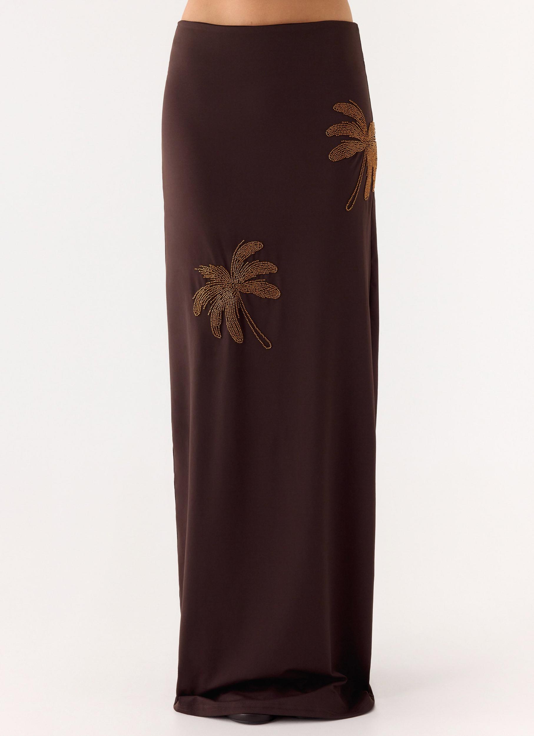 Peppermayo Exclusive The Brienne Beaded Maxi Skirt is made for evenings that shimmer from golden hour into nightfall. Featuring a low-rise, body-skimming fit with gold embellishments, this maxi-length style drapes effortlessly while stretch fabrication ensures comfort and ease of movement. Fully lined for a polished finish, it’s a confident, editorial-ready silhouette. - Maxi length- Low-rise, body fit- Gold embellishments- Fully lined- Stretch fabric- Fabric: 85% Viscose, 15% Nylon Size AU 8 / US 4 garment measurements:Waist: 71 cm / 27.95 inHip: 83 cm / 32.68 inLength: 111 cm / 43.70 inHem: 95 cm / 37.40 in Roberta is 177cm and wears size AU 6 / size US 2