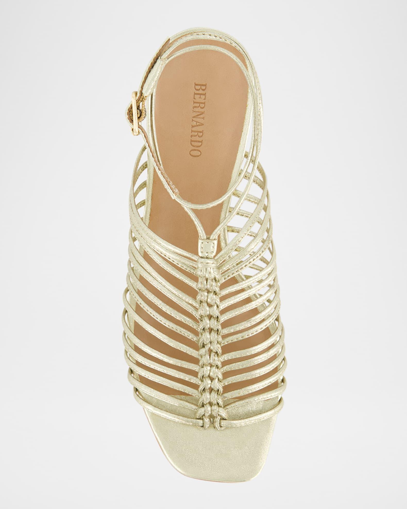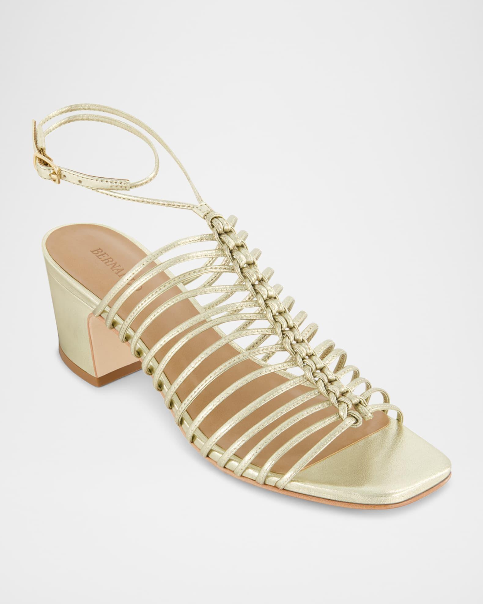 Bernardo "Briga" make a strong statement. This sculptural heeled metallic leather sandal showcases a conceptual woven upper that extends beyond the foot to artfully wrap around the ankle. A covered heel further elevates the original design with all-day comfort. 2.00 in / 50 mm block heel Open toe Caged vamp Adjustable ankle strap Leather outsole Lining: Leather Professional cleaning recommended Made in Brazil