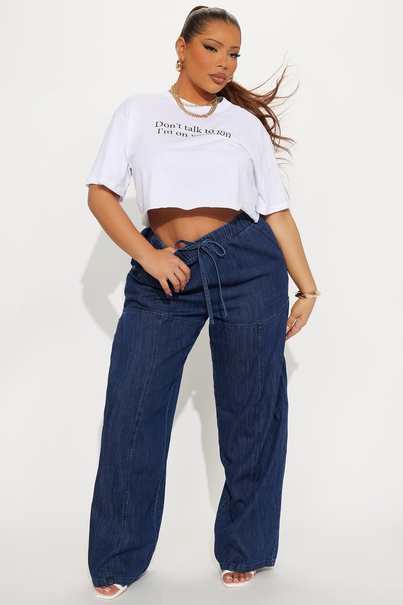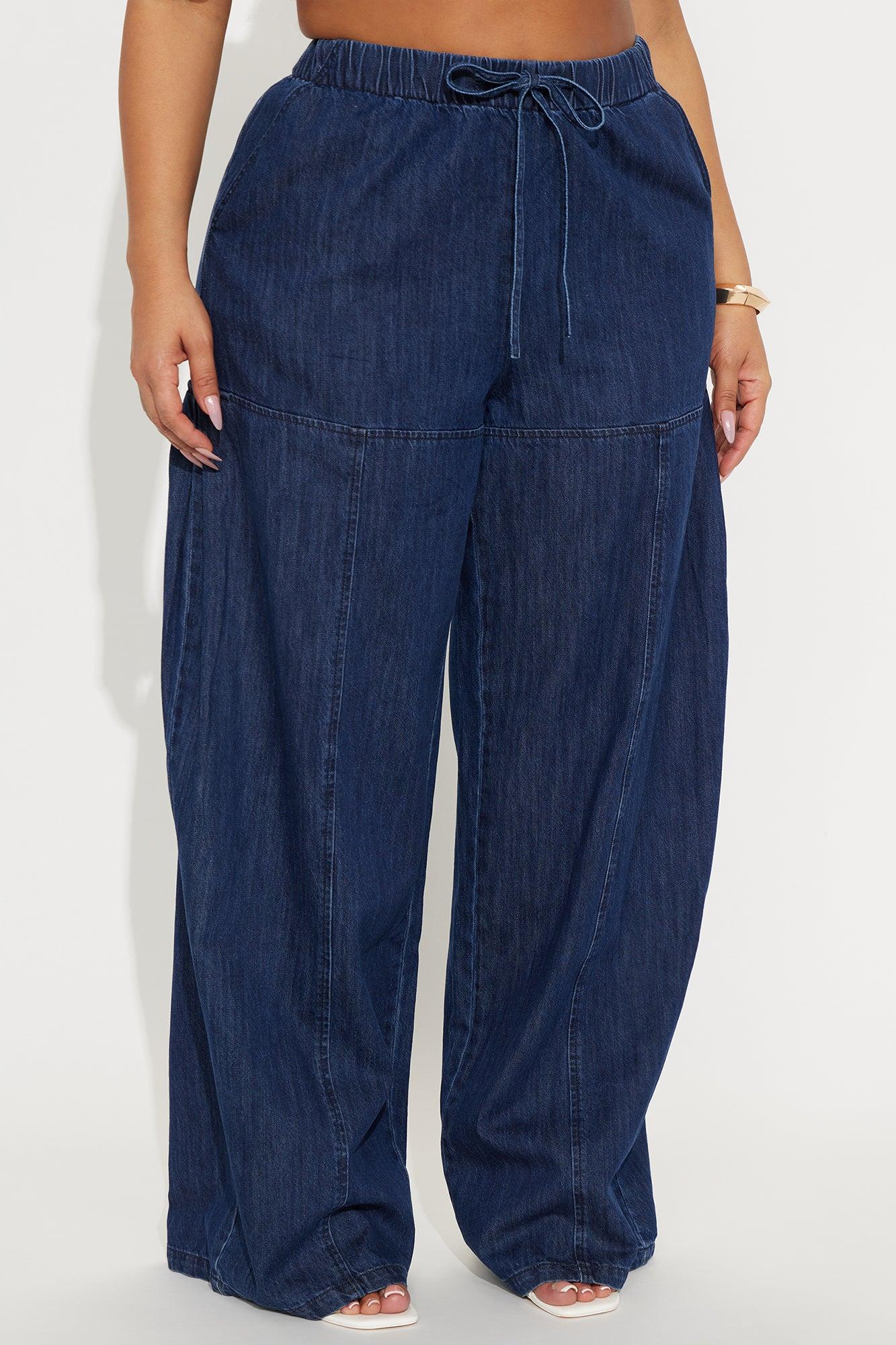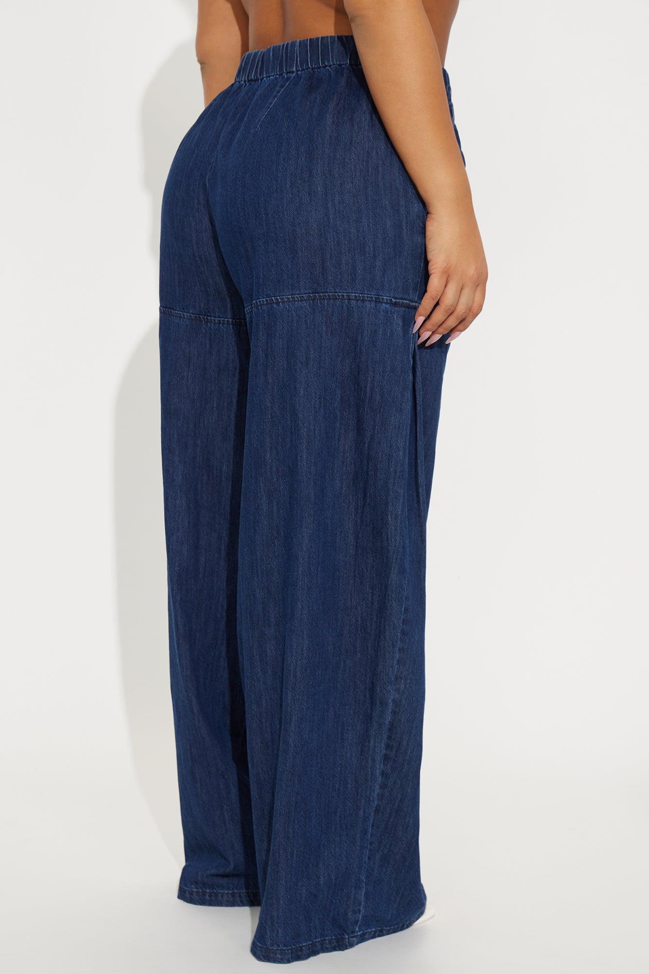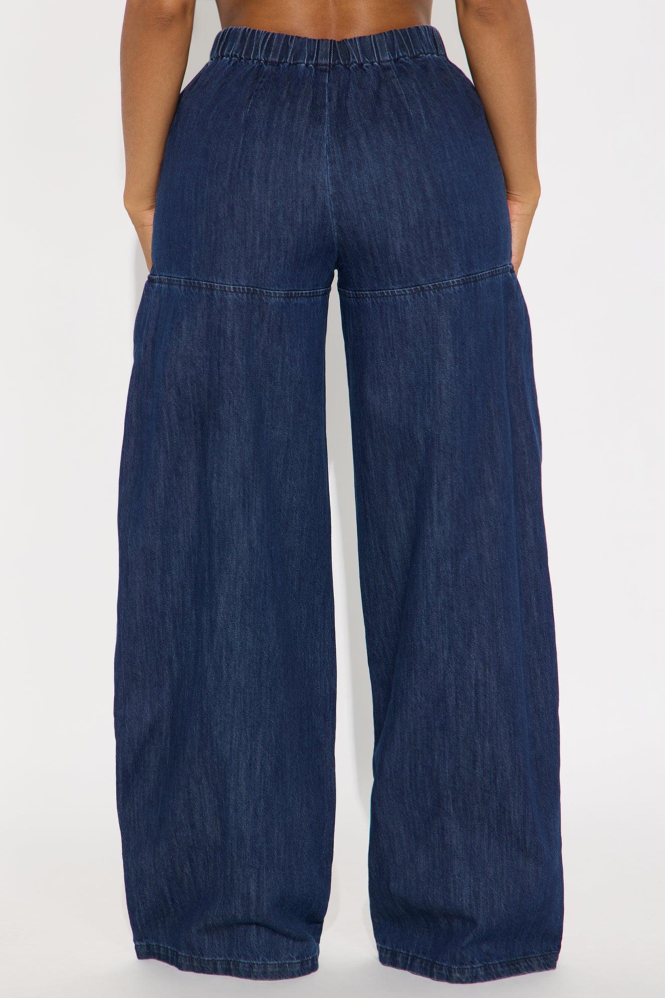 Available In Dark Wash. Wide Leg Pull On Jean Trouser Pocket Tie Waist Elasticized Waistband For Comfort 11.5" Rise 34" Inseam Non-Stretch Disclaimer Due To The Specialized Wash Process, Each Garment Is Unique. 98% Cotton 2% Spandex Imported