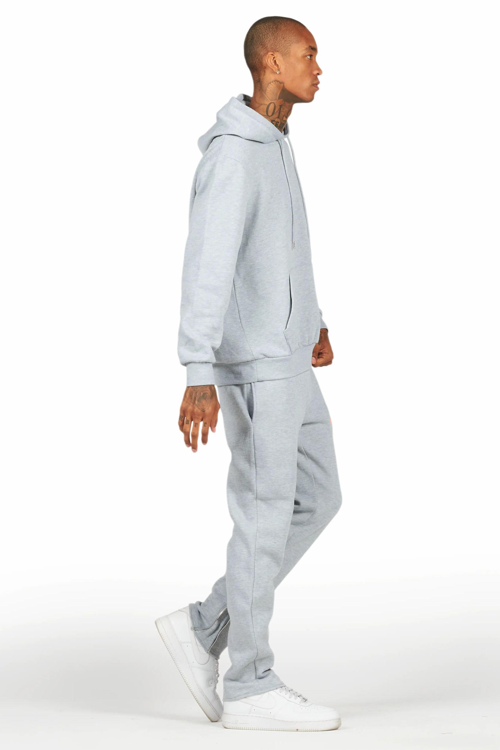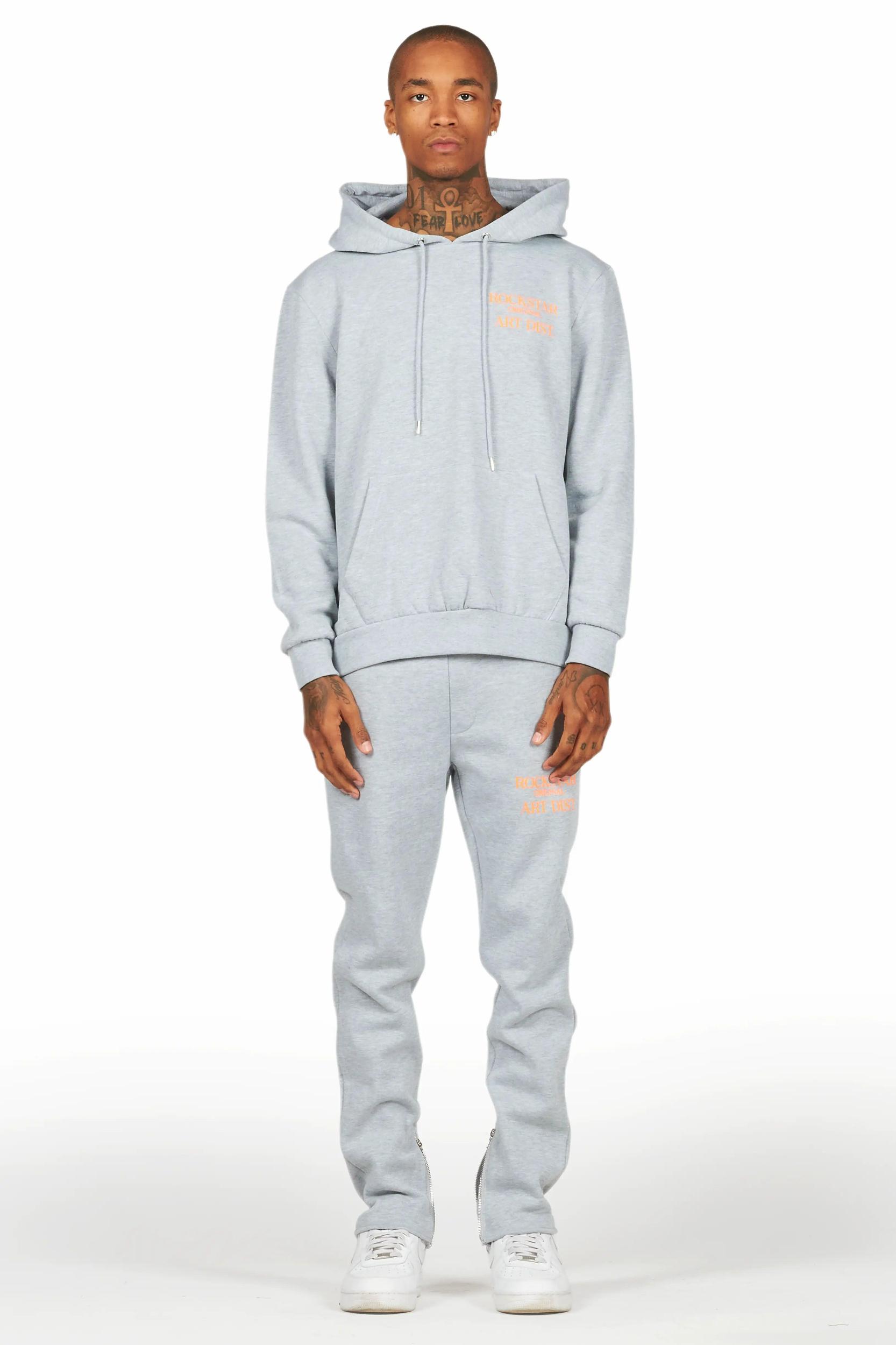 An urban two-piece slim-fit tracksuit set for men in grey. Designed with custom detailing for a dope streetwear set. Drawstring hood Kangaroo pocket Ribbed knit trims Drawstring waistband Slant zip pockets Printed RSO logos Ankle zipper seams Slim-fit