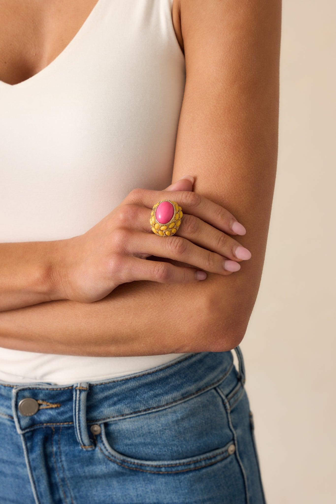 The Brighten Your Day Hot Pink Center Stone Cocktail Stretch Ring is a bold, statement accessory designed to add vibrant color and playful glamour to your style. Perfect for parties, special occasions, or anytime you want your look to stand out with a pop of hot pink and confident flair. This cocktail ring features a large hot pink center stone, surrounded by smaller yellow stones, a dome shape, gold textured base, and a gold beaded elastic stretch band.