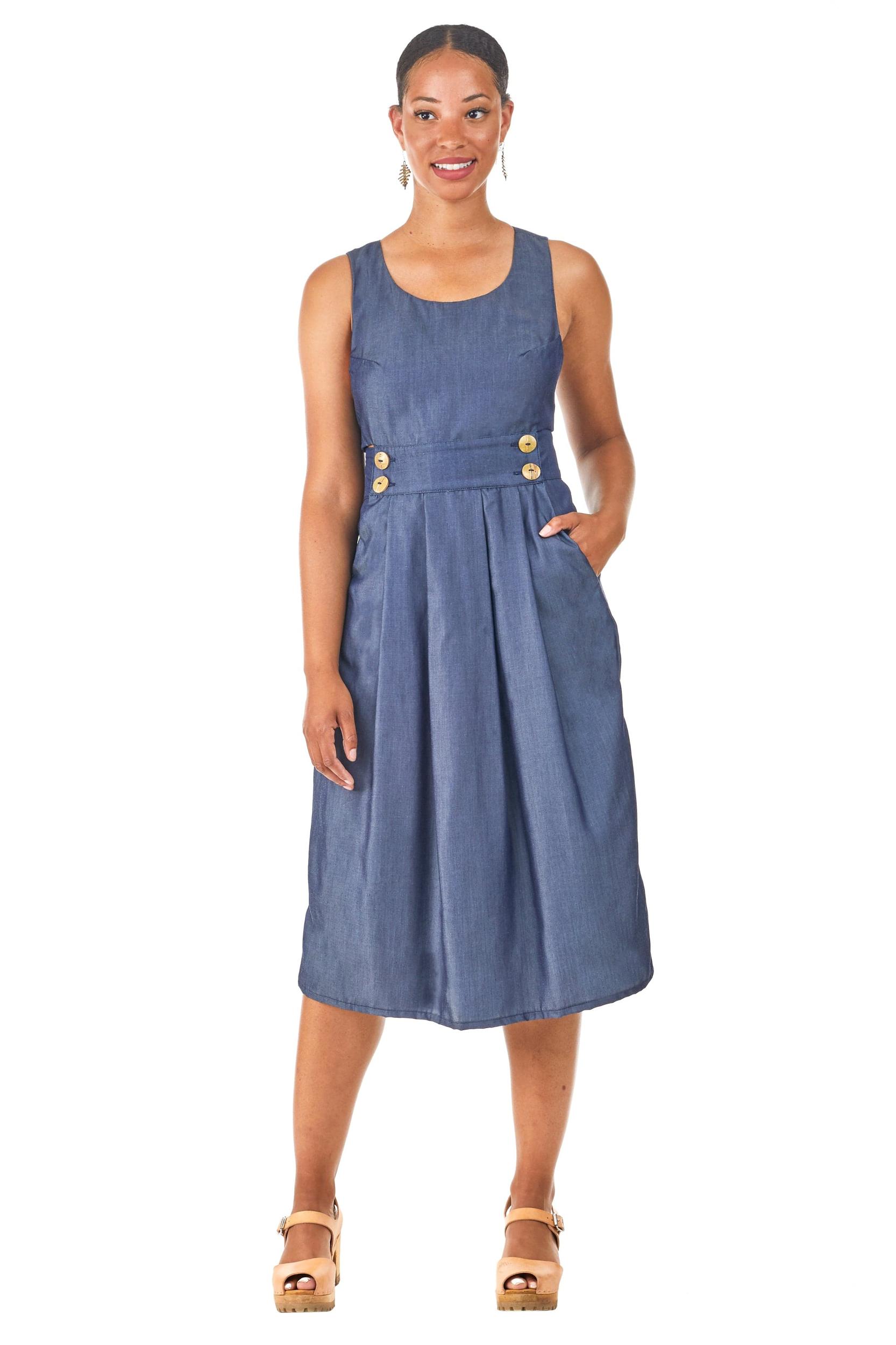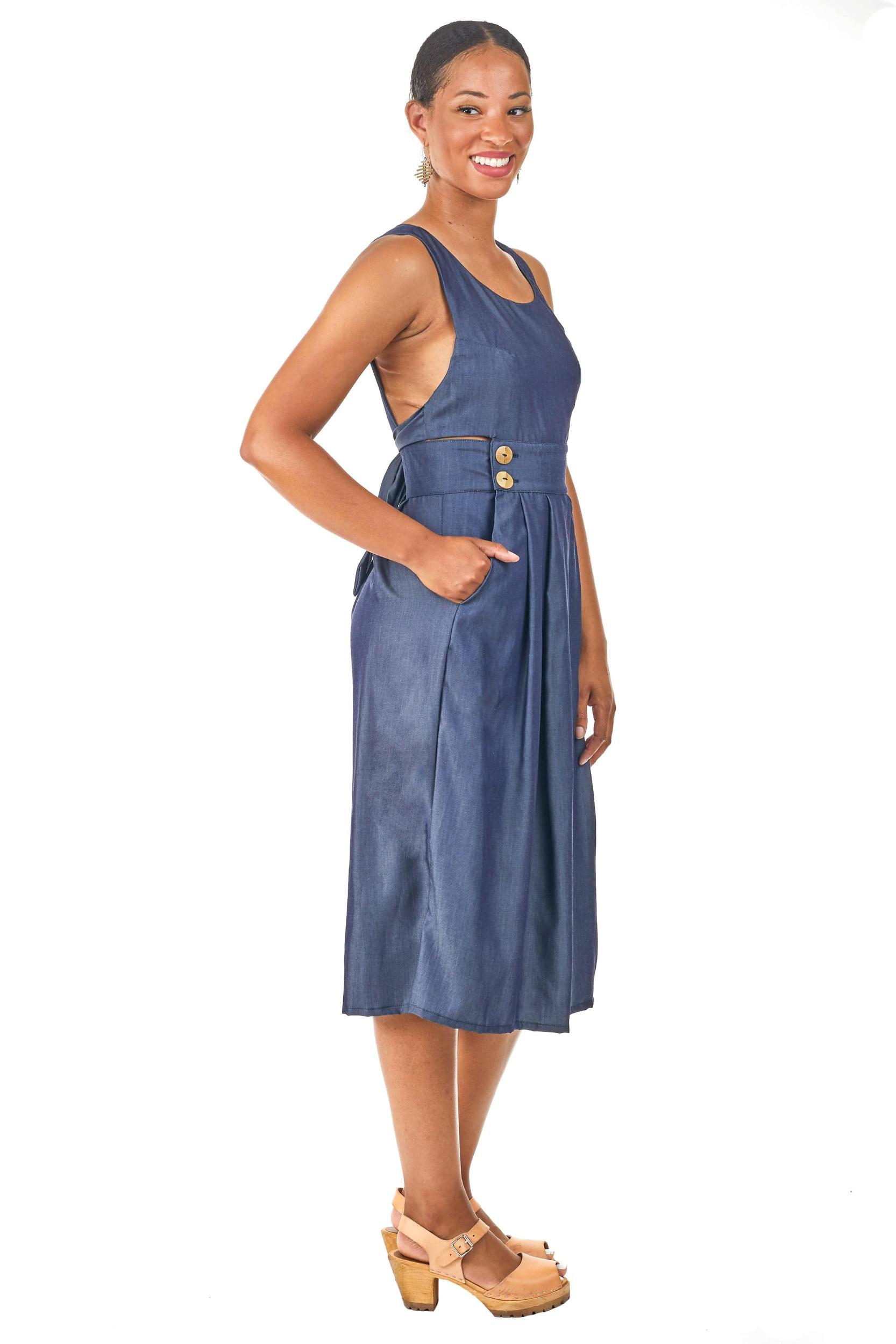 Bamboo button-up closure at the high waist. Long strap that ties around the low back. Added sexy touch with a little (not too much) side-boob. Wear with nothing at all or with a tank or shirt underneath.