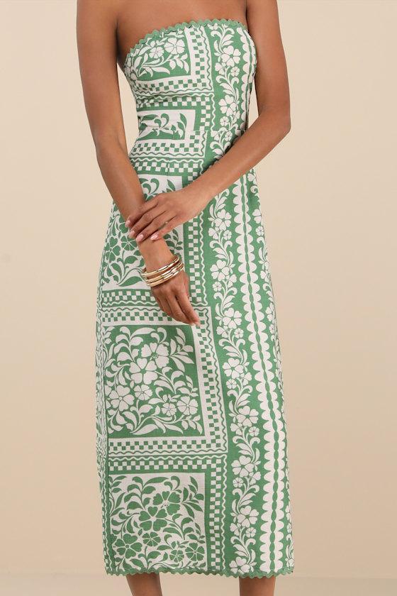 Feel like the epitome of spring whenever you step out in this floral midi dress, complete with a woven, linen-like cotton-blend fabrication that is perfect for warmer days. Cutesy rickrack trim accents the strapless bodice and the hem of the column skirt, which will perfectly skim your figure. Kick pleat, smocked panel, and a hidden zipper/clasp at back.