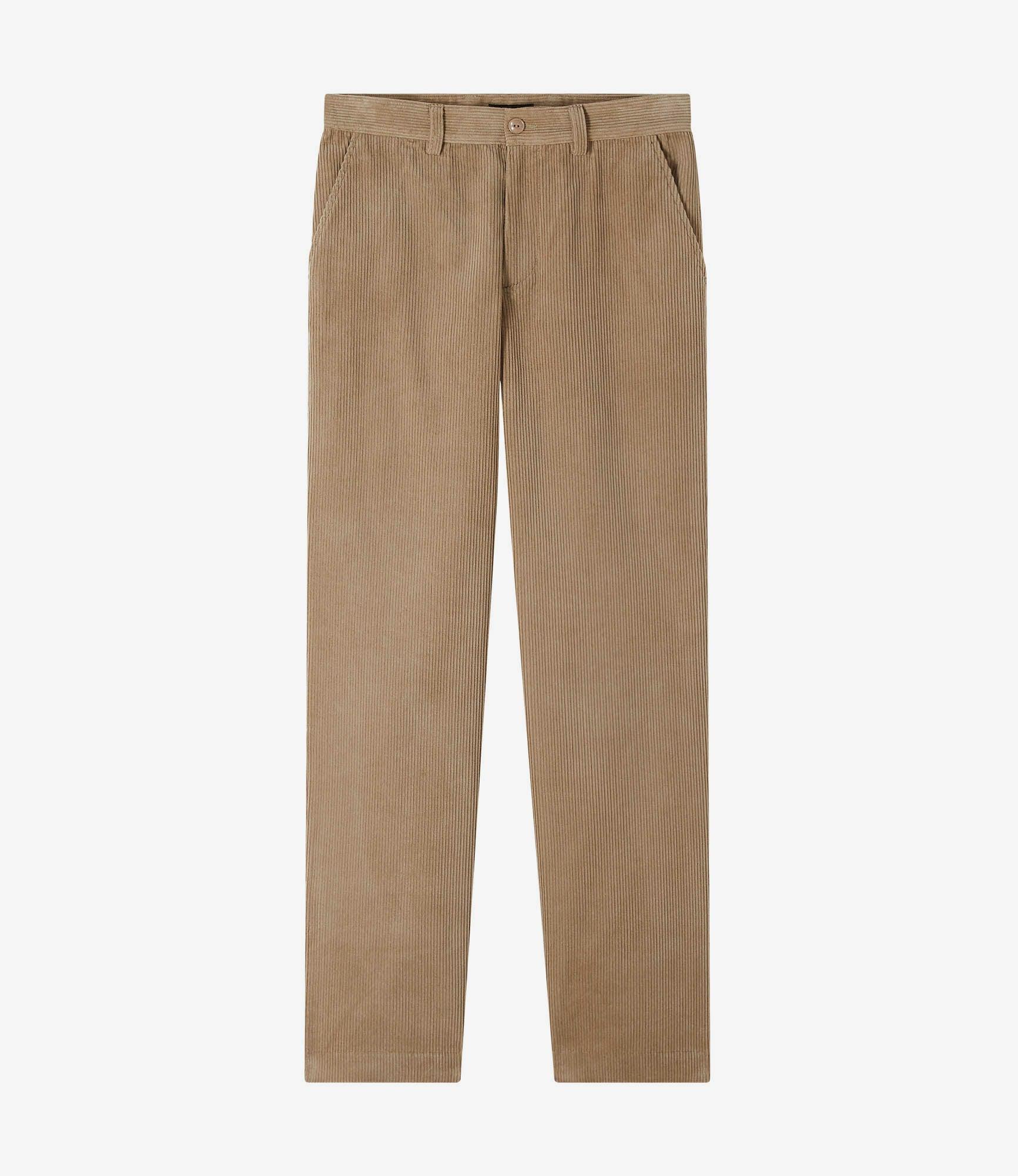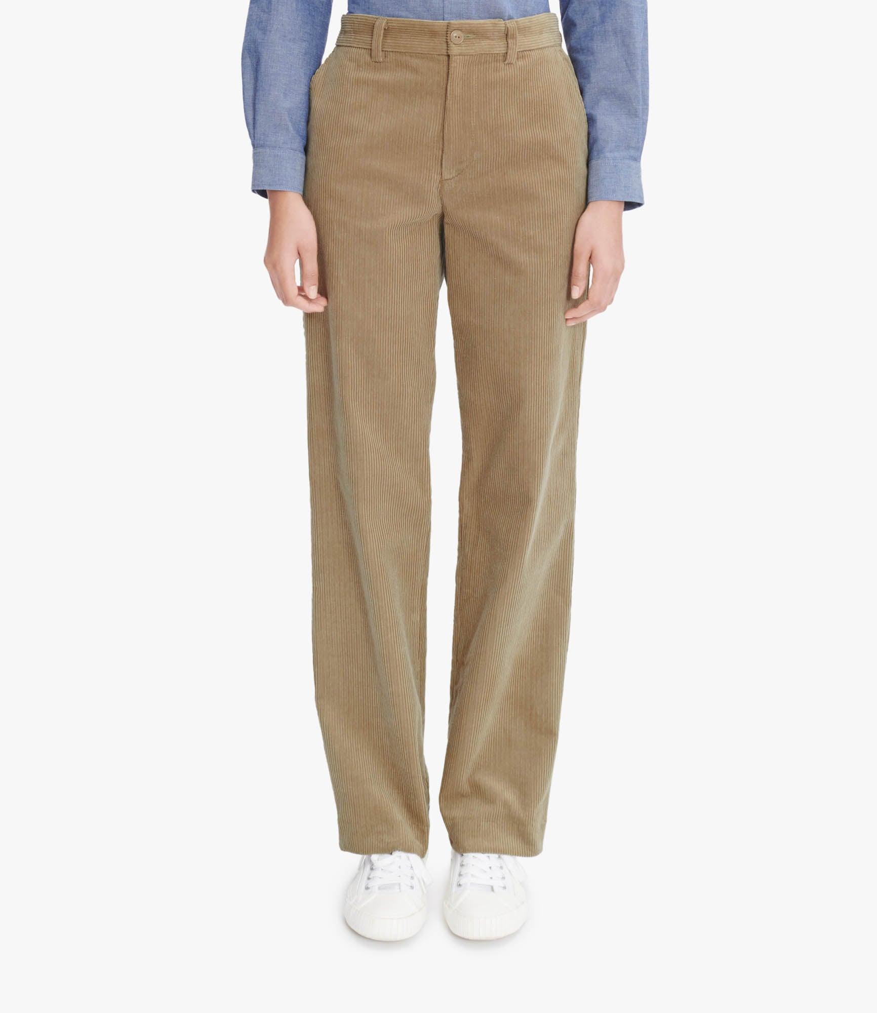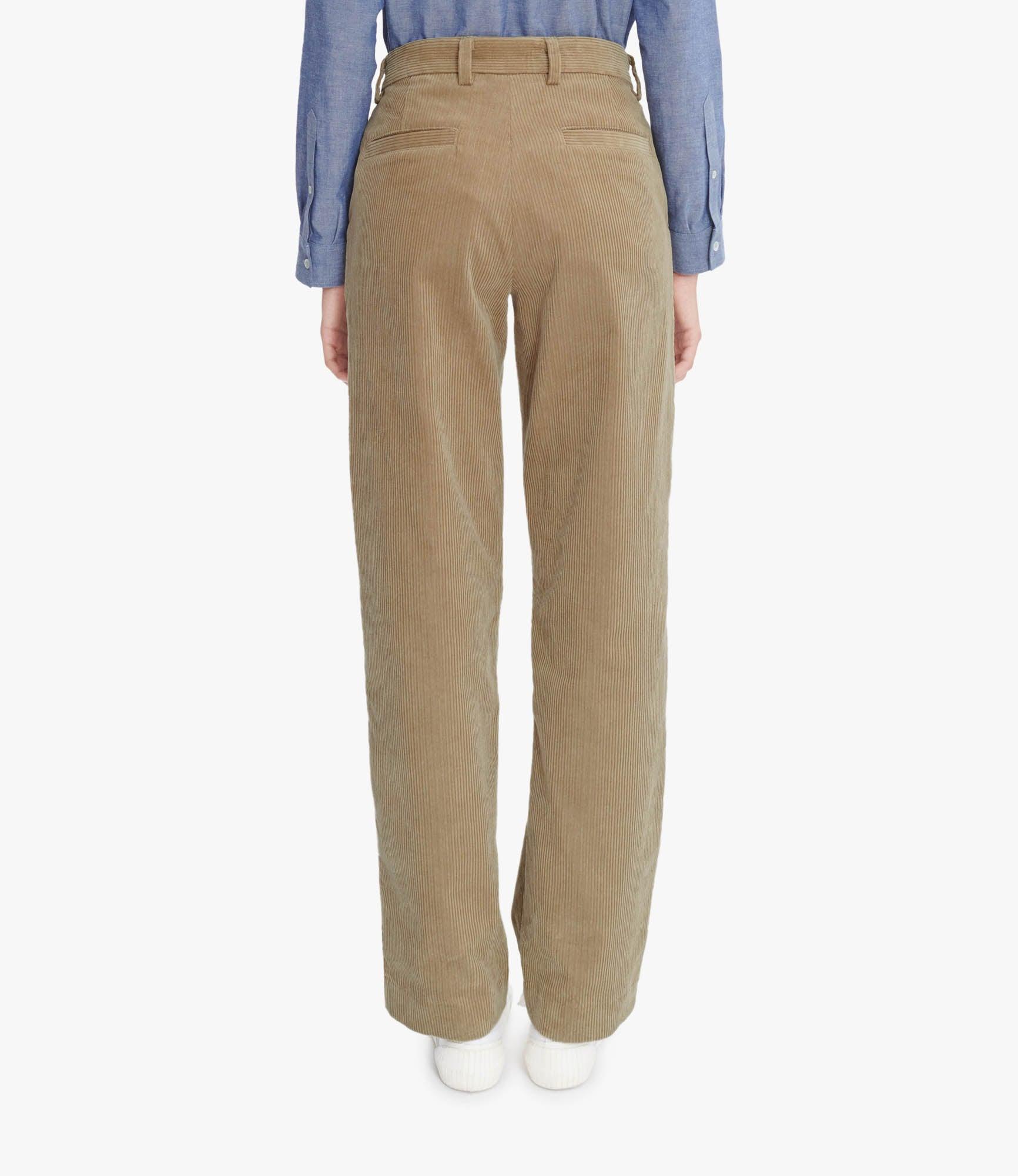 - Crisp compact material. - Mid-rise. - Straight, slightly loose leg. - Side and back pockets. - Tone-on-tone corozo buttons. - Zip fly.