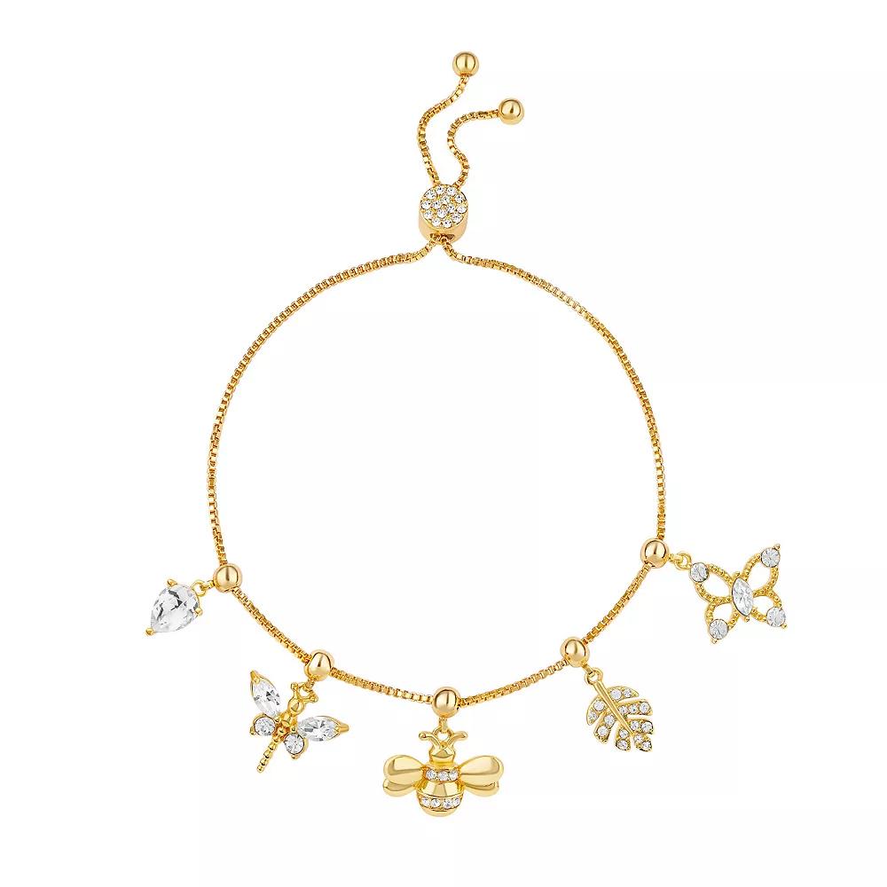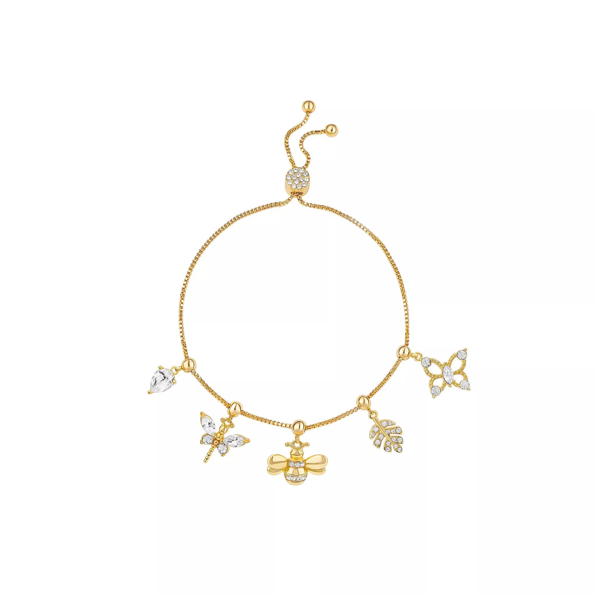A stylish look comes naturally whenever you wear this Brilliance crystal adjustable bracelet. A stylish look comes naturally whenever you wear this Brilliance crystal adjustable bracelet. Length: 10 in. Charm size: 9 mm x 7 mm (pear crystal) / 12 mm x 14 mm (dragonfly) / 11.5 mm x 14 mm (bee) / 14 mm x 8 mm (leaf) / 11 mm x 12.5 mm (butterfly) Nickel free Metal: brass Plating: 18k gold flash plated Finish: polished Crystal accents Packaging: boxed Size: 7/8. Color: White. Gender: female. Age Group: adult.