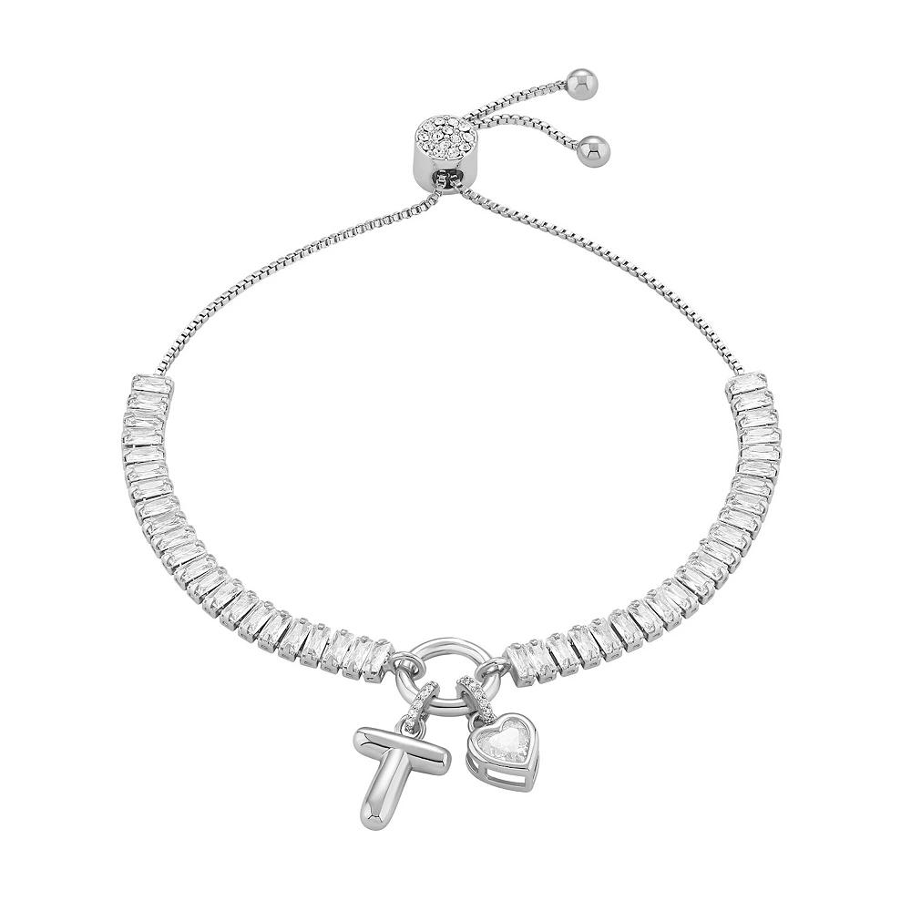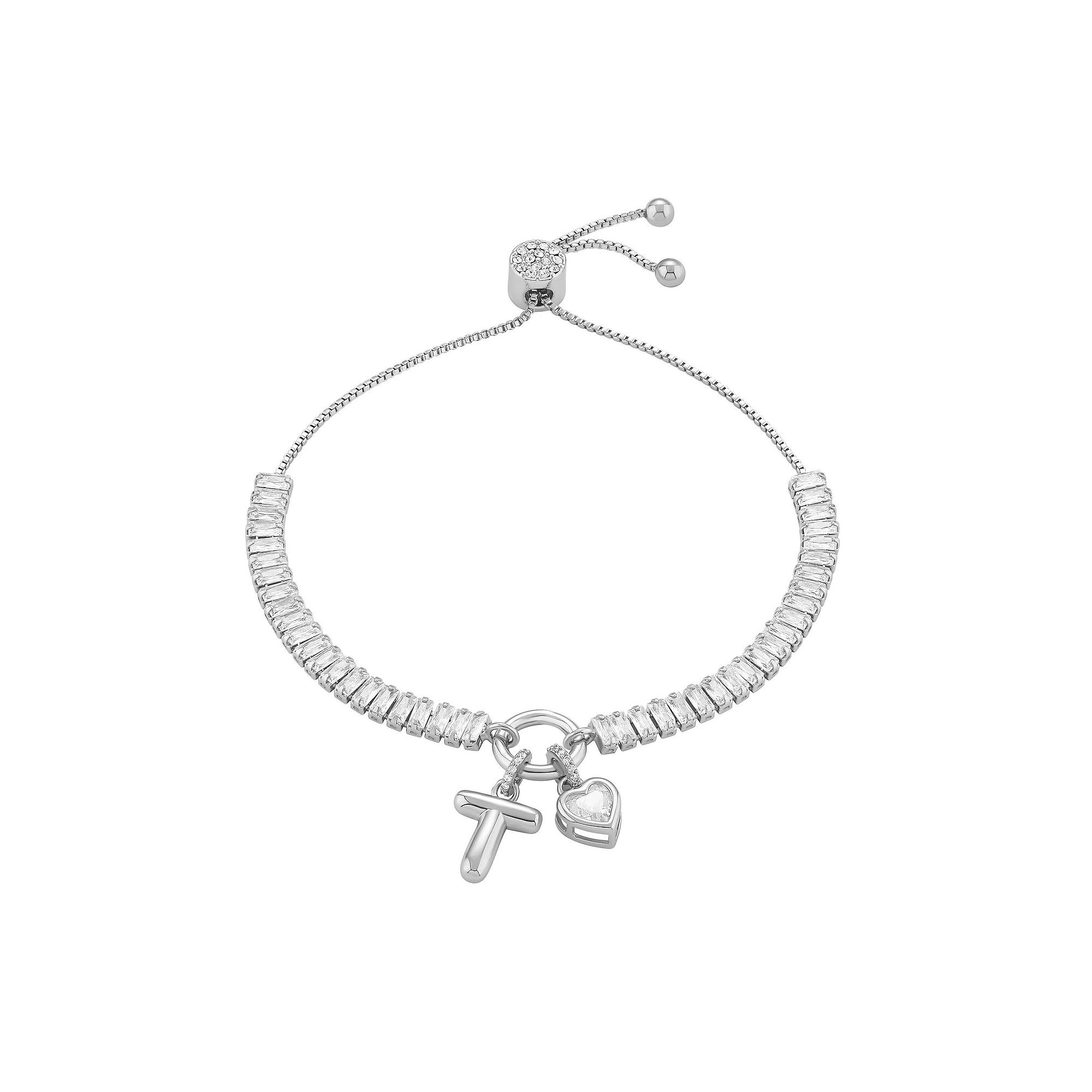 Accent your look with this Brilliance cubic zirconia heart & polished bubble initial charm adjustable bracelet. Click on this JEWELRY & WATCHES GUIDE to learn about fit, styles, materials and more! Accent your look with this Brilliance cubic zirconia heart & polished bubble initial charm adjustable bracelet. Click on this JEWELRY & WATCHES GUIDE to learn about fit, styles, materials and more! FEATURES Length: 10 in. Clasp: adjustable Nickel free Metal: brass Plating: silver tone, 18k gold flash plated Finish: polished Packaging: boxed Crystal accentSTONE DETAILS Stone type: cubic zirconia Shape: baguette cut, heart, round Setting: bezel, pave, prong Gemstones may have been treated to enhance their appearance. Special care may be required. Please visit our Gemstone Treatment & Special Care Guide for more information. Size: 4-10" ADJ. Color: Silver Tone T. Gender: female. Age Group: adult.