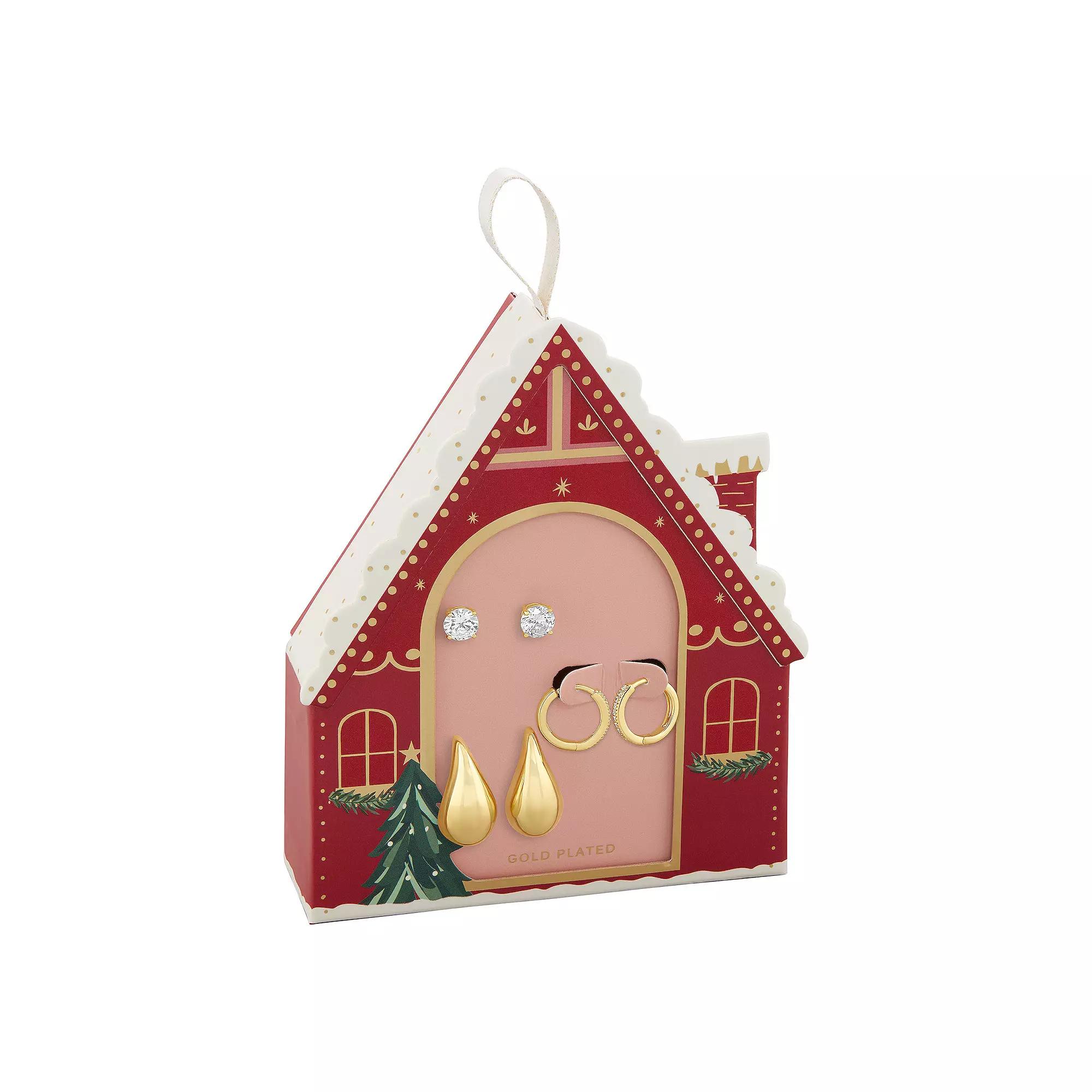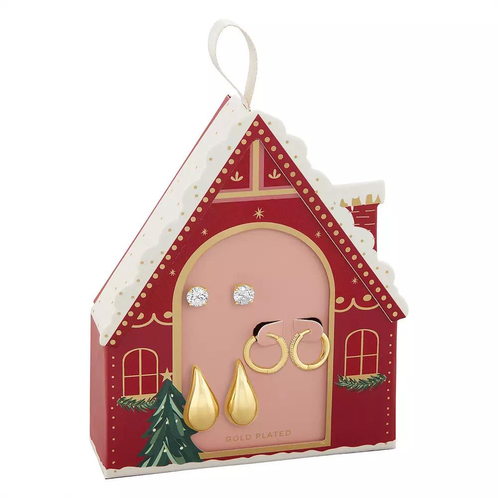 This trio of stylish Brilliance earrings in a cute gingerbread house box is the perfect gift for the jewelry lover in your life. Click on this JEWELRY & WATCHES GUIDE to learn about fit, styles, materials and more! This trio of stylish Brilliance earrings in a cute gingerbread house box is the perfect gift for the jewelry lover in your life. Click on this JEWELRY & WATCHES GUIDE to learn about fit, styles, materials and more! FEATURES Includes 3 pairs of earrings Length: 7 mm, 15.5 mm, 24 mm Backings: post, huggie Nickel free Metal: brass Finish: milgrain, polished Packaging: boxed ImportedSTONE DETAILS Stone type: cubic zirconia Total weight: 2 5/8 ct. Shape: round Setting: pave, prong Gemstones may have been treated to enhance their appearance. Special care may be required. Please visit our Gemstone Treatment & Special Care Guide for more information. Size: One Size. Color: Gold Tone White. Gender: female. Age Group: adult.