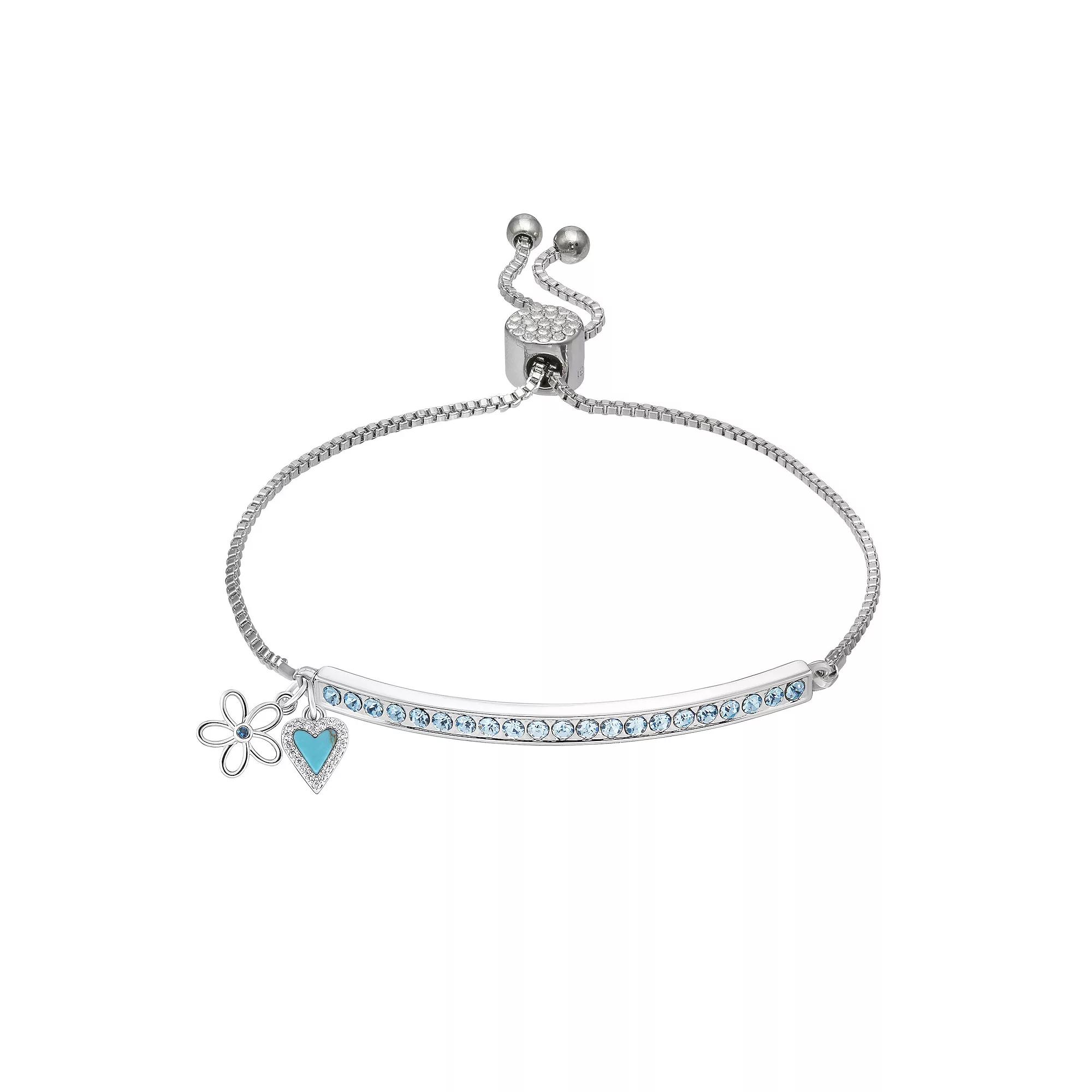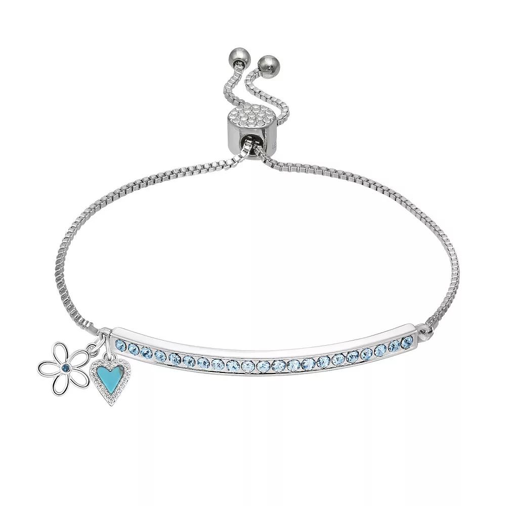 This chic Brilliance bracelet combines fine silver plating with radiant cubic zirconia and simulated turquoise stones, creating a statement piece that effortlessly elevates your look. Its adjustable design ensures a perfect fit, making it a versatile and stylish addition to your jewelry collection. Click on this JEWELRY & WATCHES GUIDE to learn about fit, styles, materials and more! This chic Brilliance bracelet combines fine silver plating with radiant cubic zirconia and simulated turquoise stones, creating a statement piece that effortlessly elevates your look. Its adjustable design ensures a perfect fit, making it a versatile and stylish addition to your jewelry collection. Click on this JEWELRY & WATCHES GUIDE to learn about fit, styles, materials and more! FEATURES Charm size: 9.5 mm x 9.5 mm / 8.5 mm x 7.5 mm Length: 10 in. Clasp: adjustable Nickel free Metal: brass Plating: silver tone Finish: polished Packaging: boxedSTONE DETAILS Stone type: crystal, cubic zirconia, simulated turquoise, nano stone Total weight: 1 1/3 ct. Shape: heart, round Setting: bezel, channel, pave Gemstones may have been treated to enhance their appearance. Special care may be required. Please visit our Gemstone Treatment & Special Care Guide for more information. Size: One Size. Color: Blue. Gender: female. Age Group: adult.
