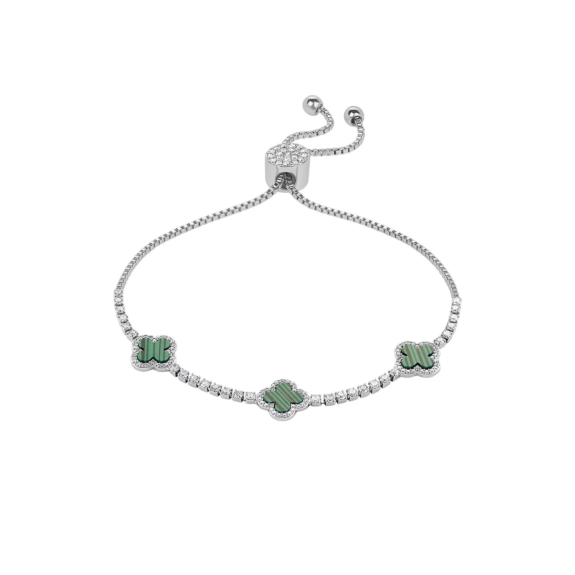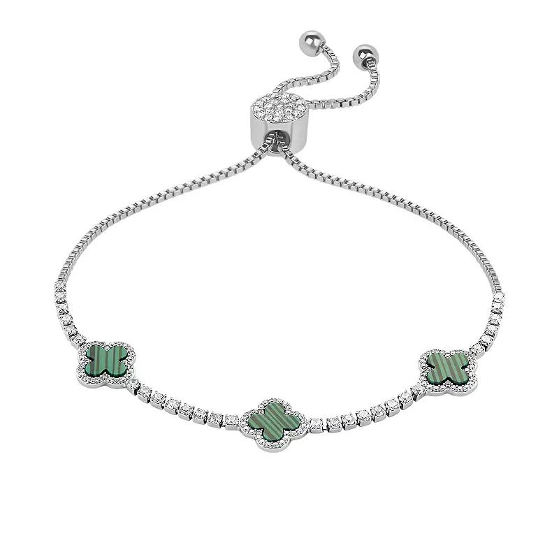 This gorgeous fine silver plated cubic zirconia and stone triple clover slider bracelet from Brilliance is sure to quickly become a favorite in any jewelry collection. Click on this JEWELRY & WATCHES GUIDE to learn about fit, styles, materials and more! This gorgeous fine silver plated cubic zirconia and stone triple clover slider bracelet from Brilliance is sure to quickly become a favorite in any jewelry collection. Click on this JEWELRY & WATCHES GUIDE to learn about fit, styles, materials and more! FEATURES Length: 10 in. Clasp: adjustable slider Nickel free Metal: brass Plating: silver tone Finish: polished Packaging: boxed ImportedSTONE DETAILS Stone type: crystal, cubic zirconia, simulated mother of pearl, simulated lapis, simulated malachite Total weight: 1 3/8 ct. Shape: round Setting: pave Gemstones may have been treated to enhance their appearance. Special care may be required. Please visit our Gemstone Treatment & Special Care Guide for more information. Size: 4-10" ADJ. Color: Silver Tone Green. Gender: female. Age Group: adult.