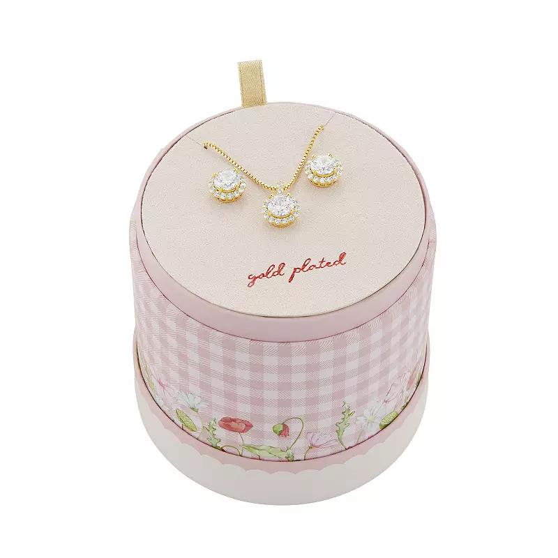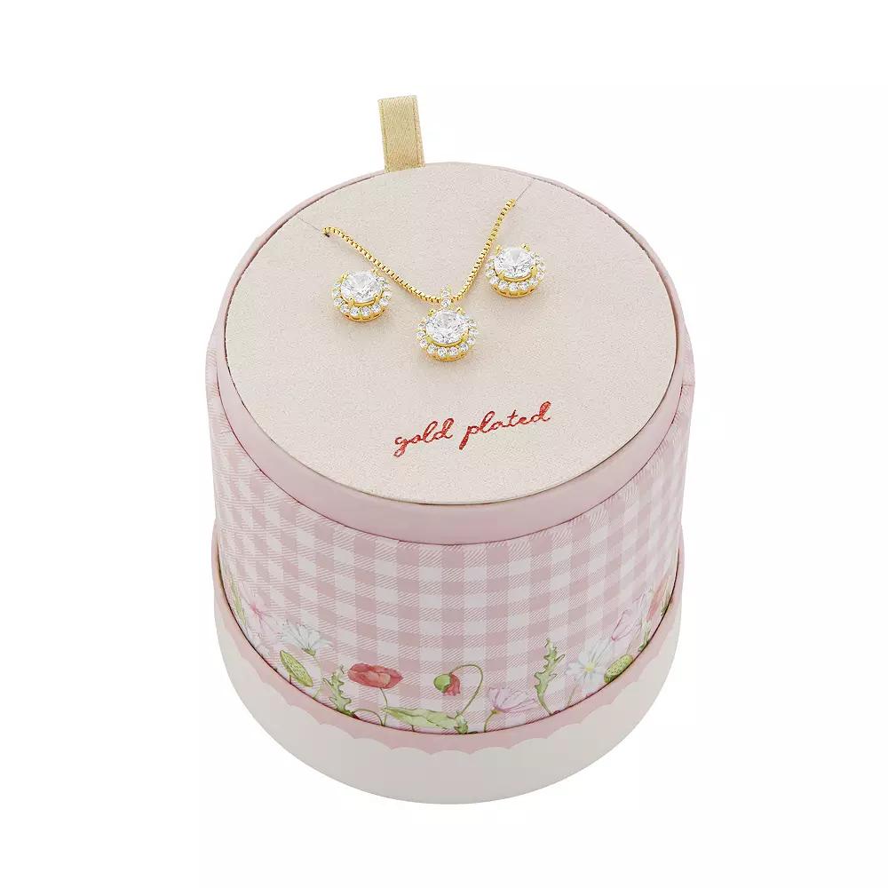 Shine effortlessly with this Brilliance fine silver-plated cubic zirconia center stone earrings and necklace set. Featuring dazzling stones in a timeless design, this set adds a refined touch to any occasion. Click on this JEWELRY & WATCHES GUIDE to learn about fit, styles, materials and more! Shine effortlessly with this Brilliance fine silver-plated cubic zirconia center stone earrings and necklace set. Featuring dazzling stones in a timeless design, this set adds a refined touch to any occasion. Click on this JEWELRY & WATCHES GUIDE to learn about fit, styles, materials and more! FEATURES Includes: 1 pair of earrings, 1 pendant & 1 chain Drop length: 0.68 in. Chain length: 18 in. Chain type: box Clasp: spring-ring Earring length: 10 mm Backings: post Nickel free Metal: brass Plating: silver tone, 18k gold flash plated Finish: polished Packaging: boxedSTONE DETAILS Stone type: cubic zirconia Total weight: 4 5/8 ct. Shape: round Setting: pave, prong Gemstones may have been treated to enhance their appearance. Special care may be required. Please visit our Gemstone Treatment & Special Care Guide for more information. Size: 18". Color: Gold Tone. Gender: female. Age Group: adult. Material: Gold Plate.